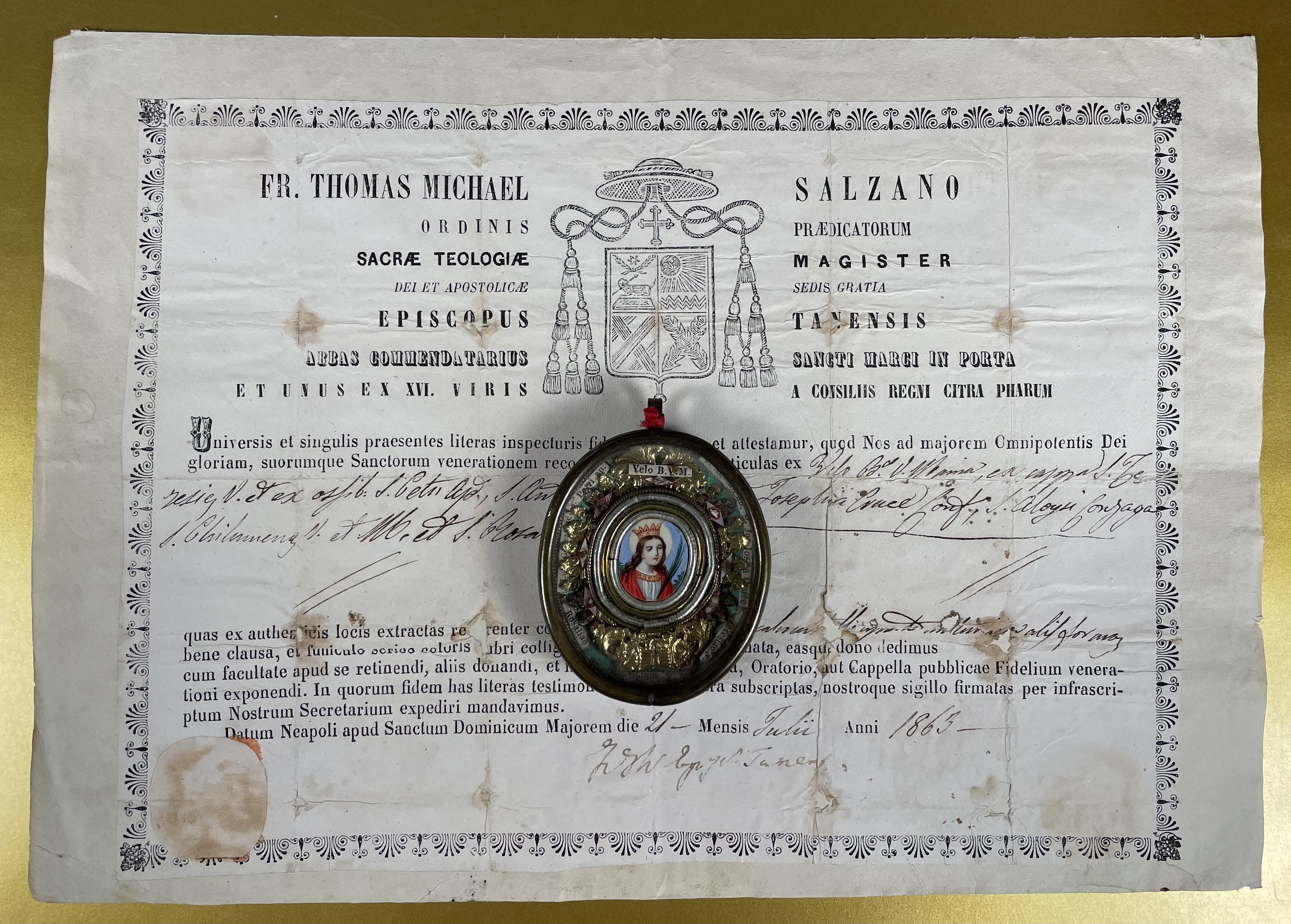 A large number of elaborate reliquaries were created during the 1860's and certified by Archbishop Fr. Tommaso Michele Salzano (†1890), Titular Bishop of Tanis and Auxiliary Bishop of Napoli (1854-1890).