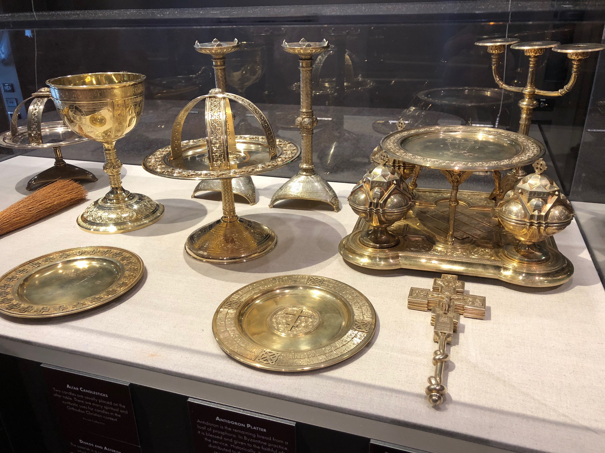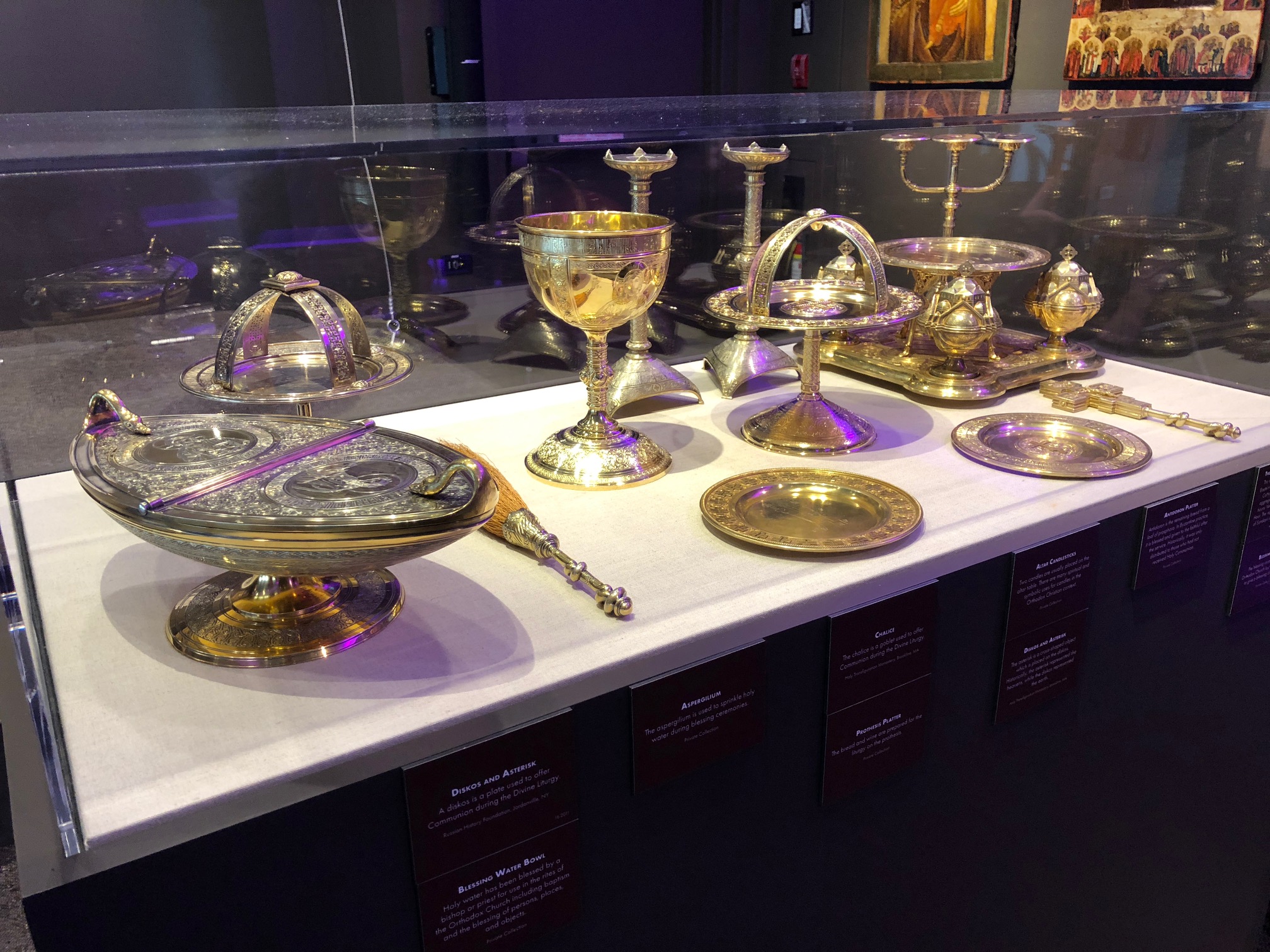 Several of the objects are used to serve the wine and host during Eucharist, including a chalice, and a discos and asterisk set, on loan from the Holy Transfiguration Monastery in Brookline, MA; as well as a discos and asterisk from the Holy Trinity Monastery in Jordanville, NY. The asterisk is a piece that fits on top of the discos to keep the priest’s veil from falling into the host. The pieces are made of a heavy gauge silver of 84 zolotniks Imperial silver purity standard (an equivalent to .875) using techniques of casting, chasing, and engraving.