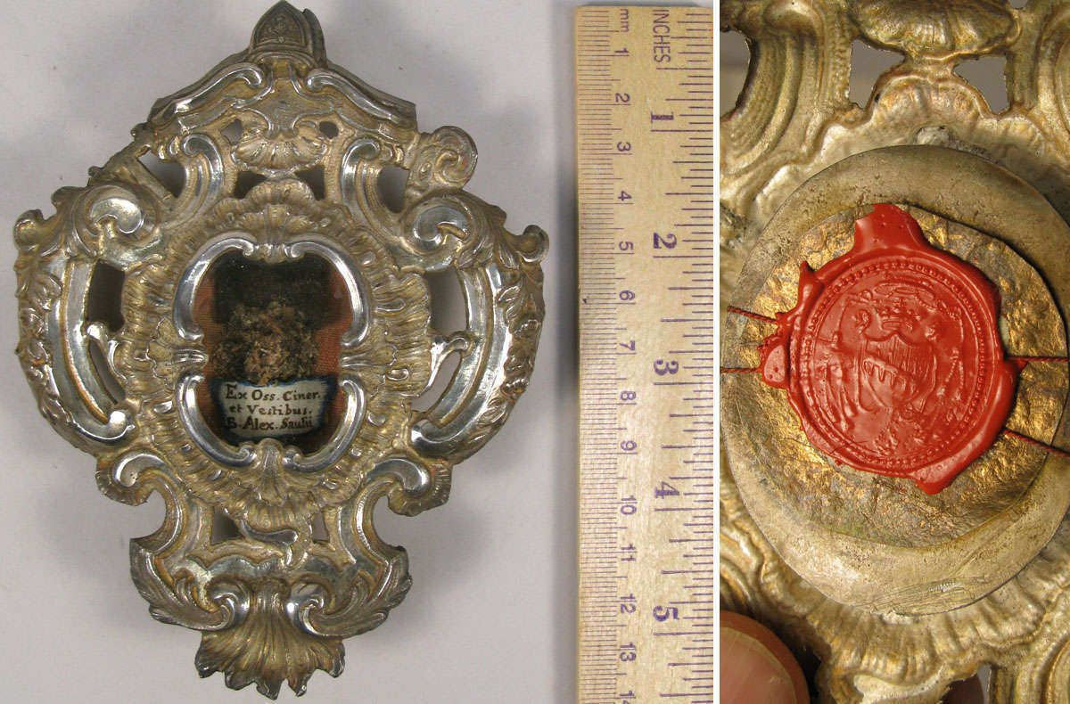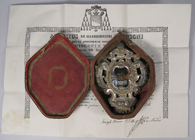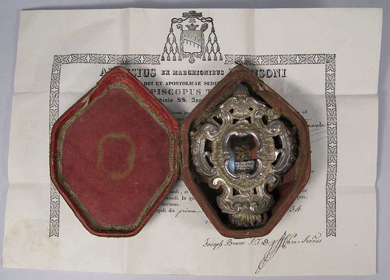 Large ornate silvered metal glass-fronted reliquary theca, containing a very significant ex ossibus (of the bone) first-class pre-canonization relic of Saint Alexander Sauli. The relic is titled in Latin on a paper cedula as Ex Oss. Ciner et Vestibus B. Alex Saulii (of the bone, bodily ashes, and clothes of the Blessed Alexander Sauli). On the back, the theca is secured by a perfectly preserved seal of red Spanish wax with a coat of arms of Luigi Fransoni († 1862), Archbishop of Turin, Italy (1832-1862). The theca is housed in original tooled leather velvet lined case and comes with the original authentics document issued by the Archbishop of Turin in 1834.