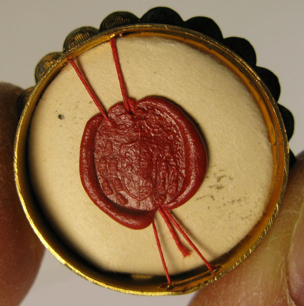 Round silver glass-fronted reliquary theca dating to 1920's housing first class ex ossibus (from the bone) relics of Blessed Stephen Bellesini. The relics are affixed to a red silk background and identified on a typographic cedula as B. Stephani Bellesini (Blessed Stephen Bellesini)On the back, under a protective cap, the theca is protected by a seal of red wax with a hardly visible imprint of a coat of arms of a Roman Catholic Church bishop.