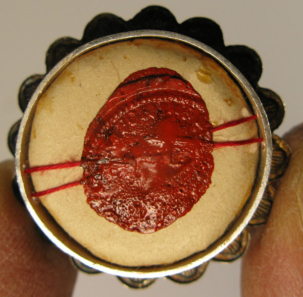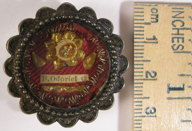 Round glass-fronted  reliquary theca dating to 1920's housing first class ex ossibus (from the bone) relics of Blessed Odoric of Pordenone. The relics are affixed to a red silk background and identified on a typographic cedula as B. Odorici C. (Blessed Odoric, Confessor)On the back, under a protective cap, the theca is protected by a seal of red wax with a hardly visible imprint of a coat of arms of the Order of Friars Minor Capuchin sealed by Fr. Anthony M. Santarelli, Postulator General of the Order in 1920's responsible for a cause for beatification and canonization through the judicial processes required by the Roman Catholic Church.