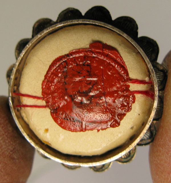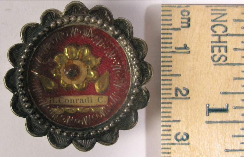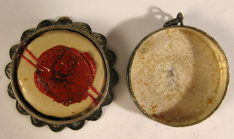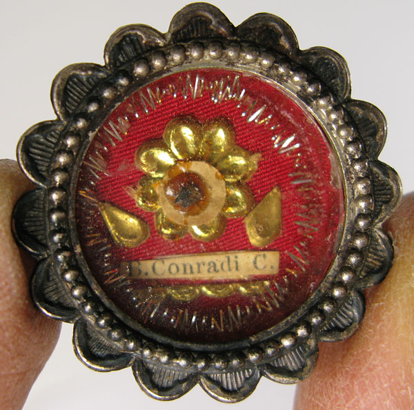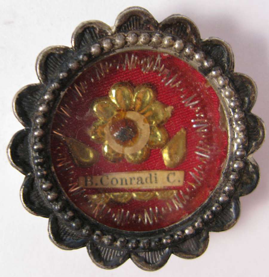 Round silver glass-fronted reliquary theca dating to 1920's housing first class ex carne (from the flesh) relics of Blessed Conrad of Ascoli. The relics are affixed to a red silk background and identified on a typographic cedula as B. Conradi C. (Blessed Conrad, Confessor). On the back, under a protective cap, the theca is protected by a seal of red wax with a hardly visible imprint of a coat of arms of the Order of Friars Minor Capuchin sealed by Fr. Anthony M. Santarelli, Postulator General of the Order in 1920's responsible for a cause for beatification and canonization through the judicial processes required by the Roman Catholic Church.
