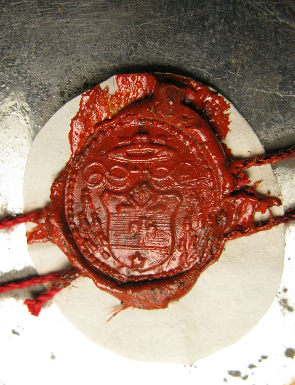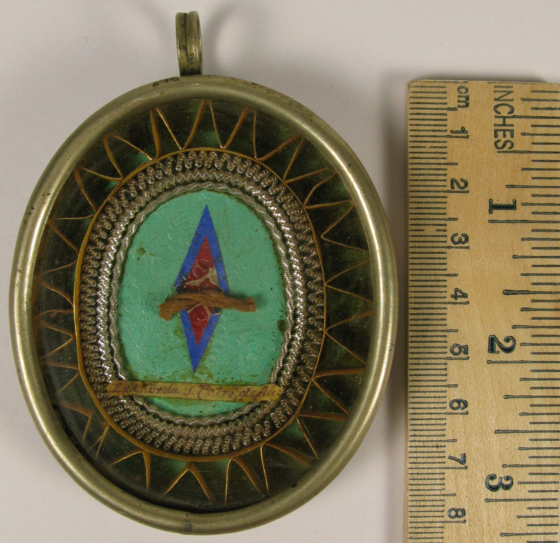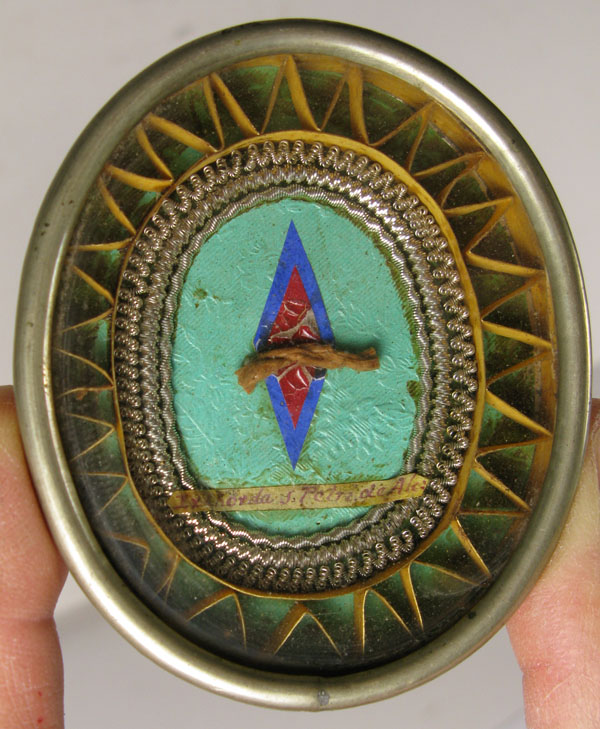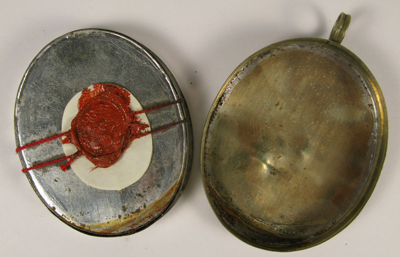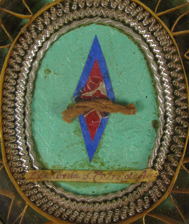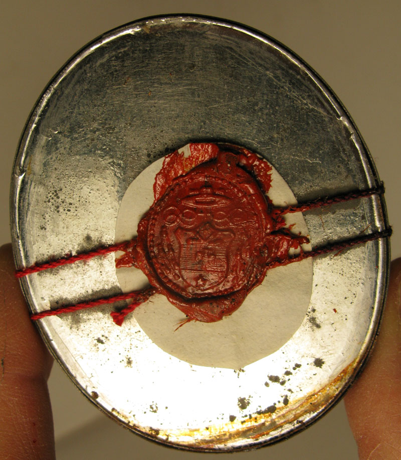 Large silvered brass reliquary theca housing very large second-class ex corda (of the rope) relic of Saint Peter of Alcantara. The relic is affixed to a diamond piece of paper placed on light blue background, surrounded by paperolle and silver cord ornamentation and identified on a manuscript cedula label as Ex Corde S. Peter de Alc. (from the rope of St. Peter of Alcantara). On the back, under the protective cap, the theca is secured with perfectly preserved seal of red Spanish wax bearing an imprint of a coat of arms of unidentified Catholic Bishop.