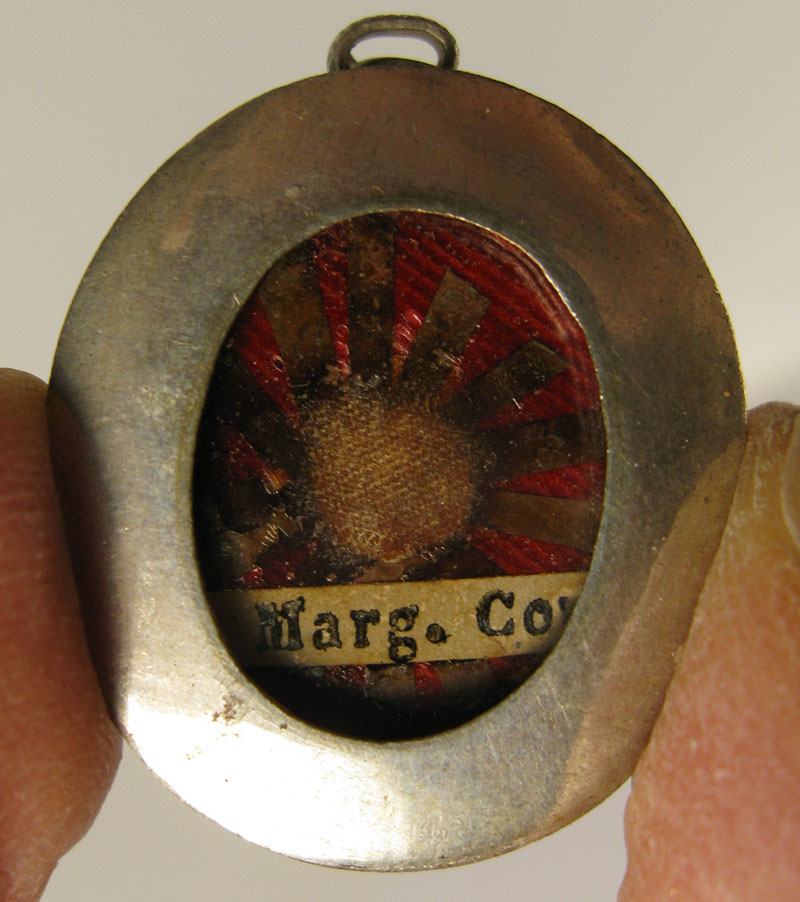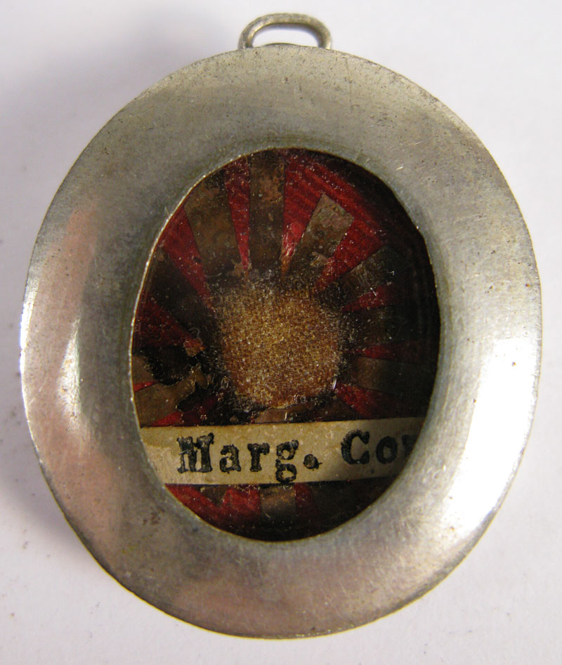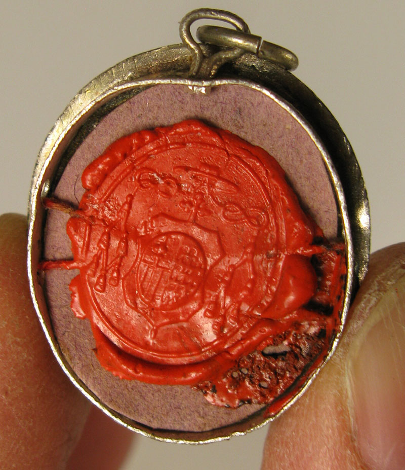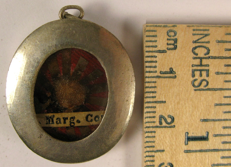 Small oval glass-fronted silver reliquary theca housing precious relics of Saint Margaret of Cortona. The relic is affixed to a starburst shaped paper on a red silk background and identified in typographic cedula label as S. Marg. Cort.. On the back, under protective cap, the theca is secured with a seal of red Spanish wax with perfectly preserved coat of arms of unidentified Catholic Bishop.