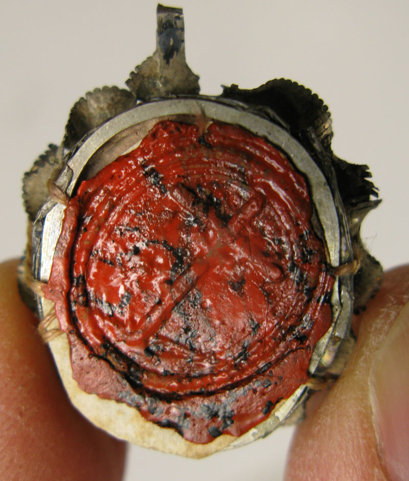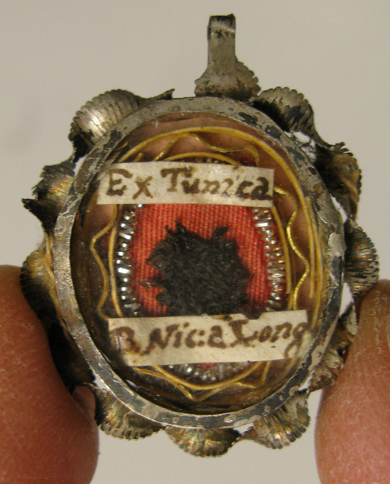 18th century oval glass-fronted silver reliquary theca housing second-calss ex tunica (from the shirt ) pre-canonization relic of Saint Nicola Saggio. The relic is affixed to a red silk background, surrounded by golden paperolle and silver cord ornamentation and identified in manuscript cedula label as Ex Tunica / S. Nica Long (Of the shirt of Blessed Nicola of Longobardi). On the back the theca is secured with a seal of red Spanish wax with coat of arms of the Order of Minims.