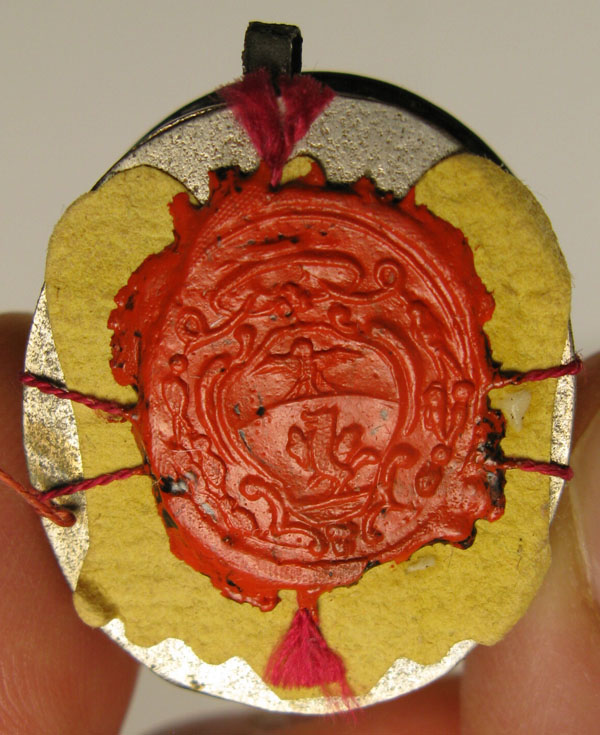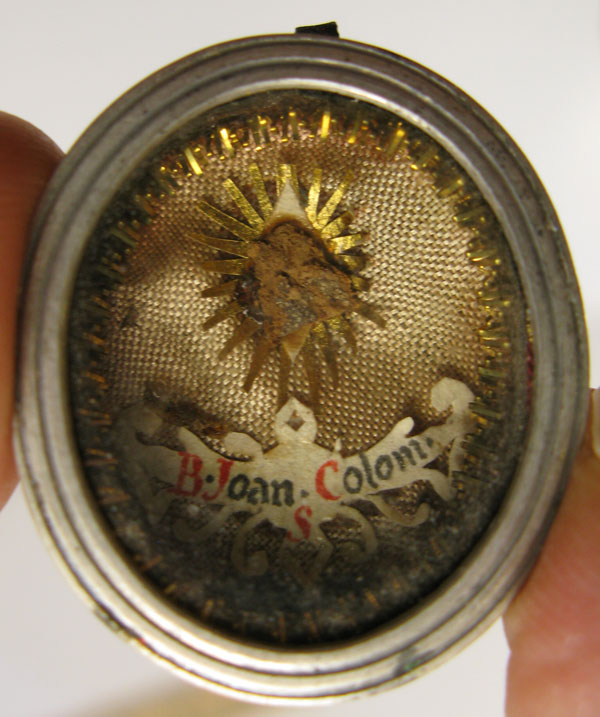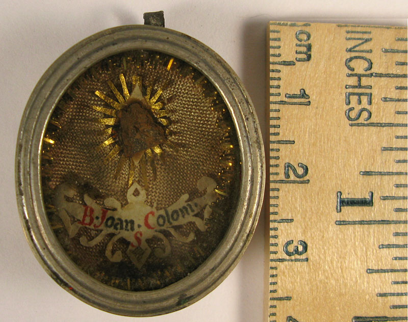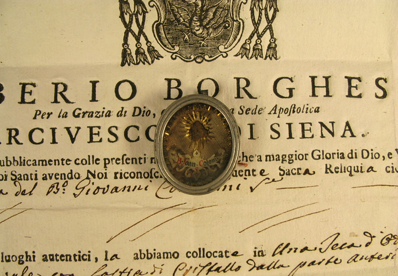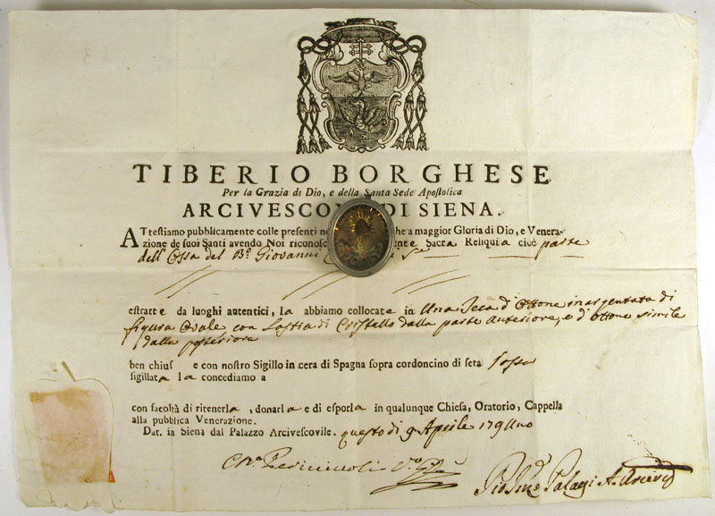 Oval glass-fronted silver reliquary theca housing significant first class ex ossibus  (from the bone) relic of the Blessed Giovanni Colombini The relic is affixed to a silk background decorated by gilt paperolle and silver cord ornamentation and identified on a fancy bi-color manuscript cedula as B. Joan, Colom, S. (Blessed Giovanni Colombini of Siena). On the back, the theca is secured with perfectly preserved seal of red Spanish wax bearing an imprint of a coat of arms of Tiberio Borghese (†1792), Archbishop of Siena (1772-1792). It is accompanied by original matching authentics document issued and hand signed by Fr. Borghese in 1791.