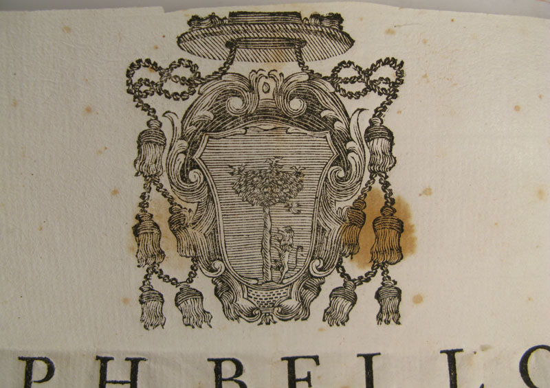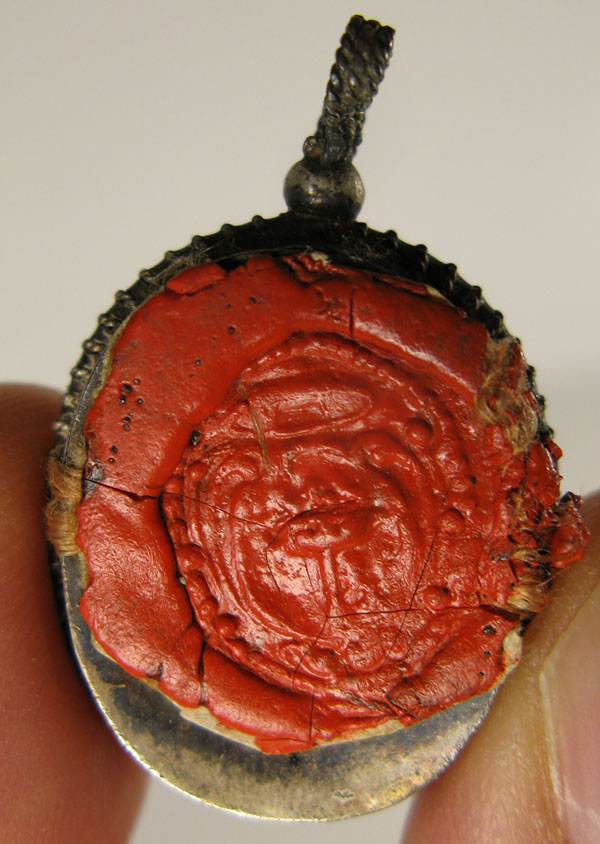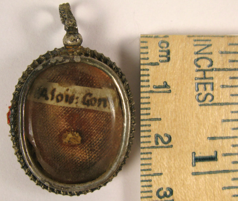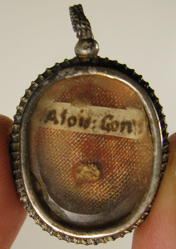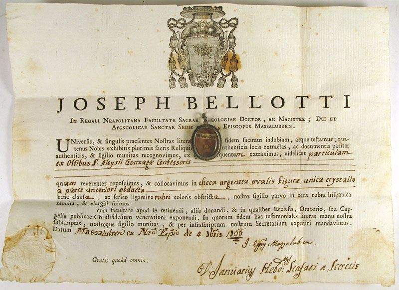 Small oval crystal-fronted silver reliquary theca housing ex ossibus (of the bone) relic of Saint Aloysius Gonzaga.The relic is affixed to red silk background and identified on a manuscript cedulae as S. Alois. Gonz. On the back, the theca is secured with perfectly preserved seal of red Spanish wax bearing an imprint of a coat of arms of Fr. GiuseppeBellotti (†), Bishop of Massa Lubrense (1756-1788). It is accompanied by the original matching authentics document issued by Fr. Bellotti in 1766.