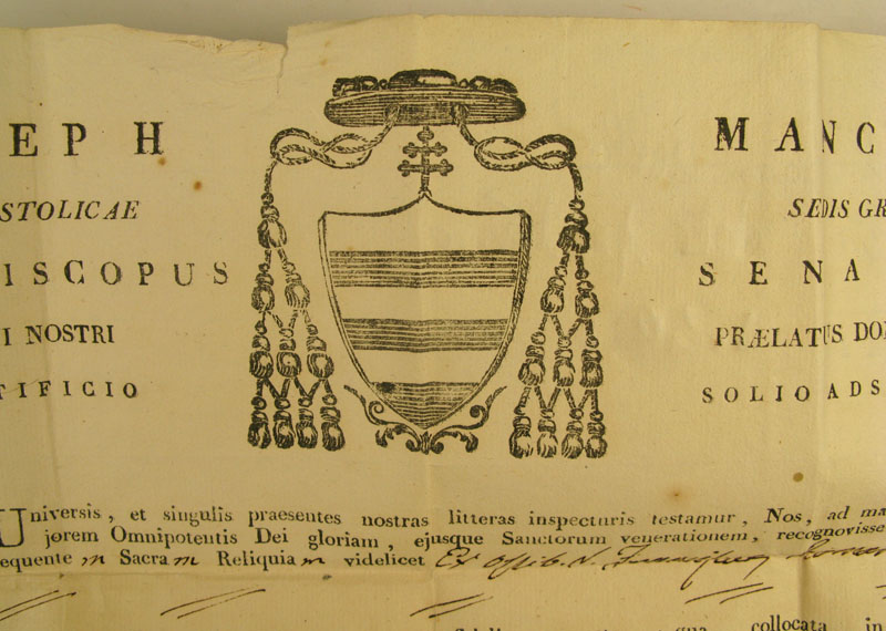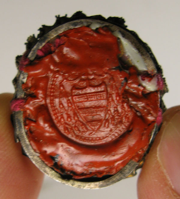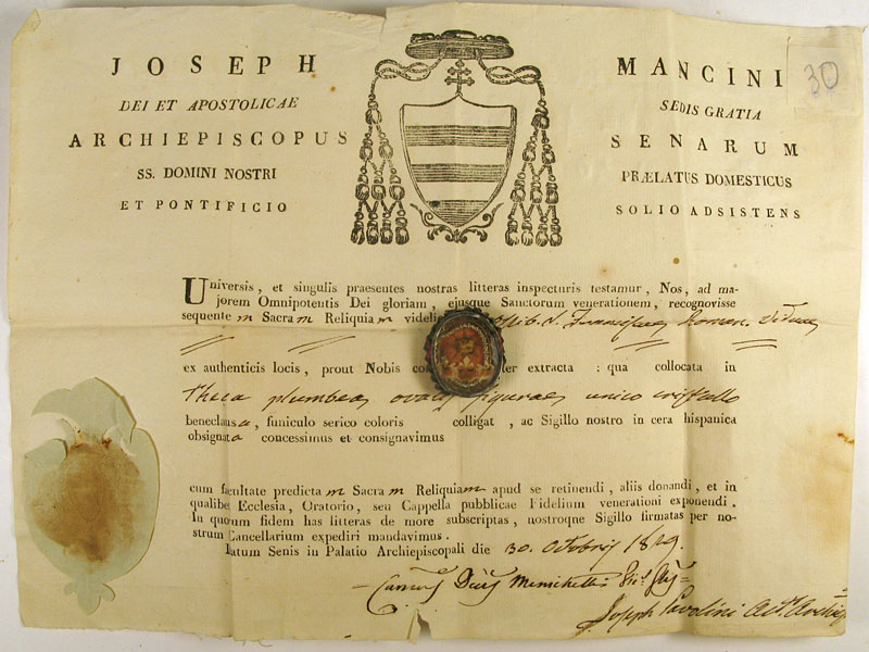 19th century oval glass-fronted silver reliquary theca housing substantial first-class ex ossibus  (of the bone) relic of Saint Frances of Rome Obl. S. B.The relic is affixed to a red silk background decorated with gilt paperole and silver cord and identified on a manuscript cedulae as S. Franciscae Roma. On the back, the theca is secured with perfectly preserved seal of red Spanish wax bearing an imprint of a coat of arms of Fr. Giuseppe Mancini (†1855), Archbishop of Siena (1824-1855). It is accompanied by original matching authentics document issued and hand-signed by Mgr. Mancini in 1829.