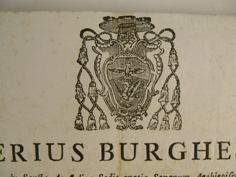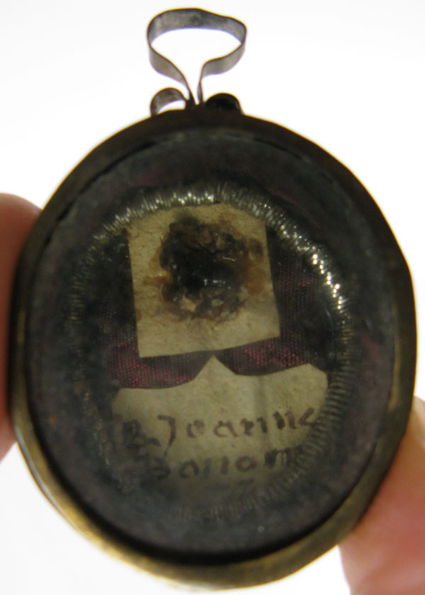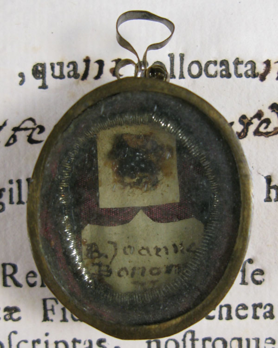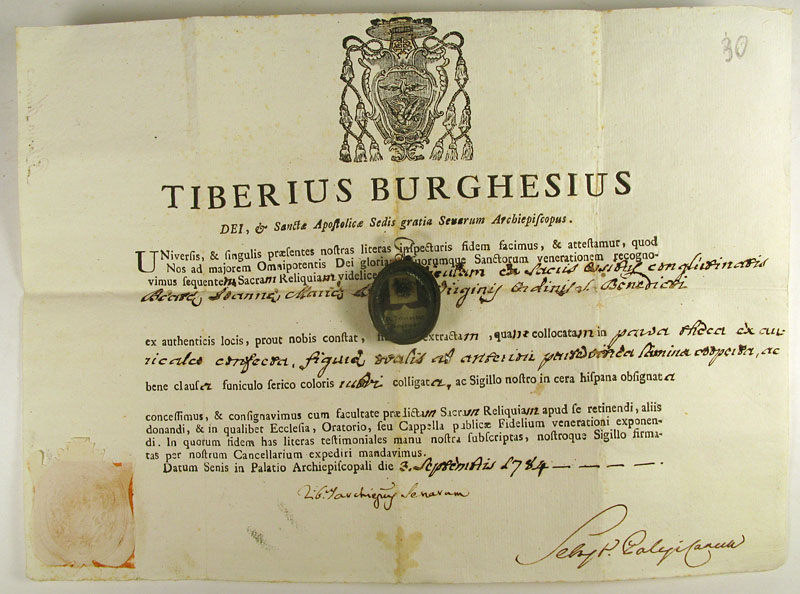 18th century oval glass-fronted reliquary theca housing first-class ex ossibus (of the bone) relics of the Blessed Giovanna Maria Bonomo. The relic is affixed to a red silk background decorated with silver cord and identified on a manuscript cedula label as B. Joanna Bonon. V. (Blessed Giovana Bonomo, Virgin). On the back, the theca is secured with perfectly preserved seal of red Spanish wax bearing an imprint of a coat of arms of Fr. Tiberio Borghese (†1792), Archbishop of Siena (1772-1792). It is accompanied by original matching authentics document issued by Fr. Borghese in 1784, only one year after she was beatified by Pope Pius VI.