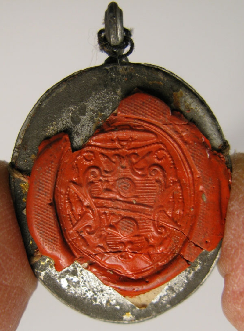 Oval glass-fronted reliquary theca housing first class ex ossibus (from the bone) relics of St Andrew of Avellino. The relics are affixed to a silk background, surrounded by gilt paperoles and identified on a paper cedula label as Ex Oss. S. Andrew Avel. (from the bone of St. Andrew of Avellino). On the back, the theca is protected by a seal of red wax with a perfectly preserved imprint of a coat of arms of a Roman Catholic Bishop.