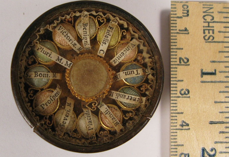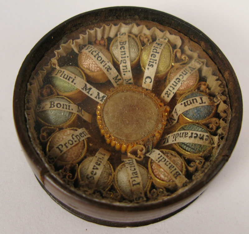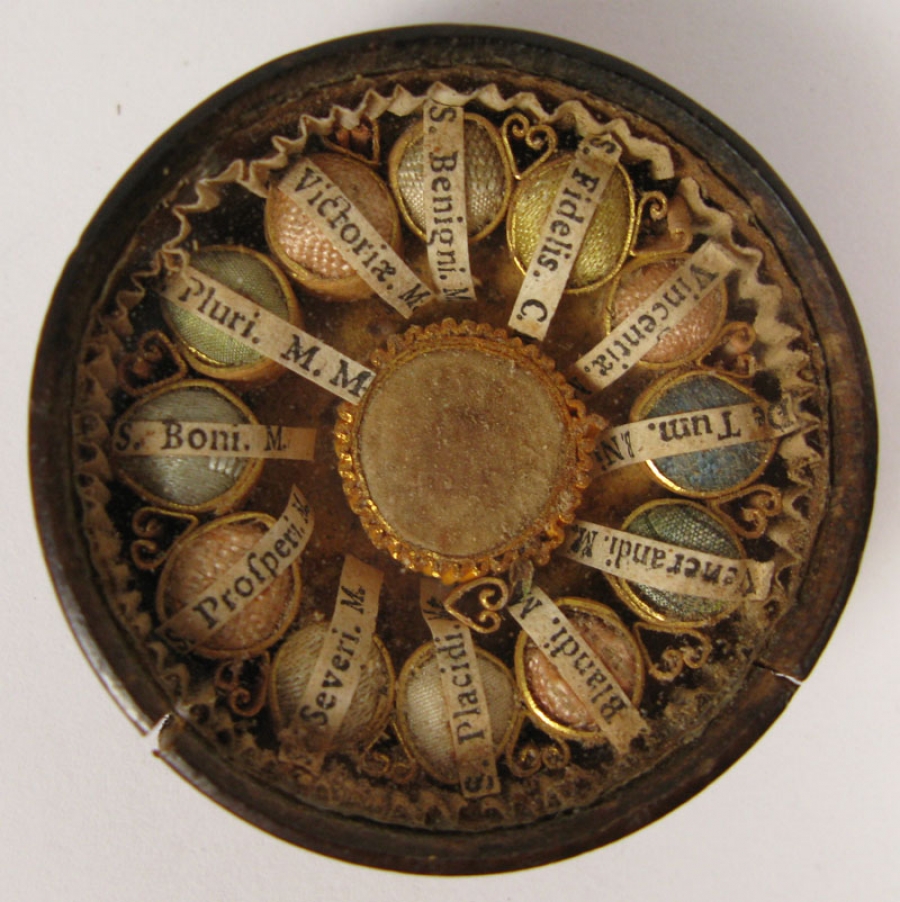 Belgian wooden round glass-fronted reliquary theca housing relics of twelve saints: Saint Blandina Martyr, Saint Placidus Martyr, Saint Severinus of Gaul Martyr, Saint Prosper Martyr, Saint Boniface Martyr, Saint Victoria Martyr, Saint Venera Martyr, Saint Benignus Martyr, Saint Fidelis of Sigmaringen, Saint Vincentia Martyr, and other Martyrs. The relics are wrapped into balls of silk in different colors and identified in typographic cedulae labels. The relics are affixed on the perimeter of the theca, decorated with intricated gilt paperolle ornamentation and centered around a small disk of a Sacramental wax.