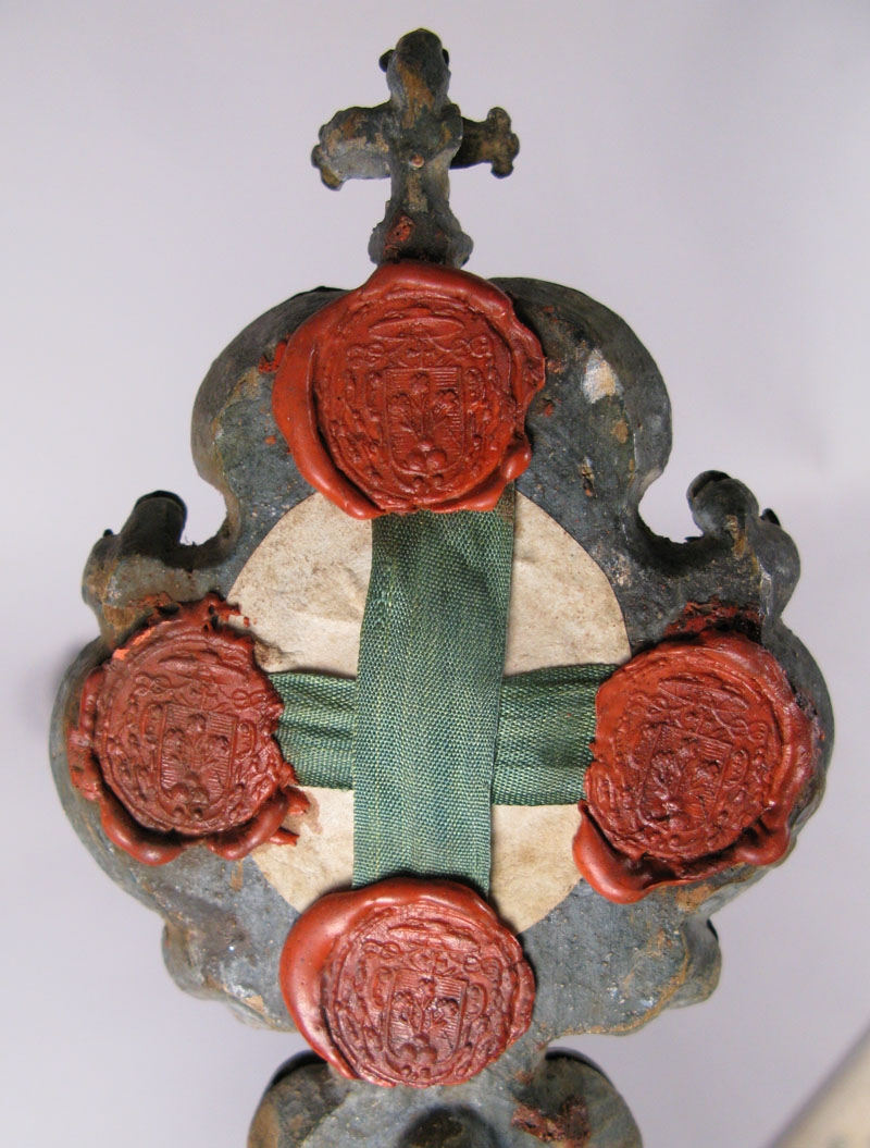Titulus Crucis (Latin for "Title of the Cross") is a piece of wood claimed in to be a relic of the True Cross, kept in the church of Santa Croce in Gerusalemme in Rome. Christian tradition holds that the relic is part of the cross's titulus (inscription). The Church of Santa Croce in Gerusalemme was built about AD 325 by Saint Helena (the mother of Emperor Constantine the Great) after her pilgrimage to the Holy Land, during which she reportedly located the True Cross and many other relics which she gave to the new church. The Titulus Crucis is alleged to have been among these relics. At the time of Egeria's pilgrimage to Jerusalem in 383 a "title" (titulus) was shown as one of the relics at Jerusalem: "A silver-gilt casket is brought in which is the holy wood of the Cross. The casket is opened and (the wood) is taken out, and both the wood of the Cross and the title are placed upon the table." The 6th-century pilgrim Antoninus of Piacenza describes a titulus in Jerusalem and its inscription: it said Hic est rex Iudaeorum ("Here is the king of the Jews"), while the one kept in Rome shows Iesus Nazarenus Rex Iudaeorum("Jesus the Nazarene King of the Jews"). Sometime before 1145 the relic was placed in a box which has the seal of Cardinal Gherardo Caccianemici dal Orso, raised to the cardinalate in 1124 as a cardinal priest of this church, who became Pope in 1144, as Lucius II, thus dating the seal. It was apparently forgotten until February 1, 1492, when it was discovered by workmen restoring a mosaic, hidden behind a brick with the inscription Titulus Crucis.
