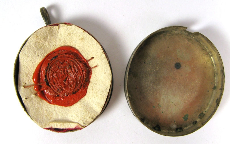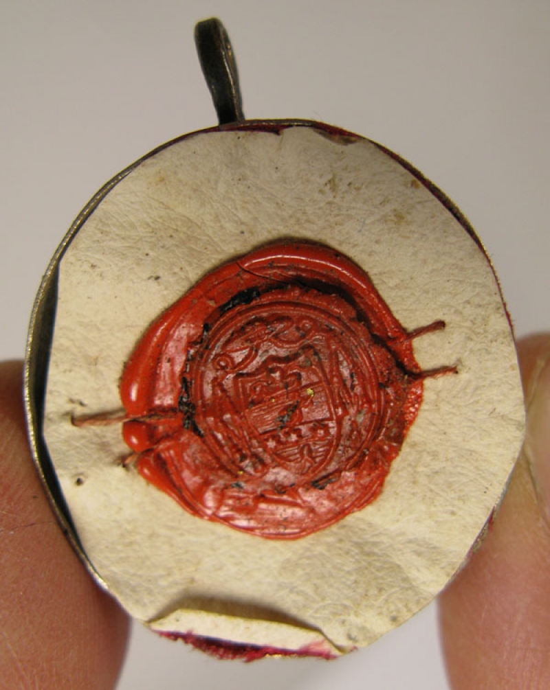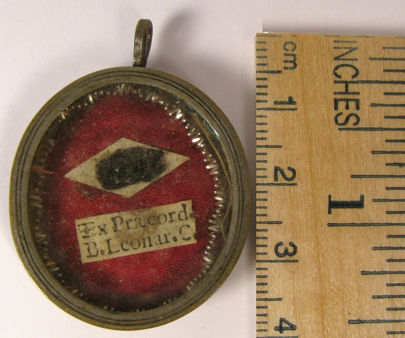 Round glass-fronted silvered brass reliquary theca housing substantial first-class ex praecordis (of the inner organs) pre-canonization relic of Saint Leonard of Port Maurice. The relic is centered on a red silk background and identified on a typographic cedula label as Ex Praecord. / B. Leonar. C. (of the inner organs of the Blessed Leonard, Confessor). On the back, under a protective cap, the theca is secured by a perfectly preserved seal of red Spanish wax with a clear imprint of a coat of arms of an unidentified Roman Catholic bishop.