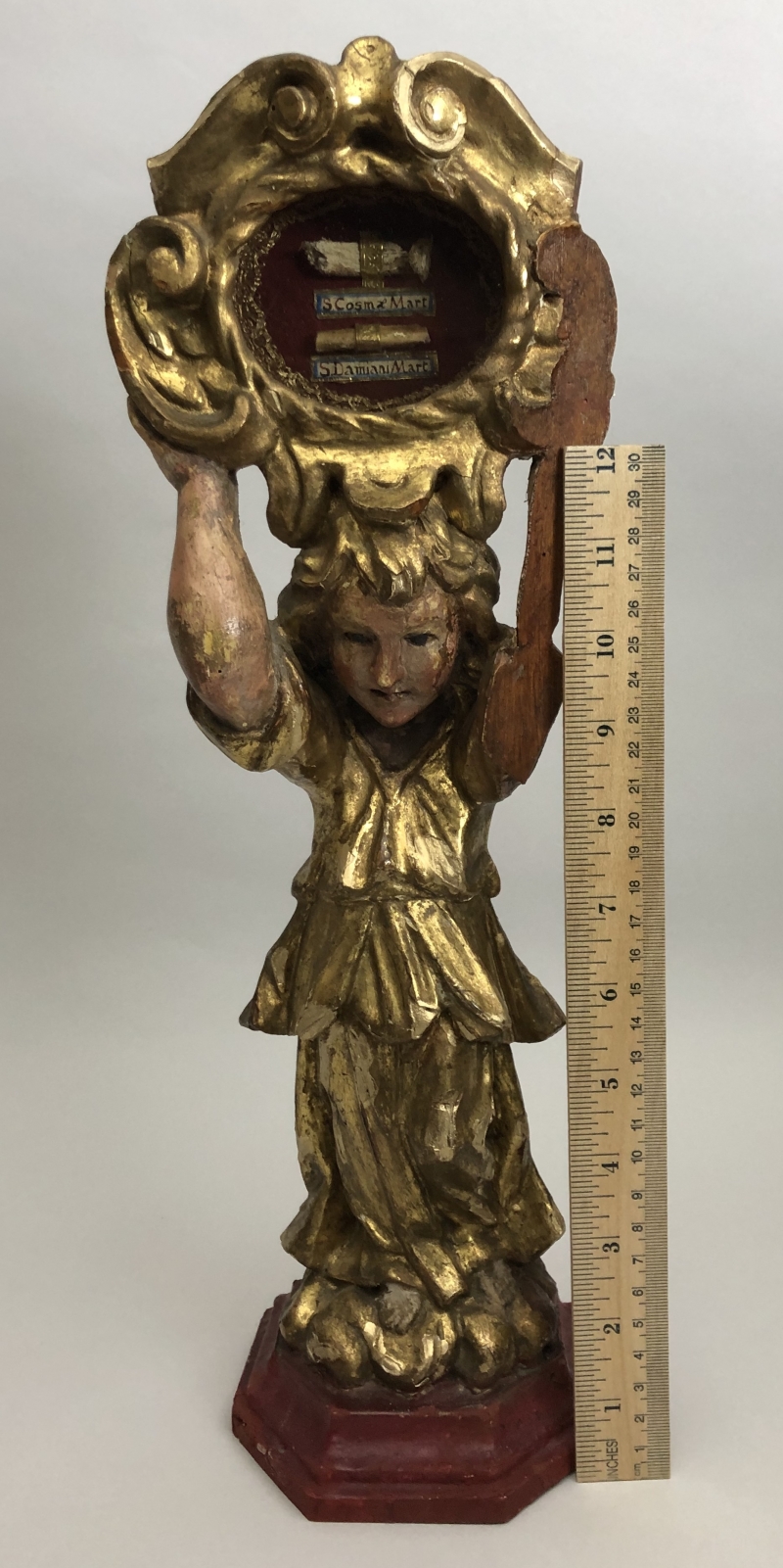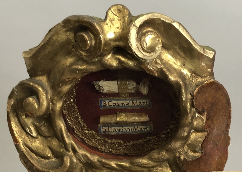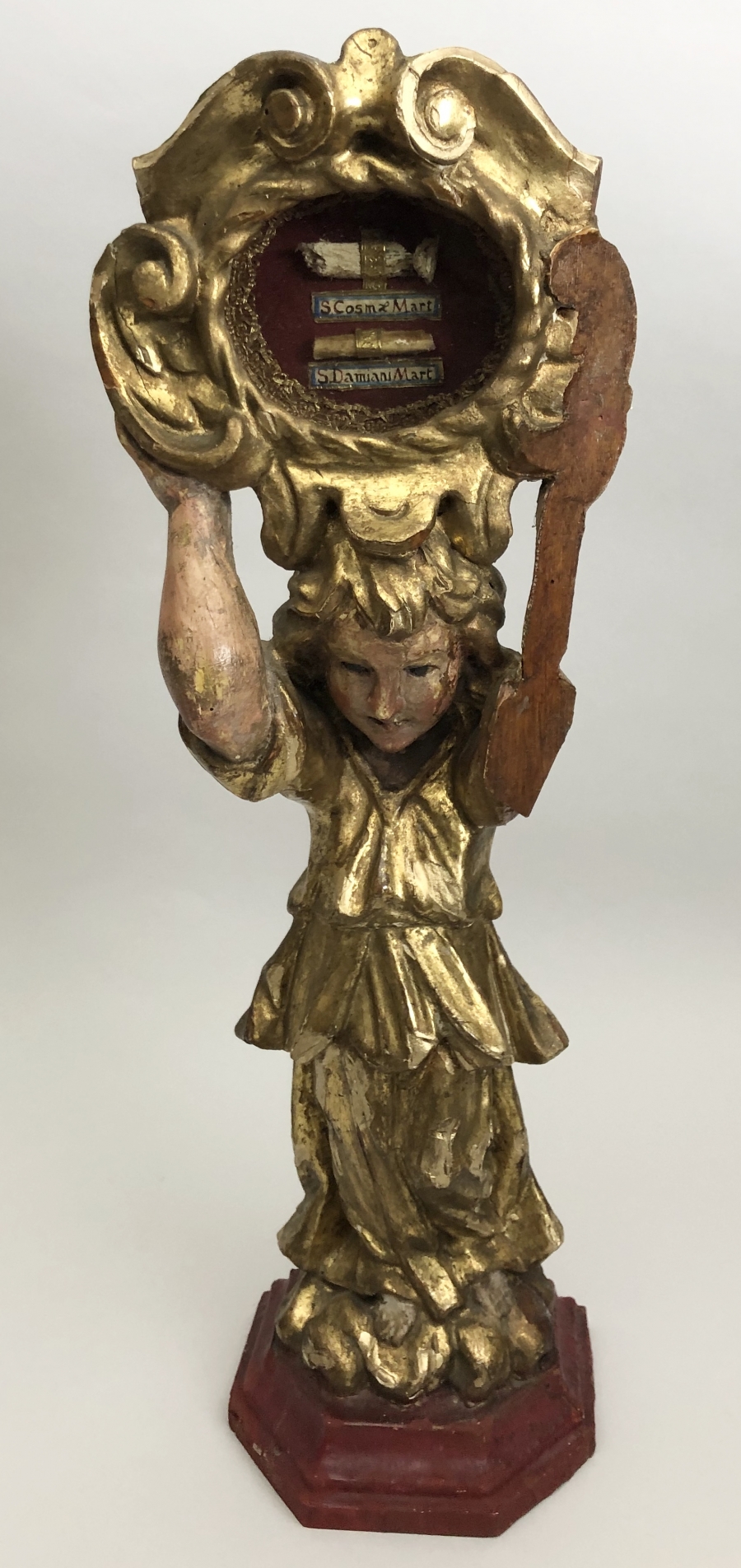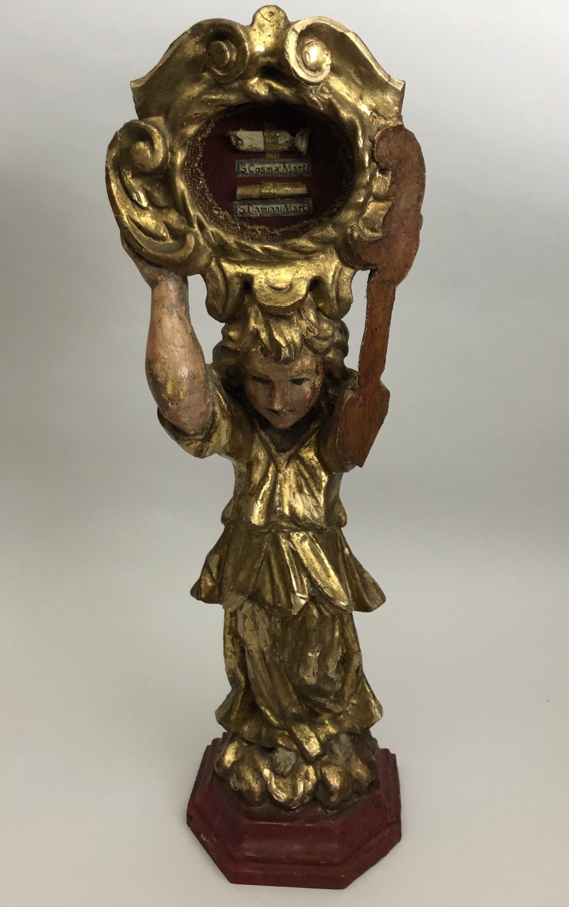 18th-century angel-form reliquary made of painted and gilded wood with front glass panel housing significant first-class ex ossibus (of the bone) relics of two Unmercenary healers: Saints Cosmas and Damian. The relics are affixed to a red silk background and identified on paper cedulae labels as S. Cosmae Mart. / S Damiani Mart. (Saint Cosmas Martyr / Saint Damian Martyr). On the back, the reliquary is protected by a crisscrossed silk ribbon held in place by four seals of red Spanish wax with clear imprints of a coat of arms of an unidentified Catholic Bishop. The reliquary has damage on the left side where the arm is partially missing.