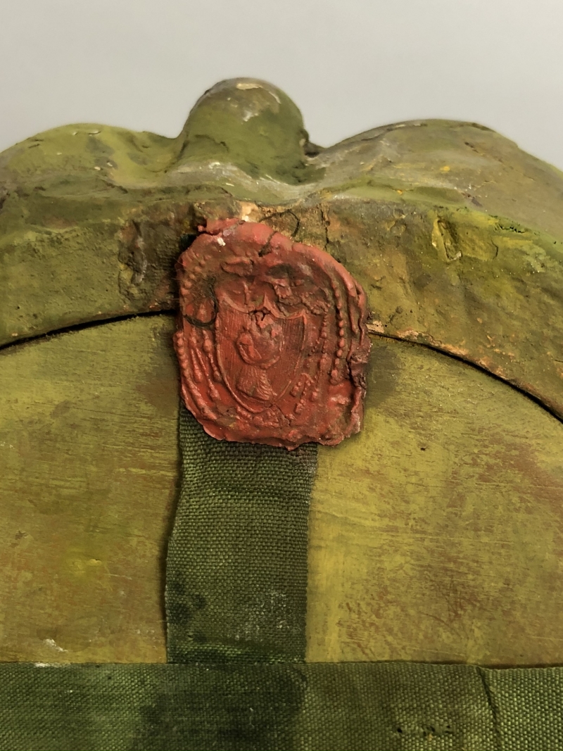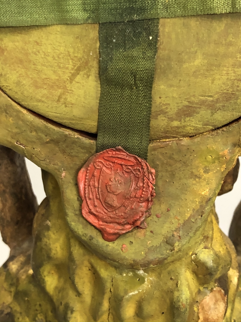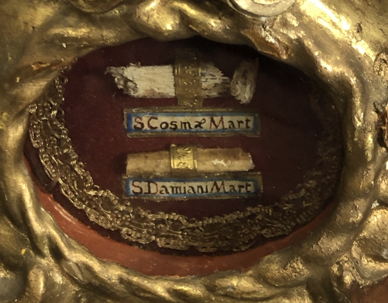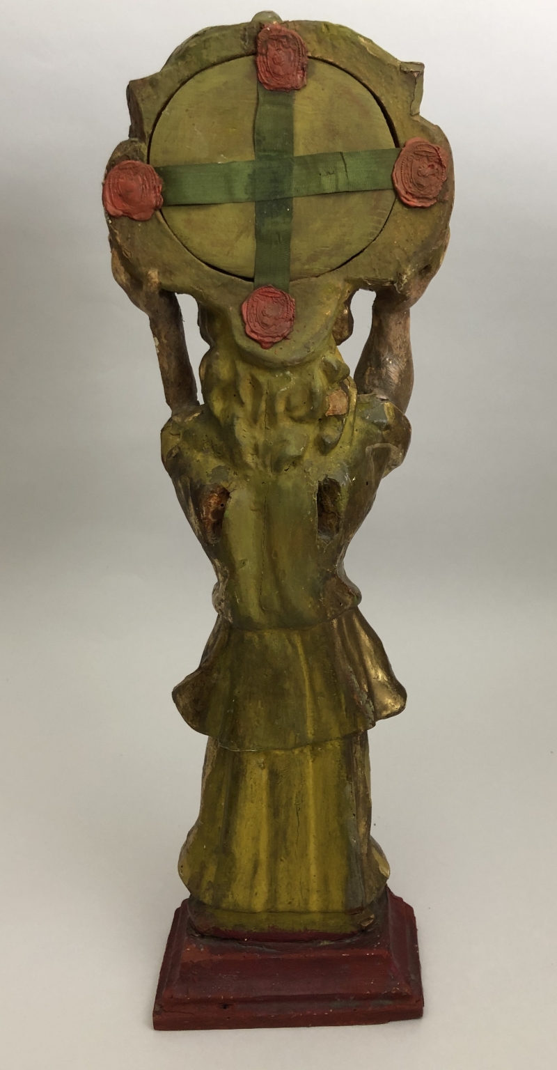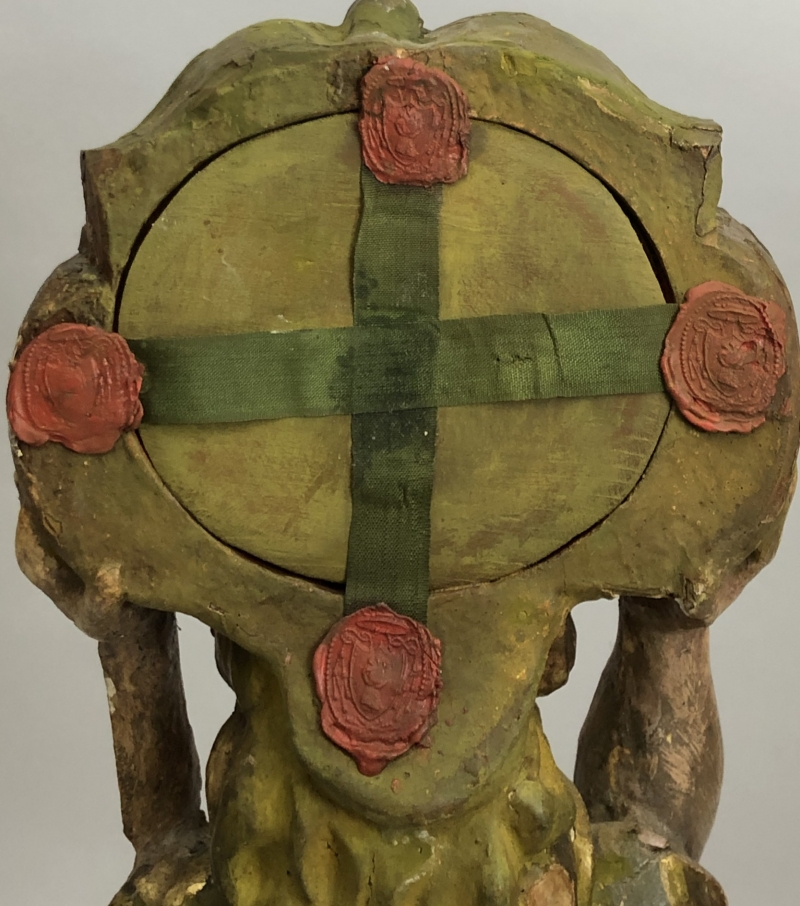 18th-century angel-form reliquary made of painted and gilded wood with front glass panel housing significant first-class ex ossibus (of the bone) relics of two Unmercenary healers: Saints Cosmas and Damian. The relics are affixed to a red silk background and identified on paper cedulae labels as S. Cosmae Mart. / S Damiani Mart. (Saint Cosmas Martyr / Saint Damian Martyr). On the back, the reliquary is protected by a crisscrossed silk ribbon held in place by four seals of red Spanish wax with clear imprints of a coat of arms of an unidentified Catholic Bishop. The reliquary has damage on the left side where the arm is partially missing.