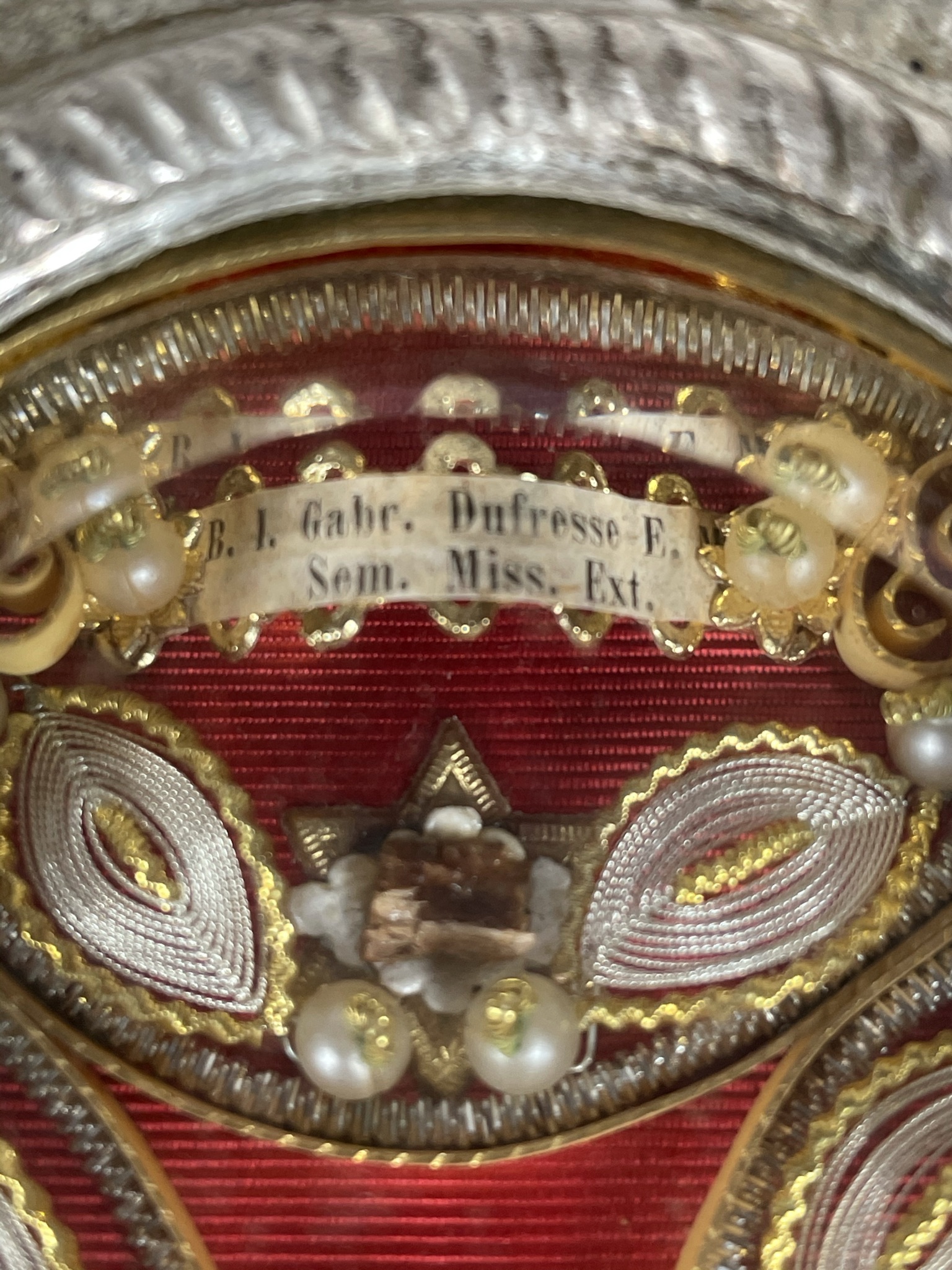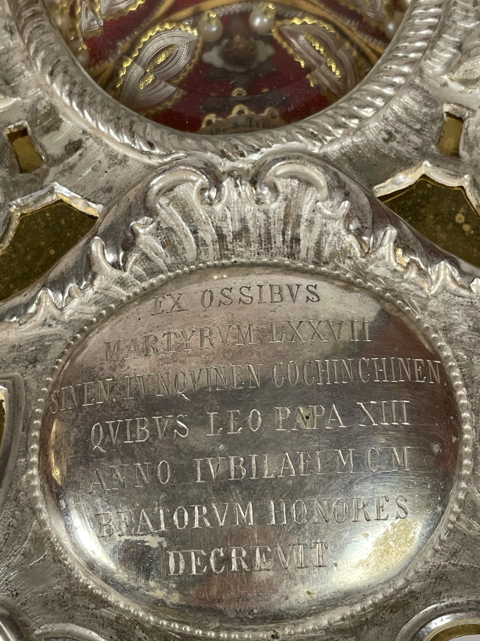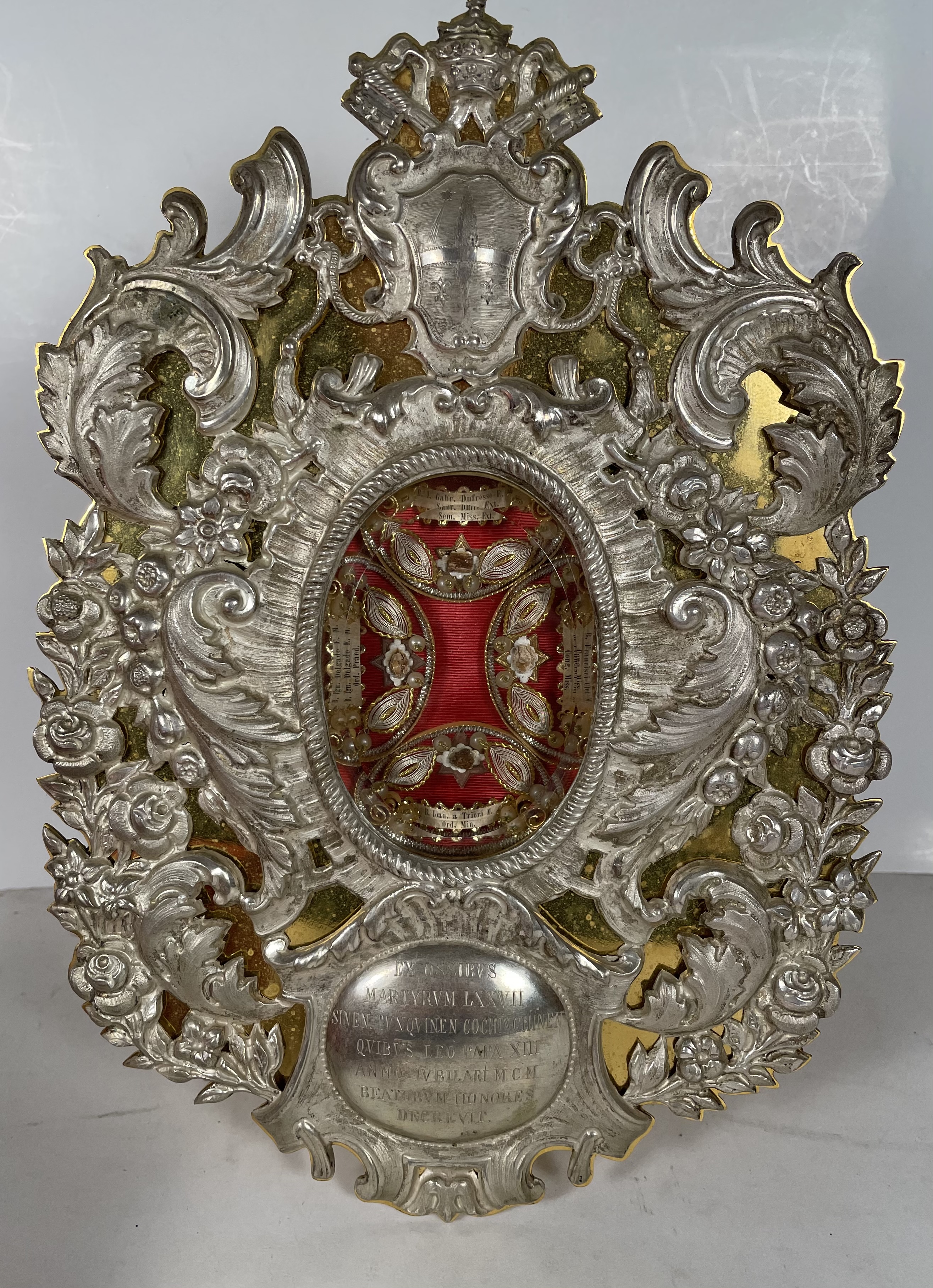 An opulent and massive solid silver-faced Baroque reliquary housing substantial and historically-important ex ossibus (of the bone) pre-canonization relics of four Catholic Martyr Saints of China and Vietnam: St. Louis Gabriel Taurin Dufresse, St. François-Régis Clet, St. John of Triora, and St. Ignatius Delgado, all Beautified by Pope Leo XIII on May 27, 1900. The reliquary was sealed around the time of the Beatification by the Society of Foreign Missions of Paris and distributed by the Vatican's Papal office of the Congregation for Saints’ Causes.  The relics are affixed to a background of red silk and surrounded by paperolle, silk thread, and imitation pearl decoration, identified on the typeset cedula labels as B. L. Gabr. Dufresse E. M. Sem. Miss. Ext. (the Blessed Louis Gabriel Dufresse Bishop & Martyr, Society of Foreign Missions) / B. Francisci Clet M. Cong. Miss. (the Blessed Francis Regis Clet, Martyr, Congregation of the Mission) / B. Ioan, a Triora M. Ord. Min. (the Blessed John da Triora, Martyr, Order of Friars Minor) / B. Ign. Delgado E. M. Ord. Praed. (the Blessed Ignacio Delgado, Bishop & Martyr, Dominican Order).  On the back, under a protective cap, the reliquary is secured by a seal of red Spanish wax with a coat of arms of the Postulator General of the Society of Foreign Missions of Paris (Société des Missions étrangères de Paris, short M.E.P.), a Roman Catholic missionary organization of secular priests and laypersons dedicated to missionary work in foreign lands. On the front, the crystal-fronted reliquary opening is surmounted by a coat of arms of Pope Leo XIII (p. 1878-1903) and decorated below with a shield engraved with Latin inscription: EX OSSIBVS / MARTYRVM LXXVII / SINEN. TVNQVINEN COCHINCHINEN / QVIBVS LEO PAPA XIII / ANNO IVBILAEI MCM / BEATORVM HONORES / DECREVIT. ("Of the Bones of 77 Martyrs of China and Cocochina (Vietnam), whom Pope Leo XIII declared as the Beatified in the jubilee year of 1900."). The reliquary comes in its original silk-lined fitted case embellished on the outer lid with a gilt coat of arms of Pope Leo XIII.