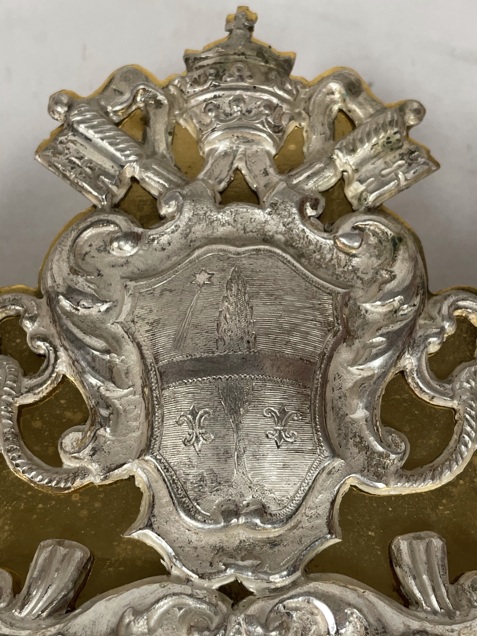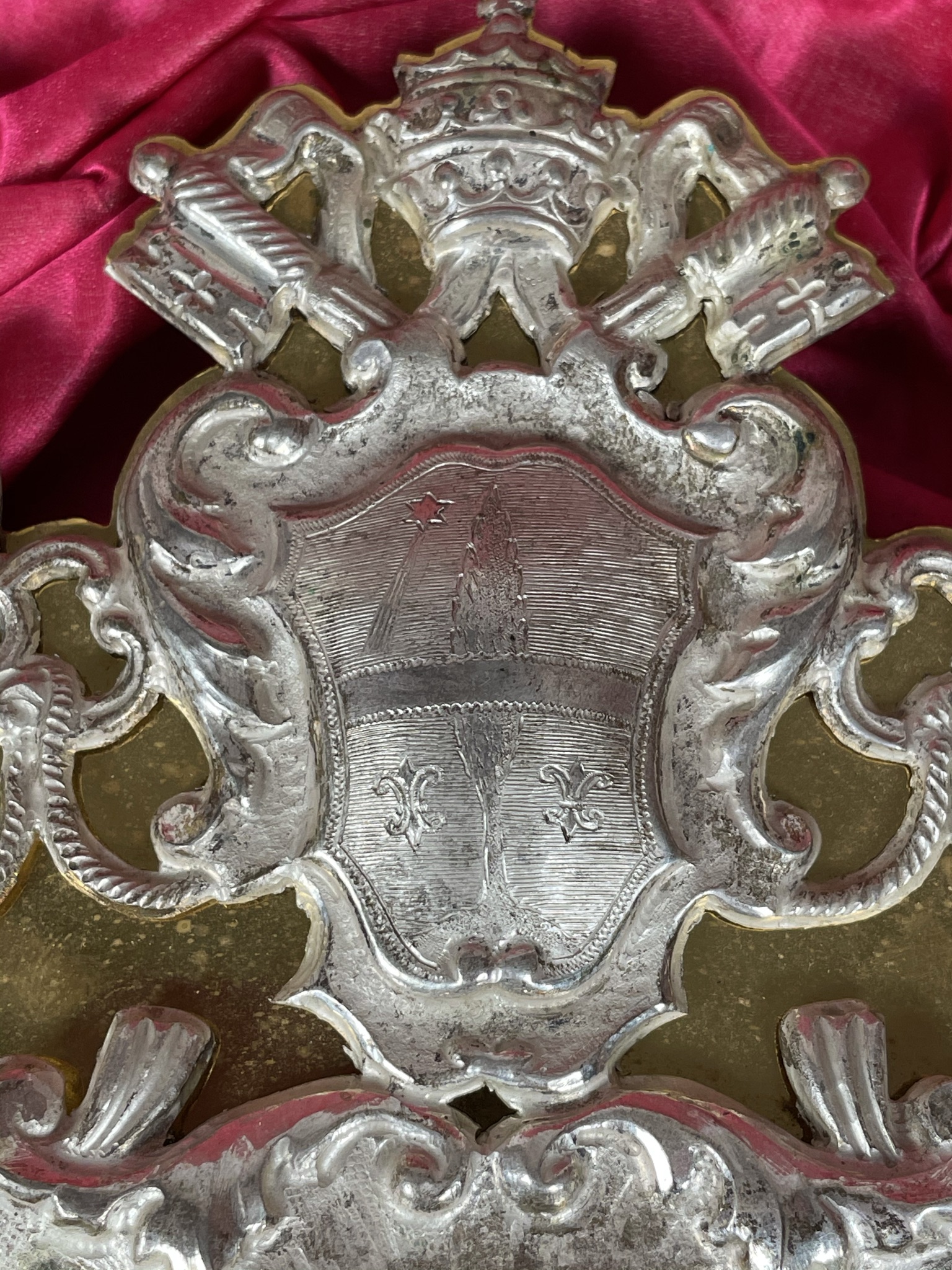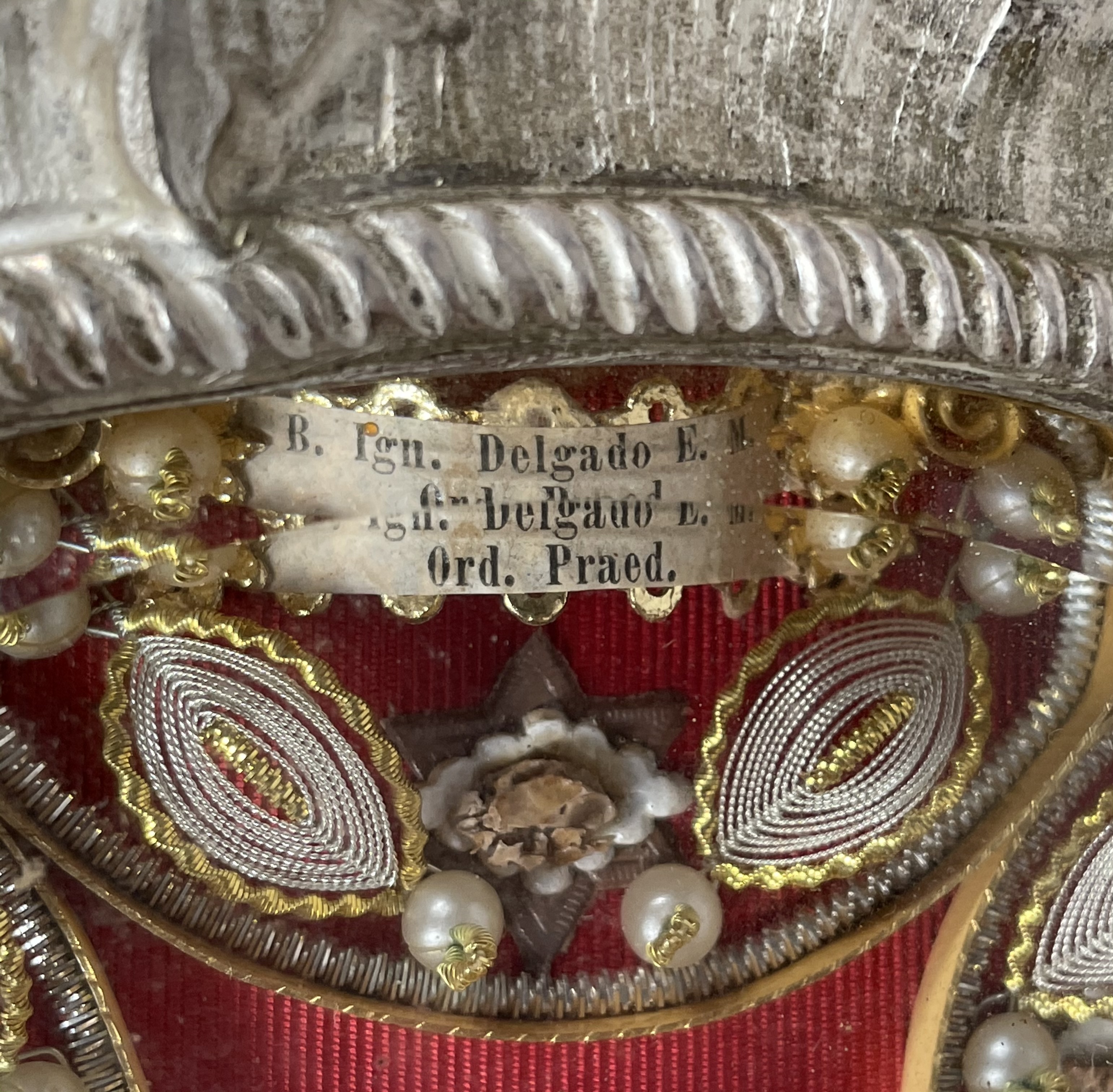 An opulent and massive solid silver-faced Baroque reliquary housing substantial and historically-important ex ossibus (of the bone) pre-canonization relics of four Catholic Martyr Saints of China and Vietnam: St. Louis Gabriel Taurin Dufresse, St. François-Régis Clet, St. John of Triora, and St. Ignatius Delgado, all Beautified by Pope Leo XIII on May 27, 1900. The reliquary was sealed around the time of the Beatification by the Society of Foreign Missions of Paris and distributed by the Vatican's Papal office of the Congregation for Saints’ Causes.  The relics are affixed to a background of red silk and surrounded by paperolle, silk thread, and imitation pearl decoration, identified on the typeset cedula labels as B. L. Gabr. Dufresse E. M. Sem. Miss. Ext. (the Blessed Louis Gabriel Dufresse Bishop & Martyr, Society of Foreign Missions) / B. Francisci Clet M. Cong. Miss. (the Blessed Francis Regis Clet, Martyr, Congregation of the Mission) / B. Ioan, a Triora M. Ord. Min. (the Blessed John da Triora, Martyr, Order of Friars Minor) / B. Ign. Delgado E. M. Ord. Praed. (the Blessed Ignacio Delgado, Bishop & Martyr, Dominican Order).  On the back, under a protective cap, the reliquary is secured by a seal of red Spanish wax with a coat of arms of the Postulator General of the Society of Foreign Missions of Paris (Société des Missions étrangères de Paris, short M.E.P.), a Roman Catholic missionary organization of secular priests and laypersons dedicated to missionary work in foreign lands. On the front, the crystal-fronted reliquary opening is surmounted by a coat of arms of Pope Leo XIII (p. 1878-1903) and decorated below with a shield engraved with Latin inscription: EX OSSIBVS / MARTYRVM LXXVII / SINEN. TVNQVINEN COCHINCHINEN / QVIBVS LEO PAPA XIII / ANNO IVBILAEI MCM / BEATORVM HONORES / DECREVIT. ("Of the Bones of 77 Martyrs of China and Cocochina (Vietnam), whom Pope Leo XIII declared as the Beatified in the jubilee year of 1900."). The reliquary comes in its original silk-lined fitted case embellished on the outer lid with a gilt coat of arms of Pope Leo XIII.