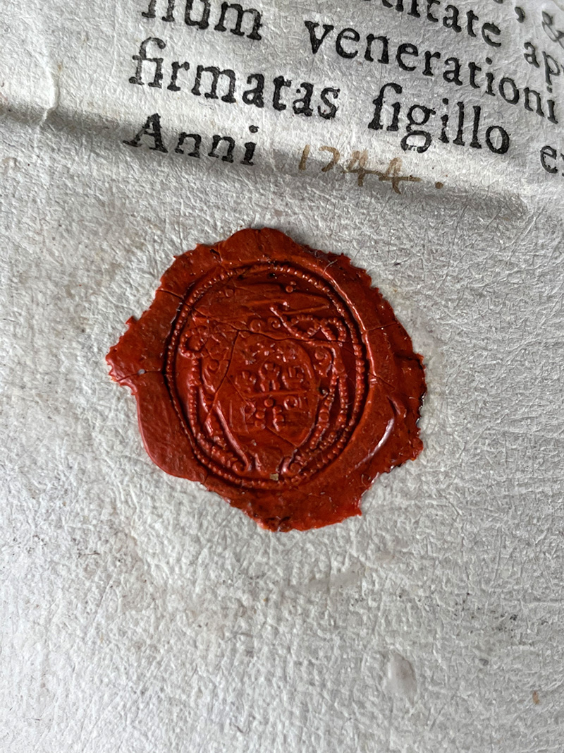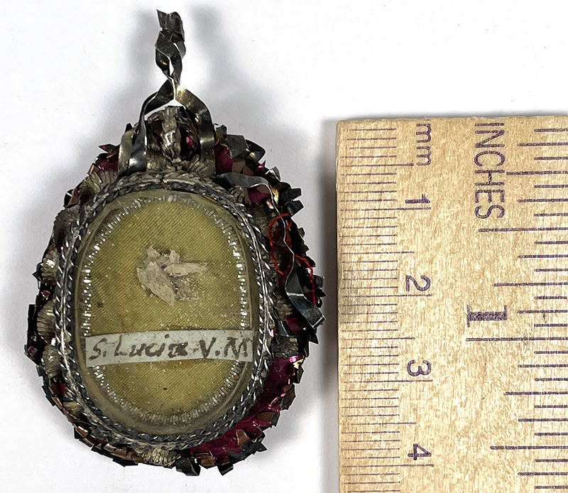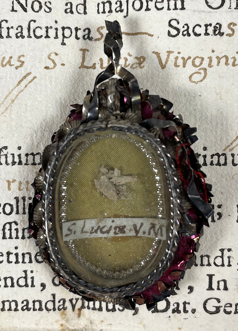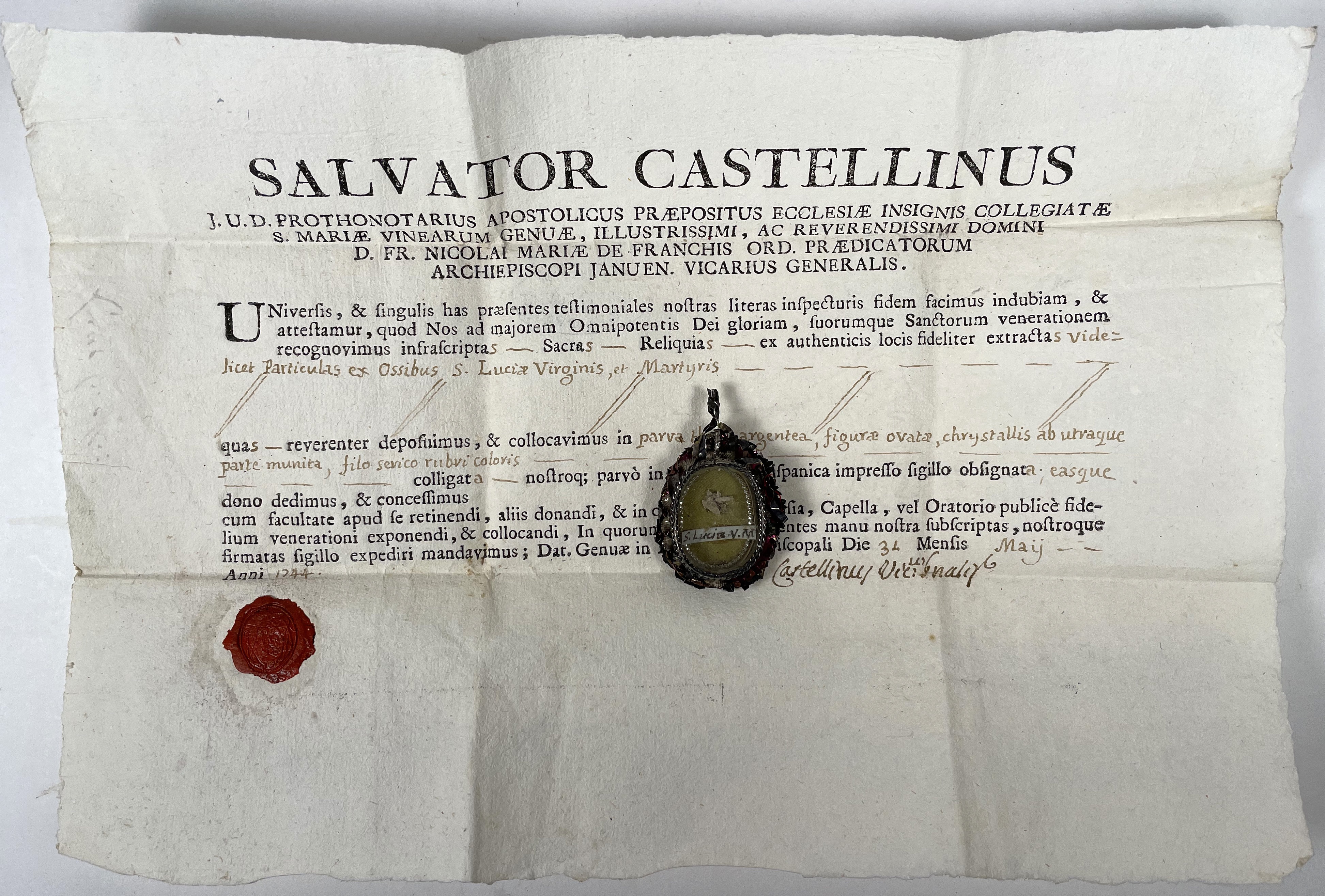 Oval glass-fronted silver reliquary theca housing precious first-class ex ossibus (from the bone) relic of St. Lucia. The relic is affixed to a gold silk background decorated with silver wire ornamentation and identified on a manuscript cedula label as S. Luciae V.M. (Saint Lucia, Virgin & Martyr). On the back, the theca is secured with a perfectly-preserved seal of red Spanish wax bearing an imprint of a coat of arms of Fr. Salvatore Castellino, the Vicar General of Genoa. The relic is accompanied by an original matching authentics document issued and signed by Fr. Castellino in 1744 under the orders of the Archbishop of Genoa Nicolò Mariade’ FranchiO.P. (†).