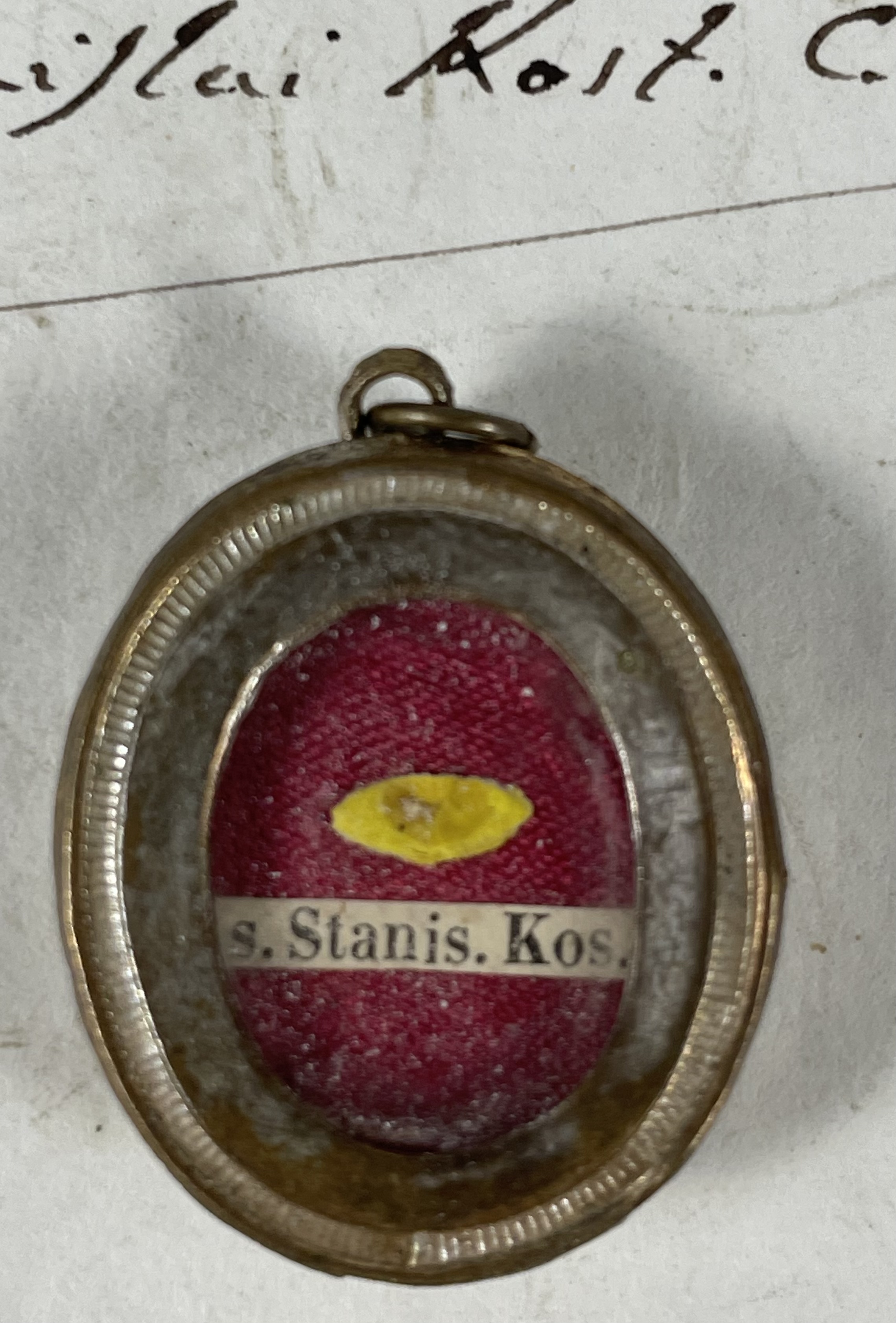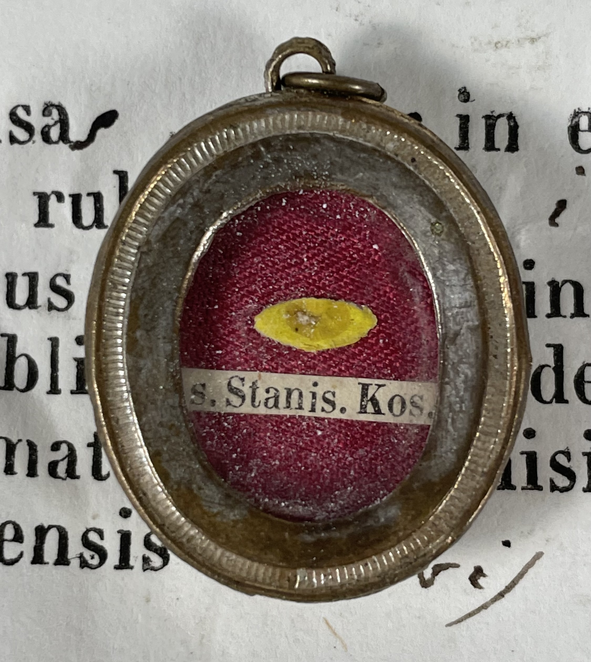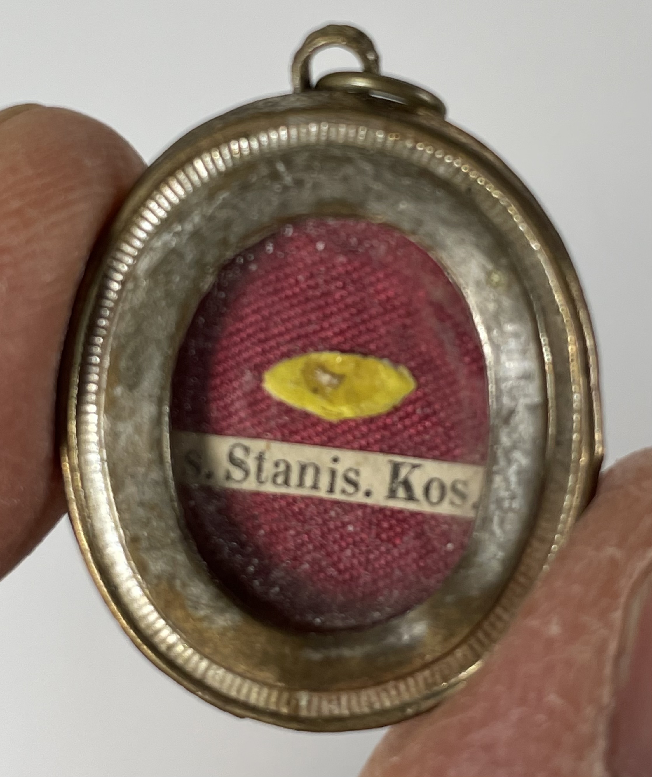 Oval silvered brass glass-fronted reliquary theca housing the first-class-class ex ossibus (of the bone) relic of Saint Stanislaus Kostka. The relic is affixed to a red silk ground and identified in Latin on a typeset cedula label as S. Stanis, Kos. On the back, under a protective cap with a profile of the Saint, the theca is secured with a seal of red Spanish wax bearing an imprint of a coat of arms of Fr. Francesco Marinelli, O.E.S.A.(†1887), Titular Bishop of Porphyreon and the Sacristan of the Apoostoolic Curia (1856-1887). The relic is accompanied by an original matching authentics document issued and signed in 1866 by Fr. Marinelli.