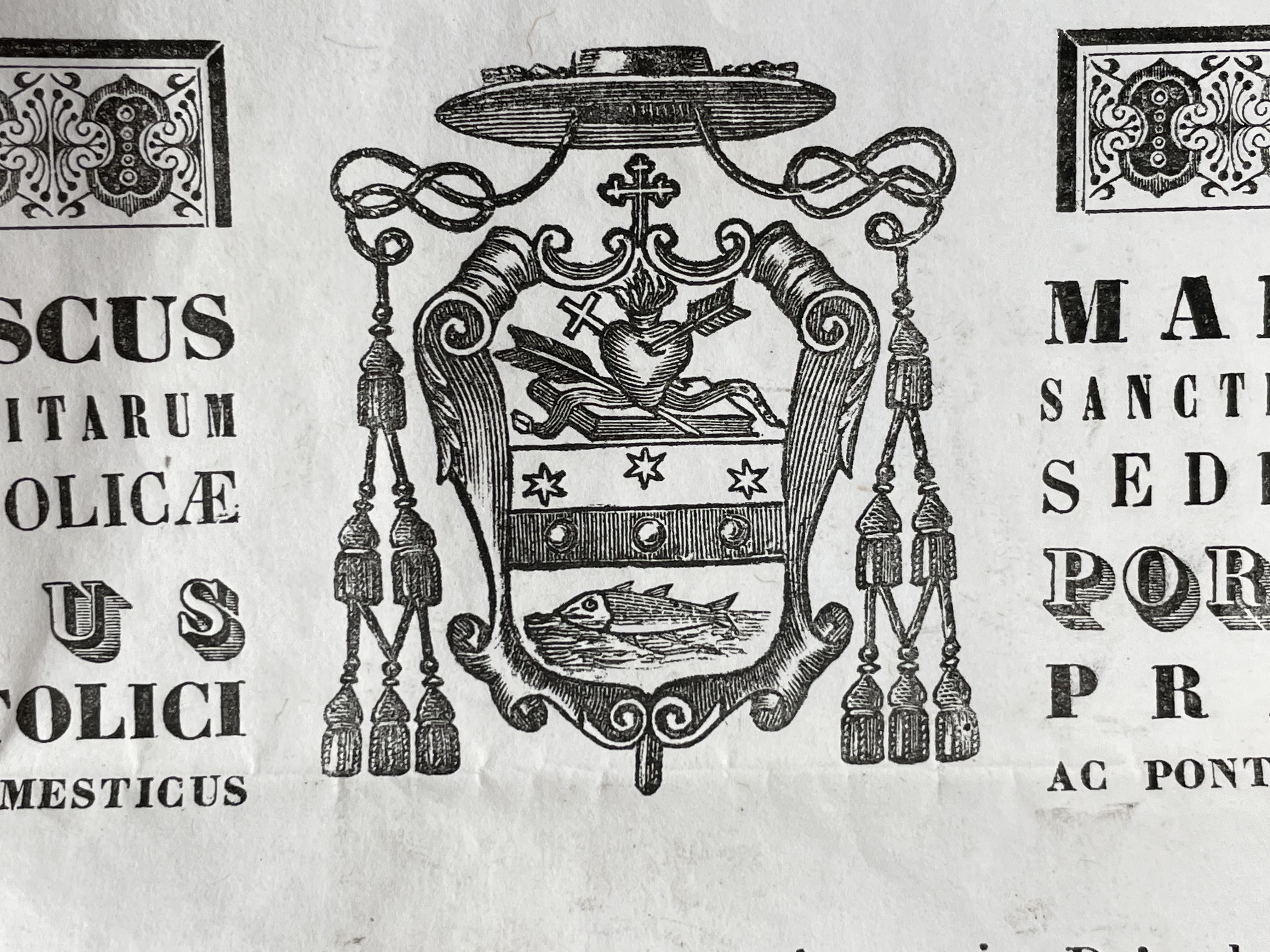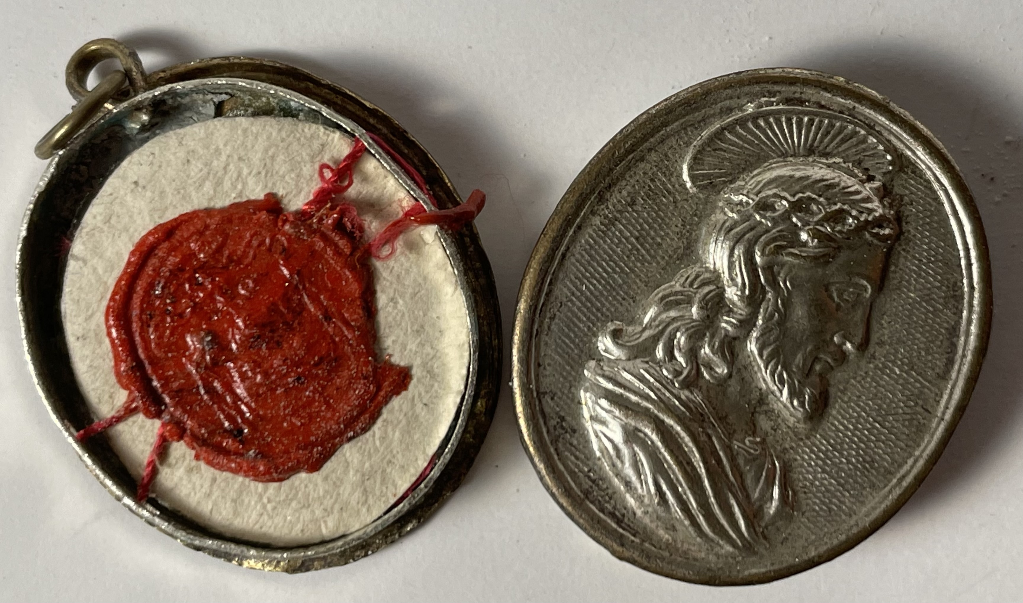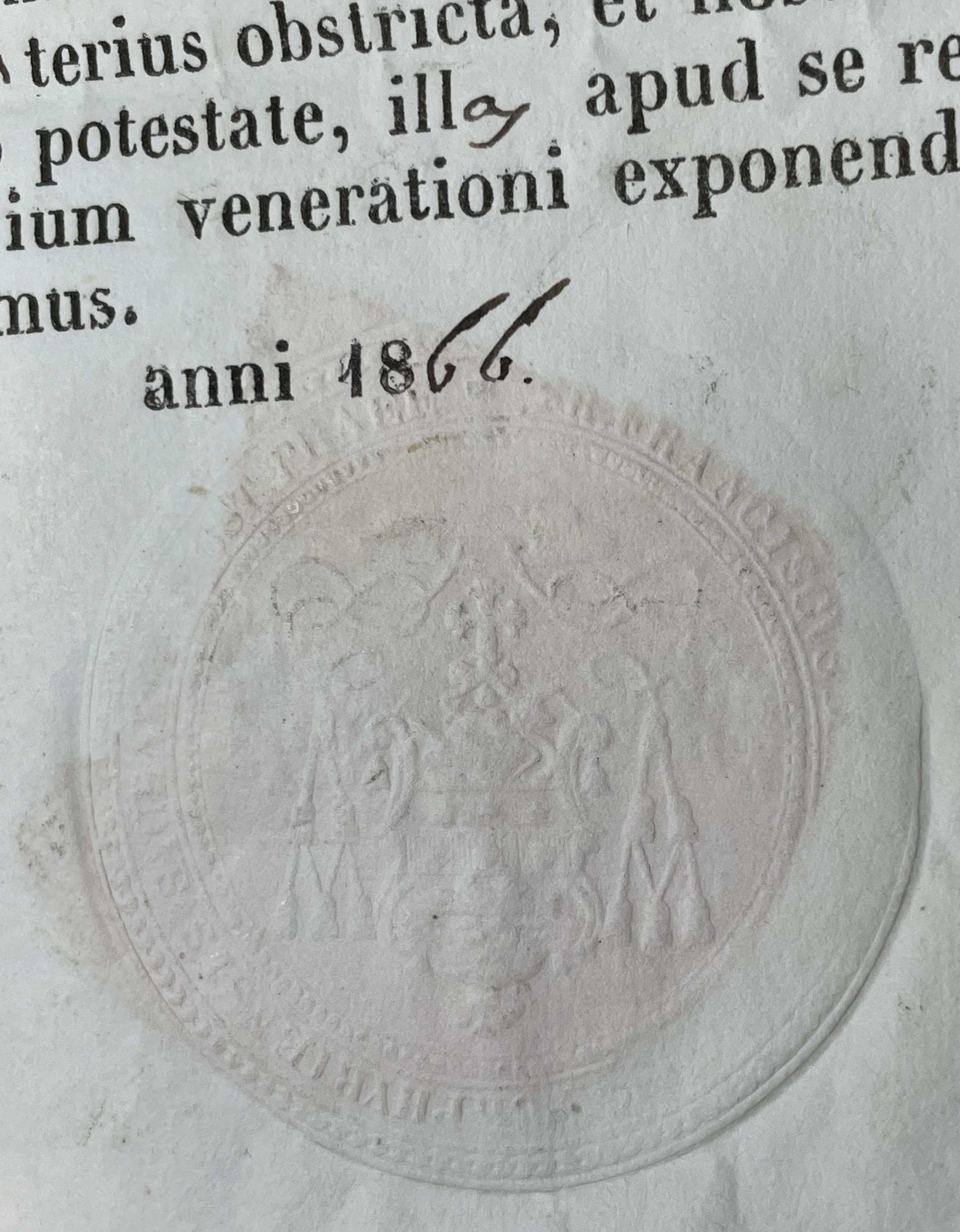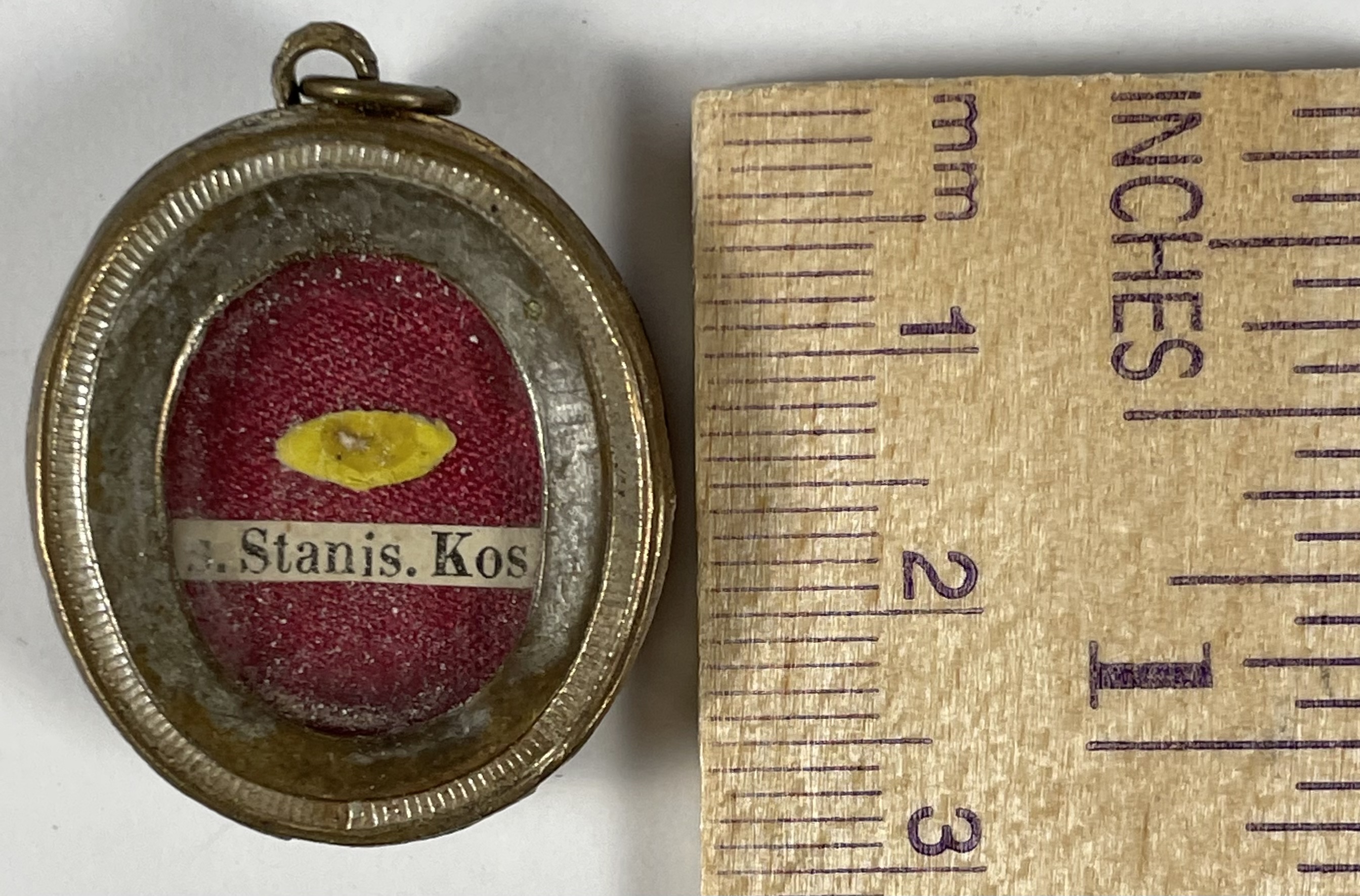 Oval silvered brass glass-fronted reliquary theca housing the first-class-class ex ossibus (of the bone) relic of Saint Stanislaus Kostka. The relic is affixed to a red silk ground and identified in Latin on a typeset cedula label as S. Stanis, Kos. On the back, under a protective cap with a profile of the Saint, the theca is secured with a seal of red Spanish wax bearing an imprint of a coat of arms of Fr. Francesco Marinelli, O.E.S.A.(†1887), Titular Bishop of Porphyreon and the Sacristan of the Apoostoolic Curia (1856-1887). The relic is accompanied by an original matching authentics document issued and signed in 1866 by Fr. Marinelli.