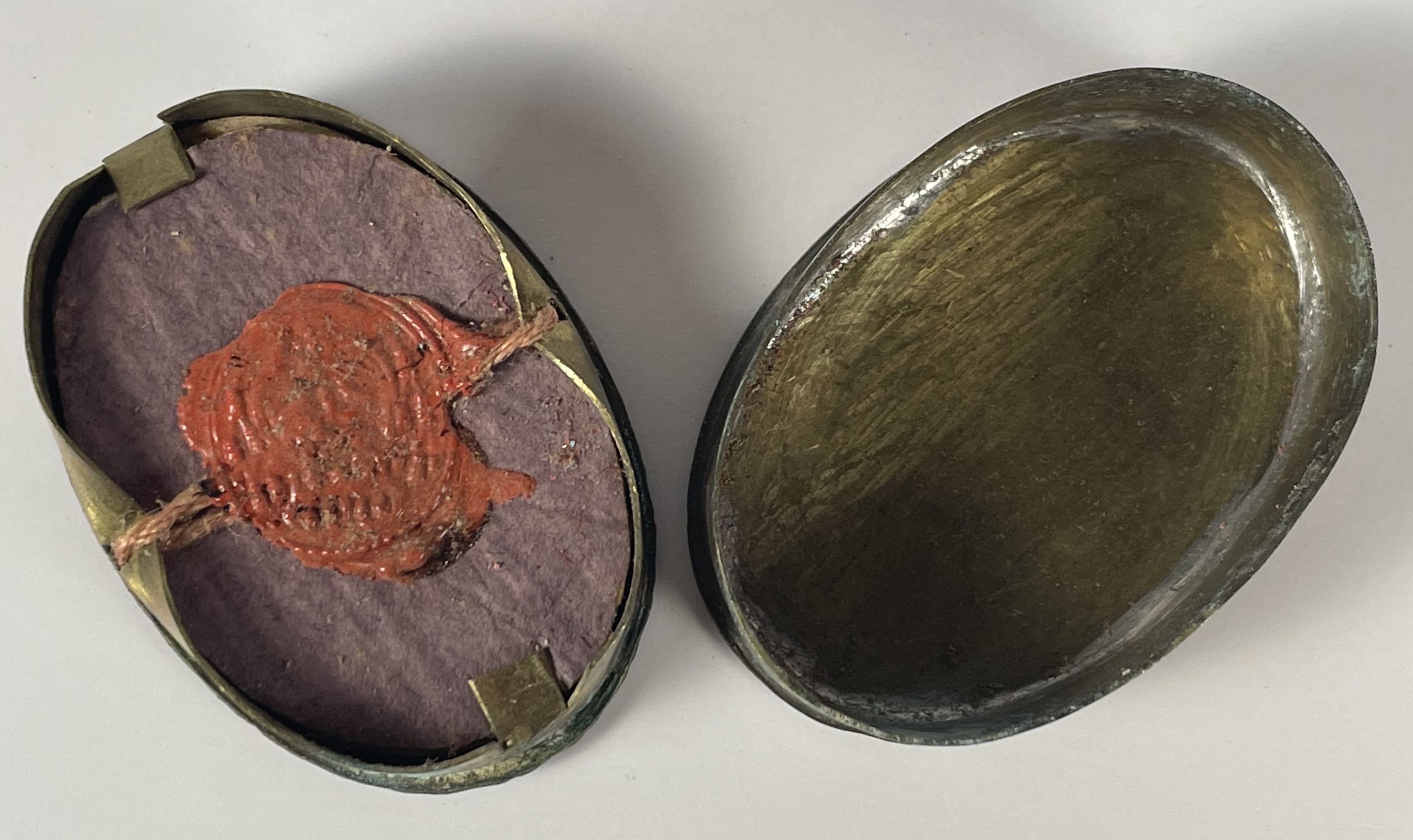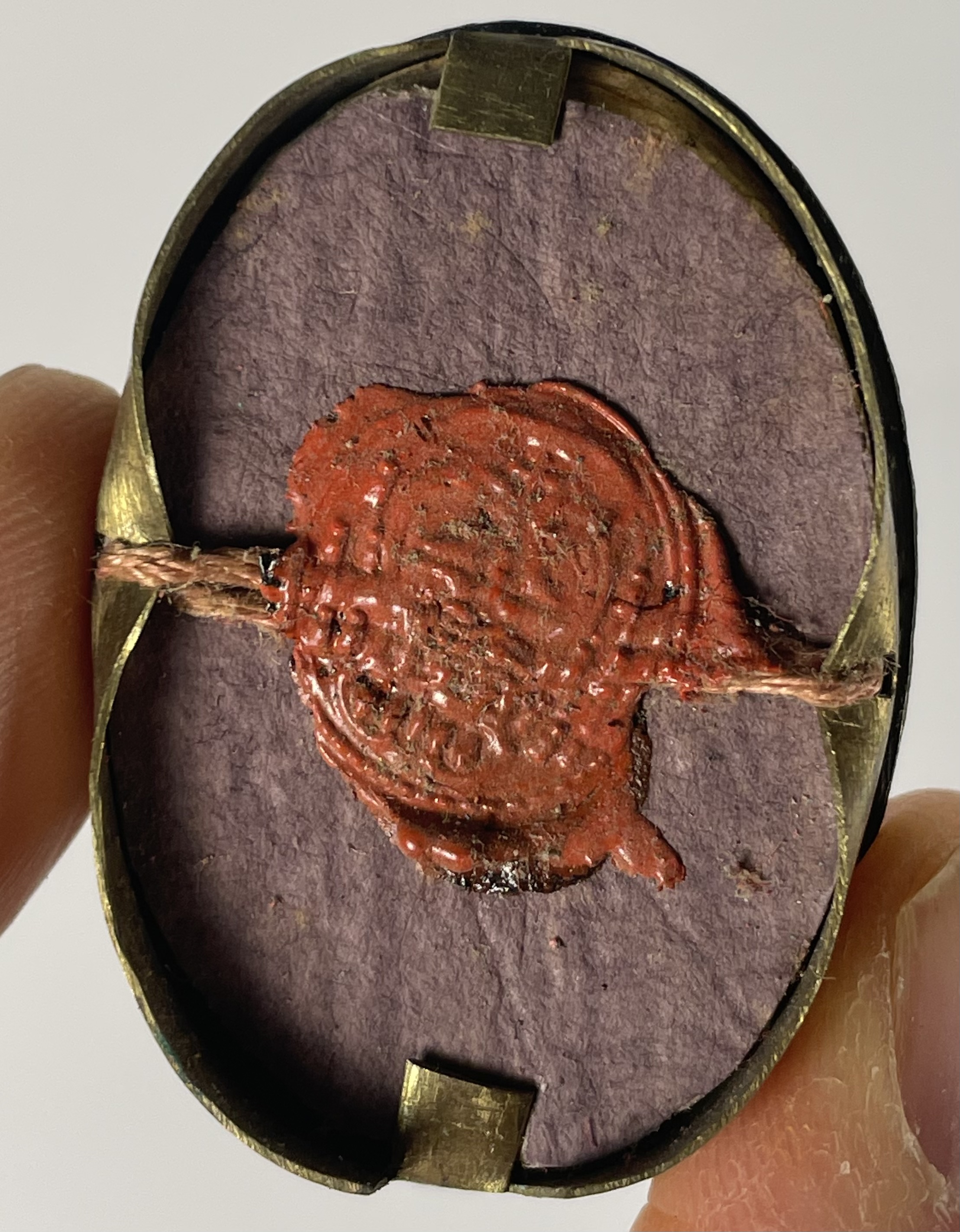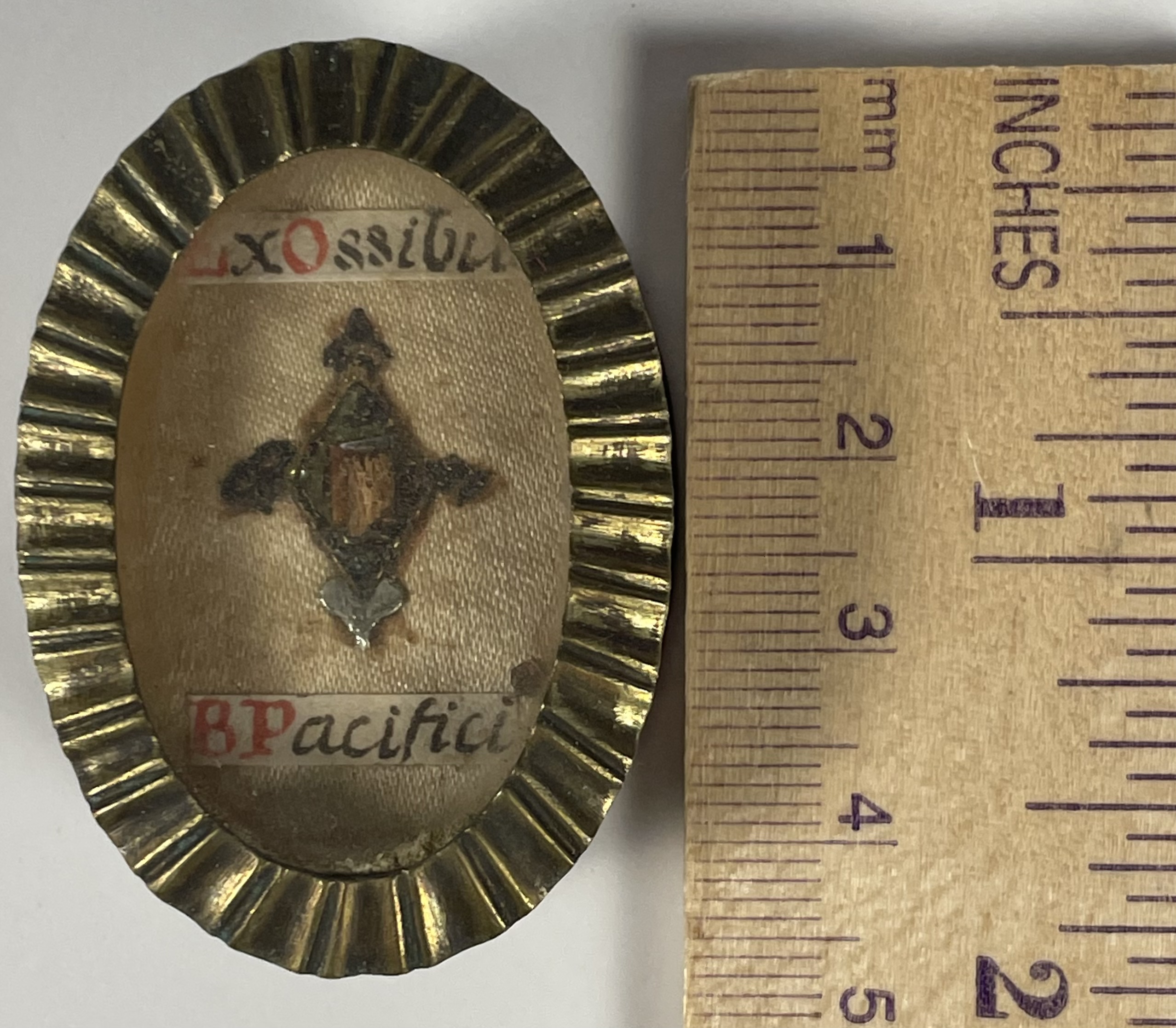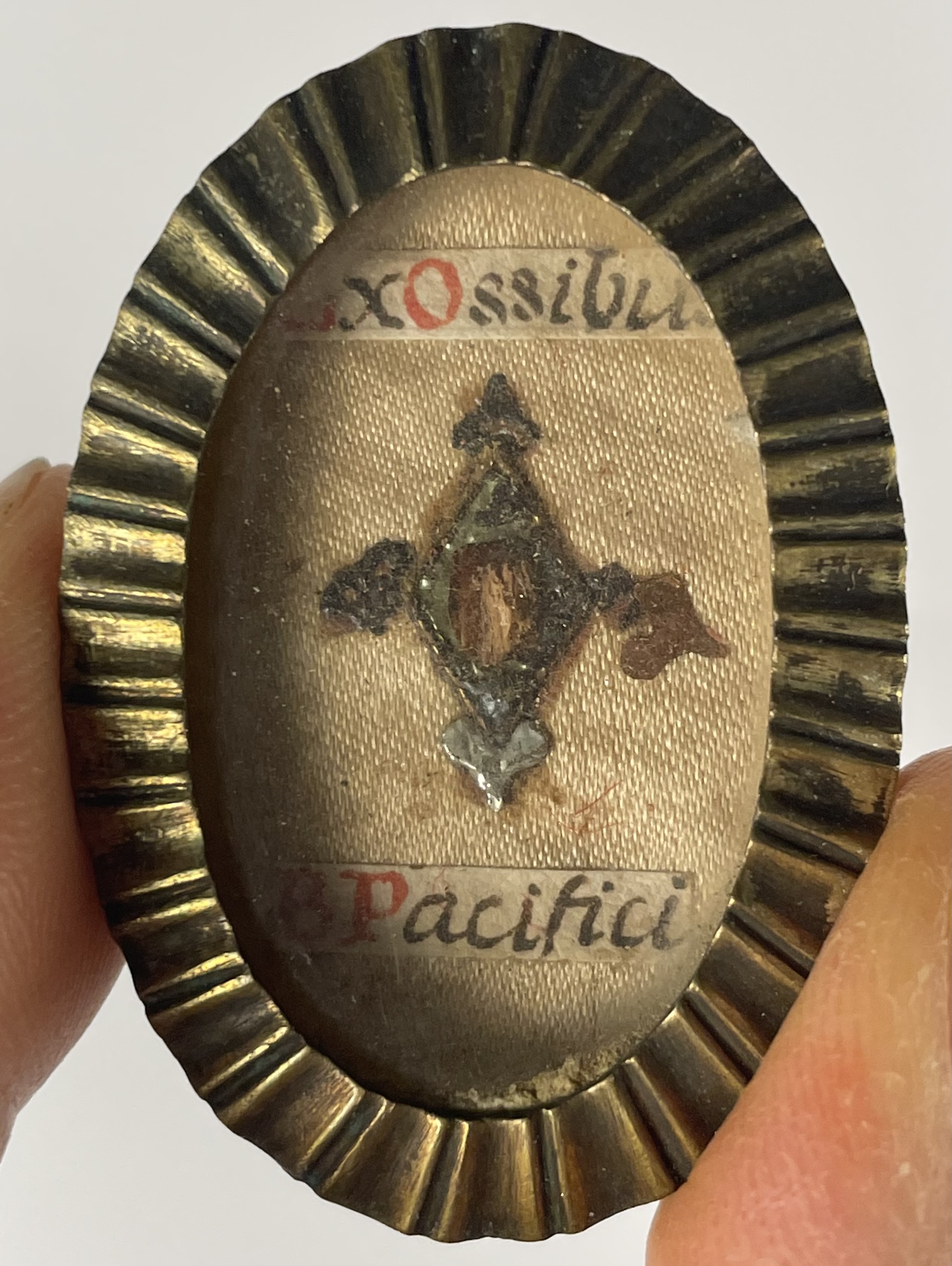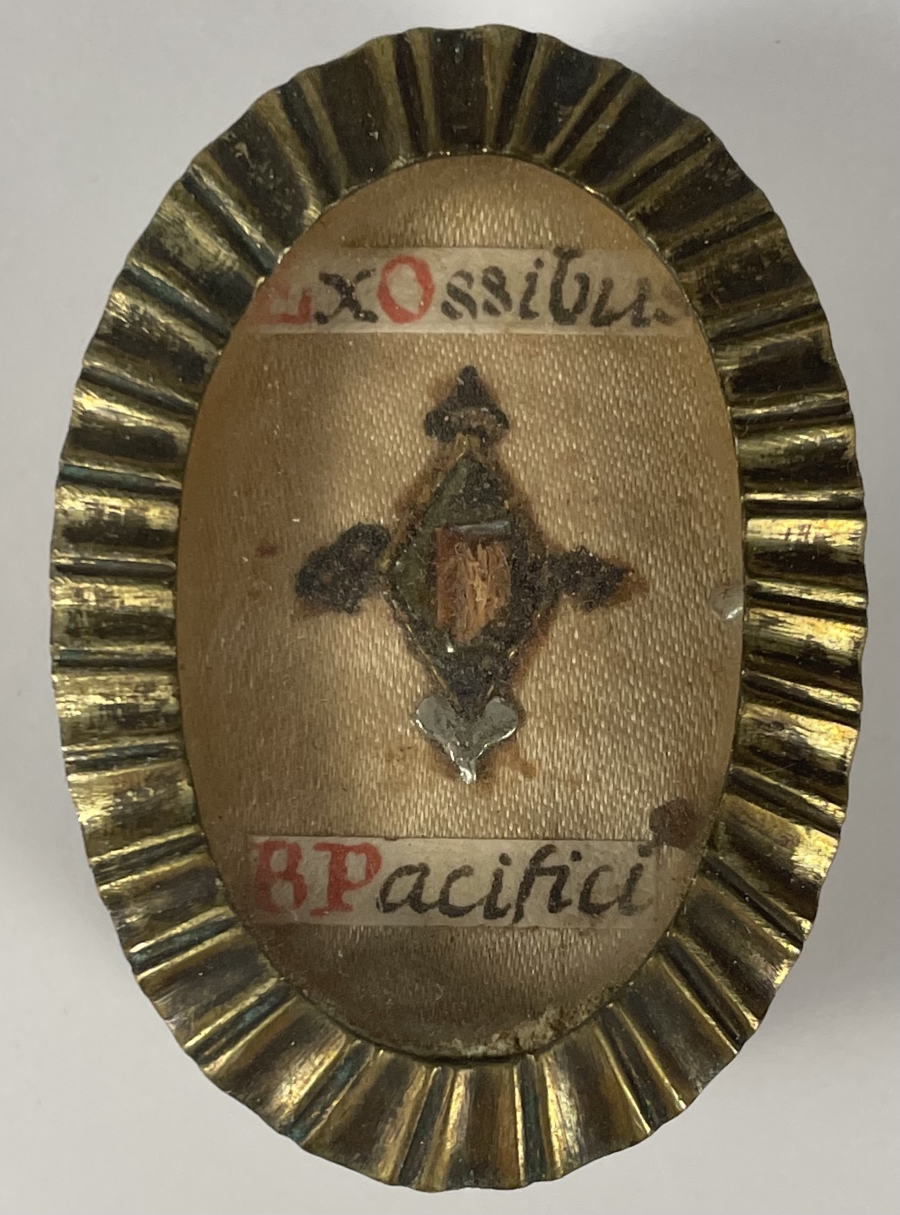 Oval glass-fronted brass theca housing a first-class ex ossibus (of the bone) relic of Blessed Pacificus of Ceredano. The relic is affixed to a silk background and identified on a bi-color manuscript cedula label as Ex Ossibus / B. Pacifici (of the bone of the Blessed Pacificus). On the back, under a protective cap, the theca is secured by a seal of red Spanish wax with an imprint of a coat of arms of an unidentified Roman Catholic Bishop.
