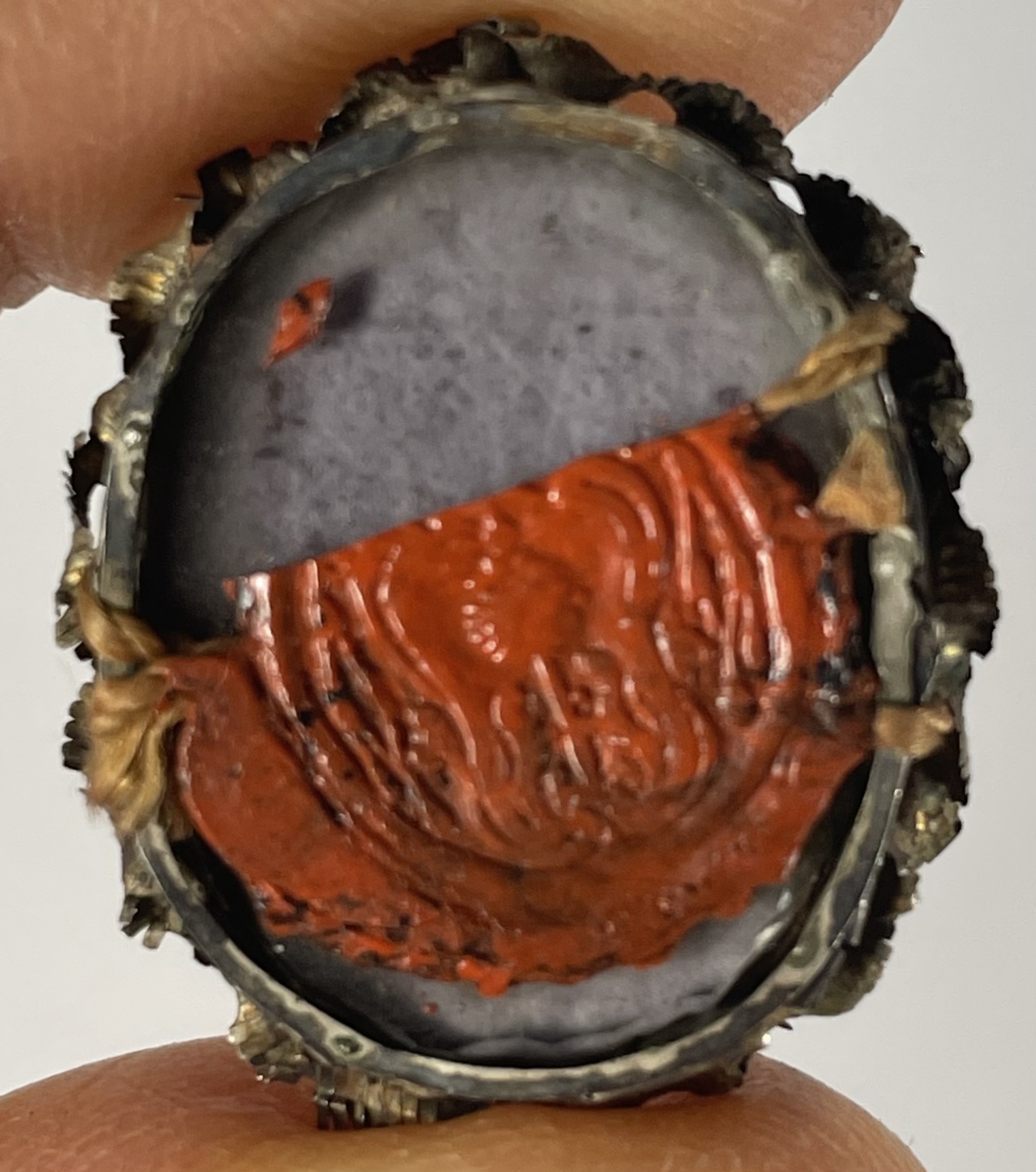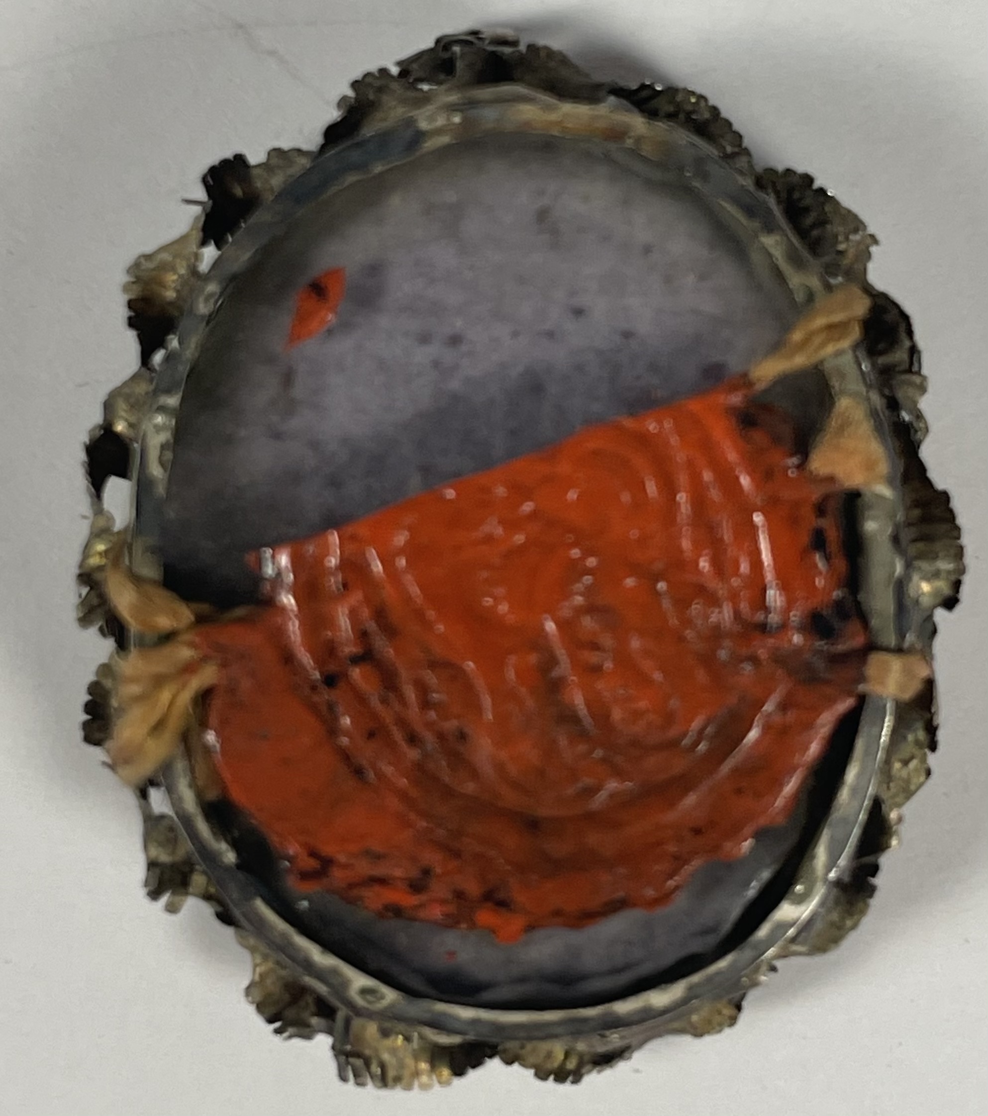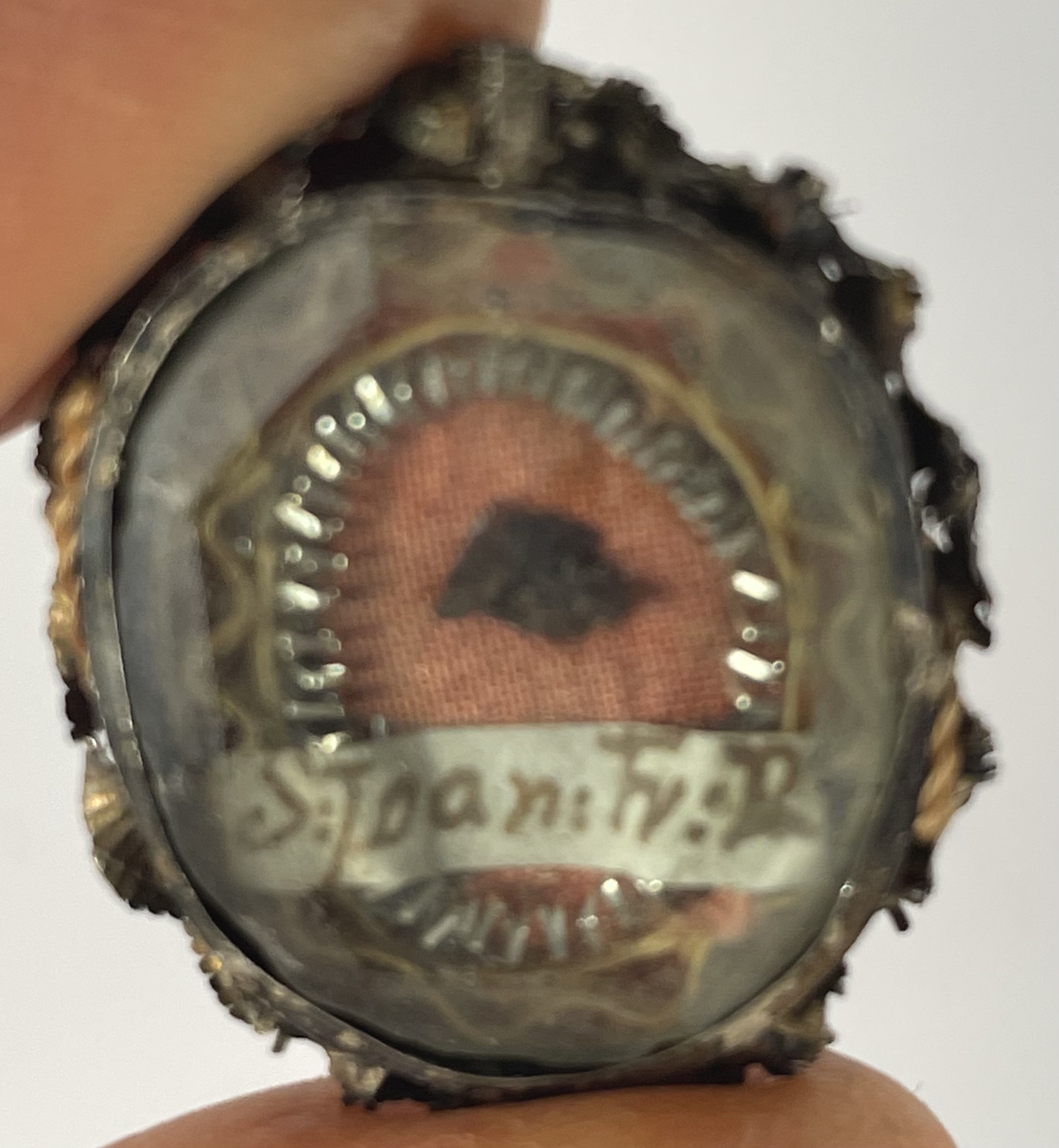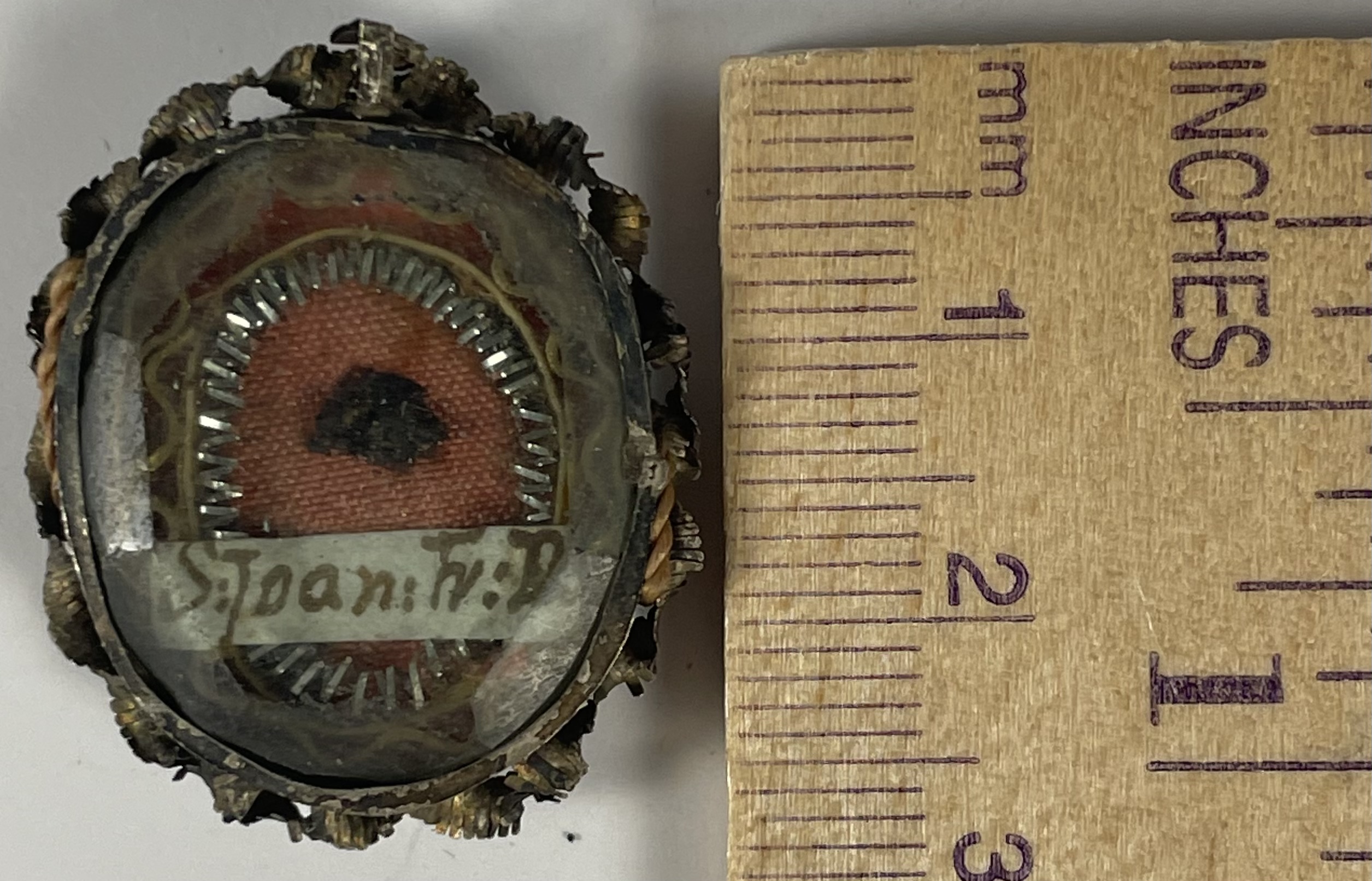 Small oval crystal-fronted silver theca housing a relic of Saint Jean-François RégisThe relic is affixed to a red silk background surrounded by gilt paperole and silver wire ornamentation and identified on a manuscript cedula label in Latin as S. Joan Fr. R.  (Saint Jean-François Régis). On the back, the theca is secured by a partially preserved seal of red Spanish wax with an imprint of a coat of arms of a Fr. Domenico Giordani (†1781), Titular Archbishop of Nicomedia (1755-1766).