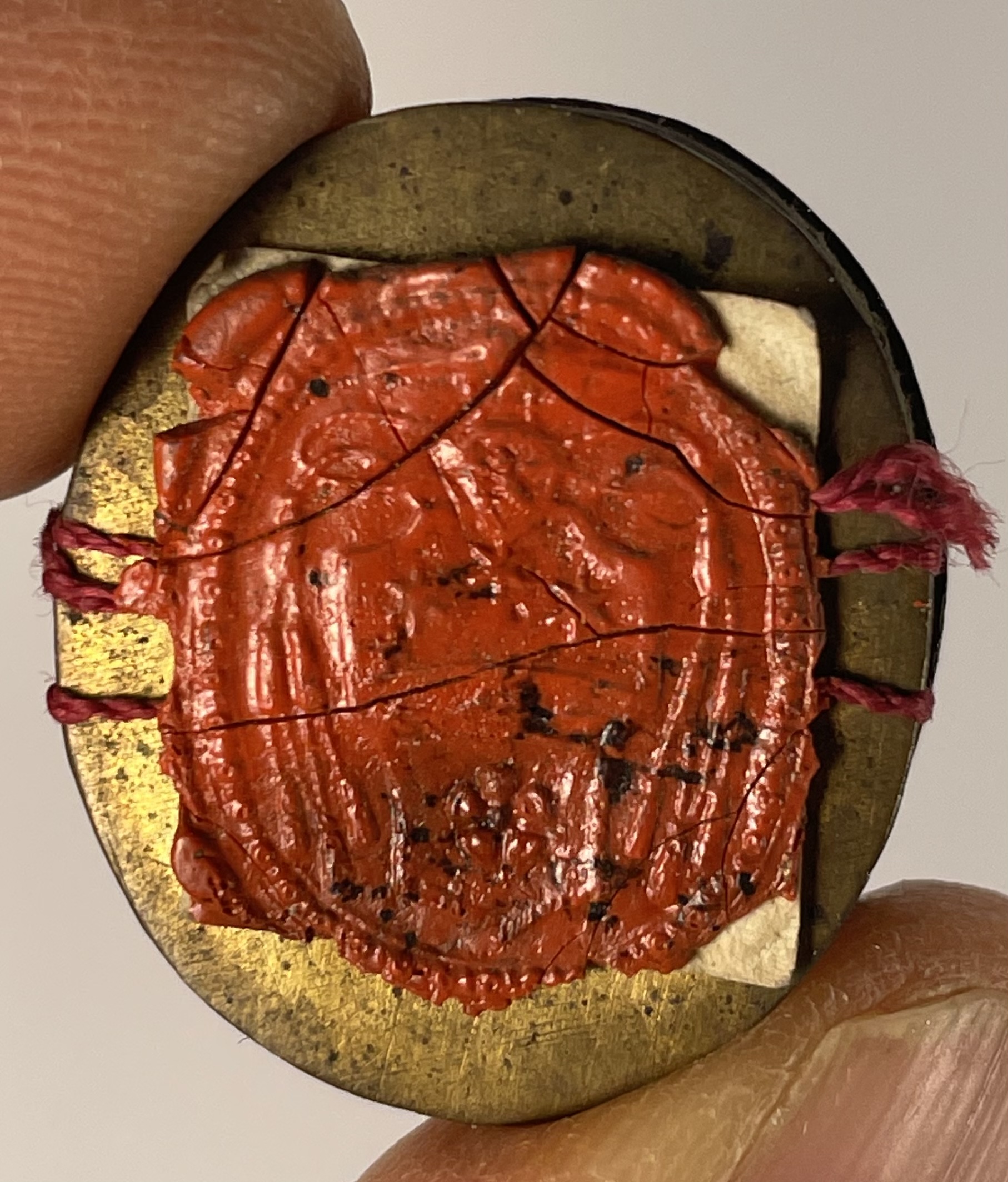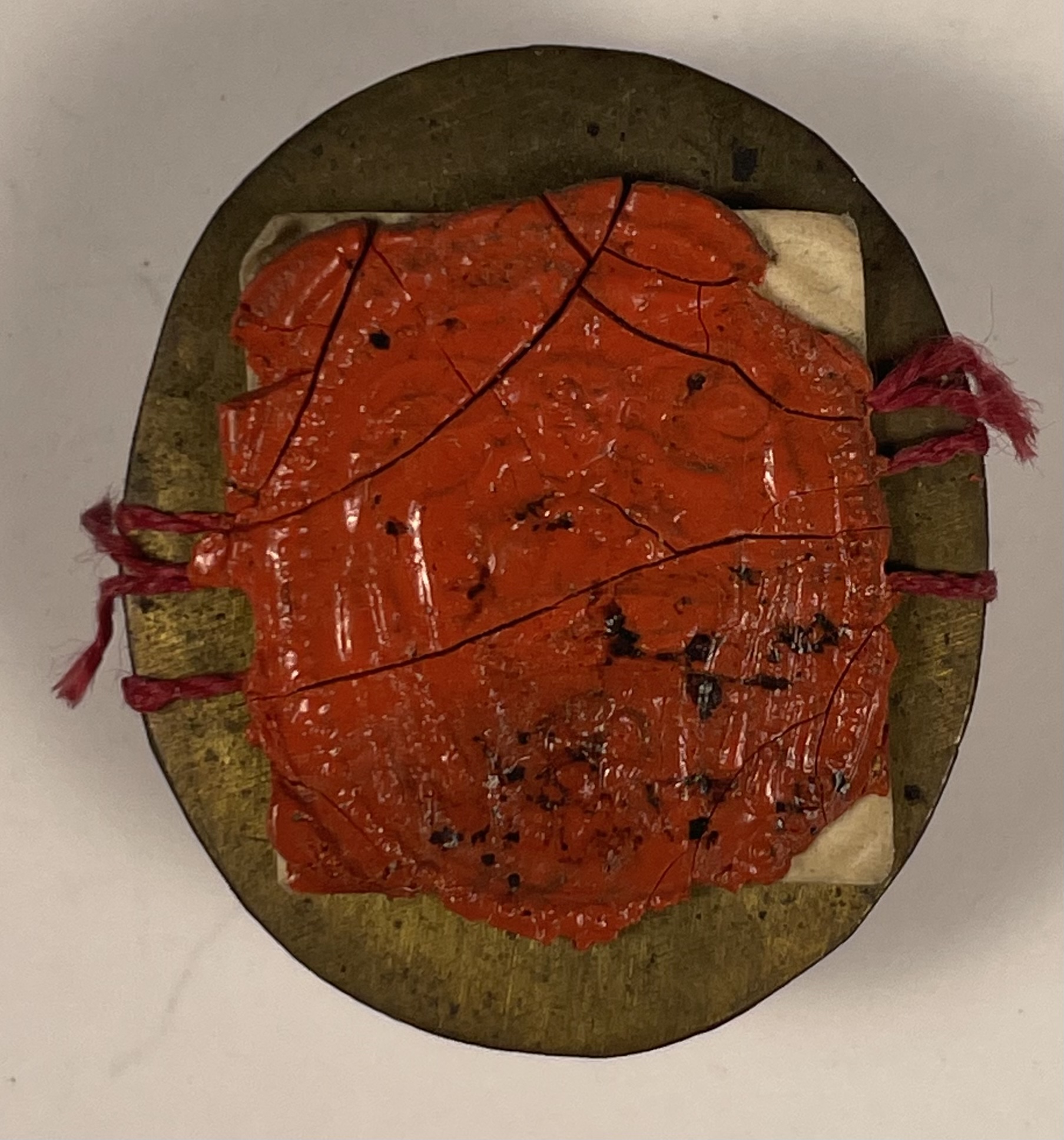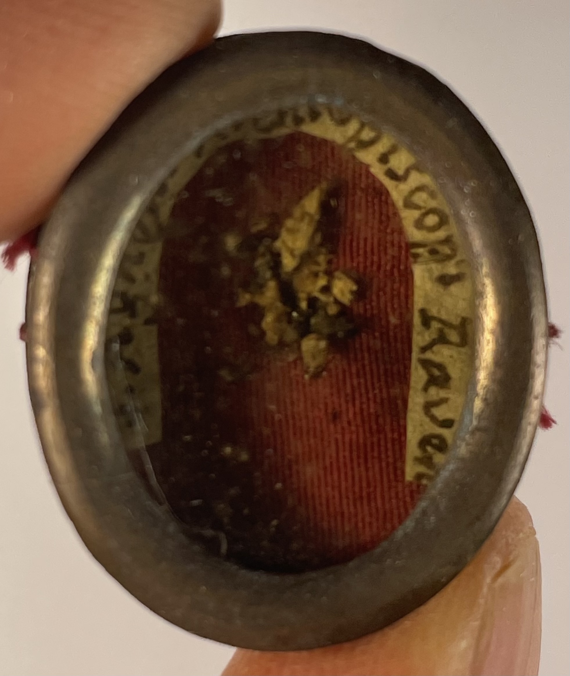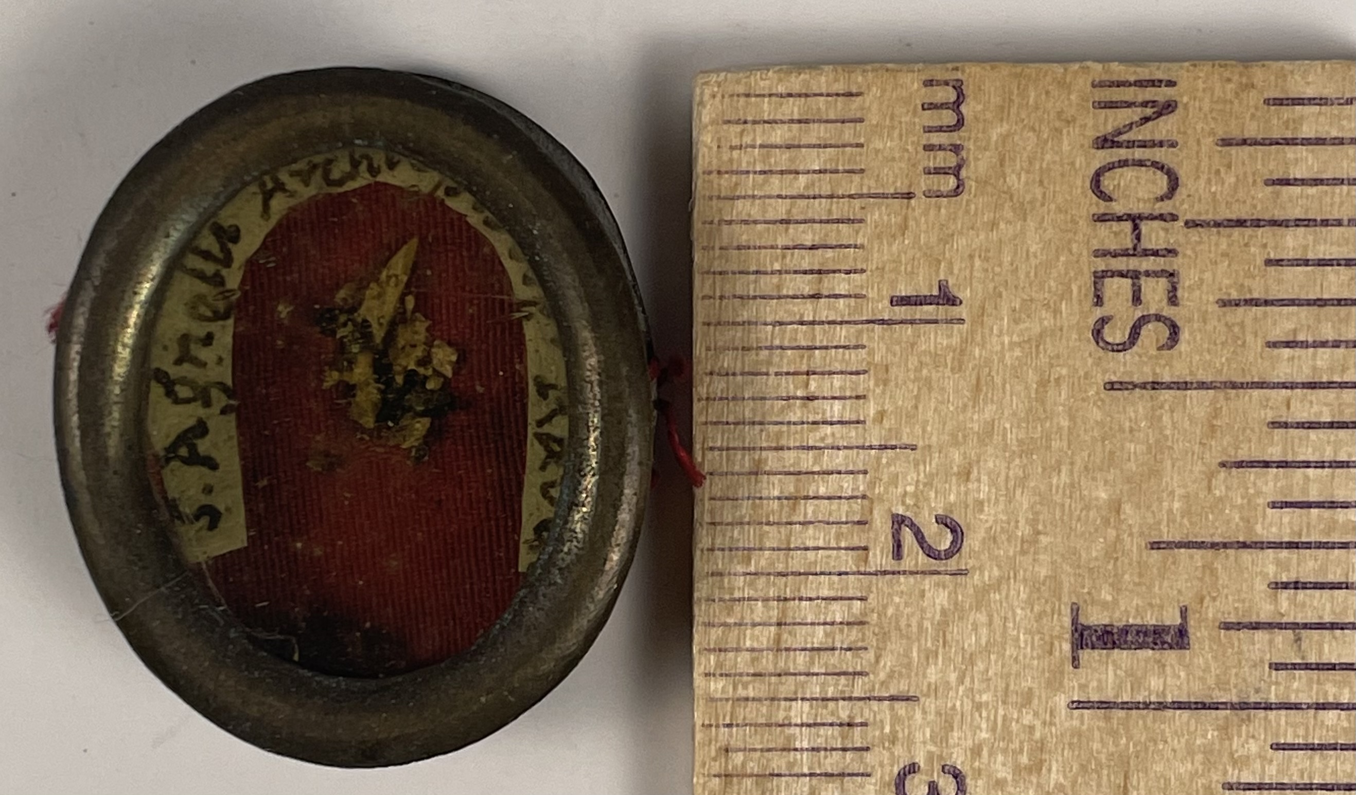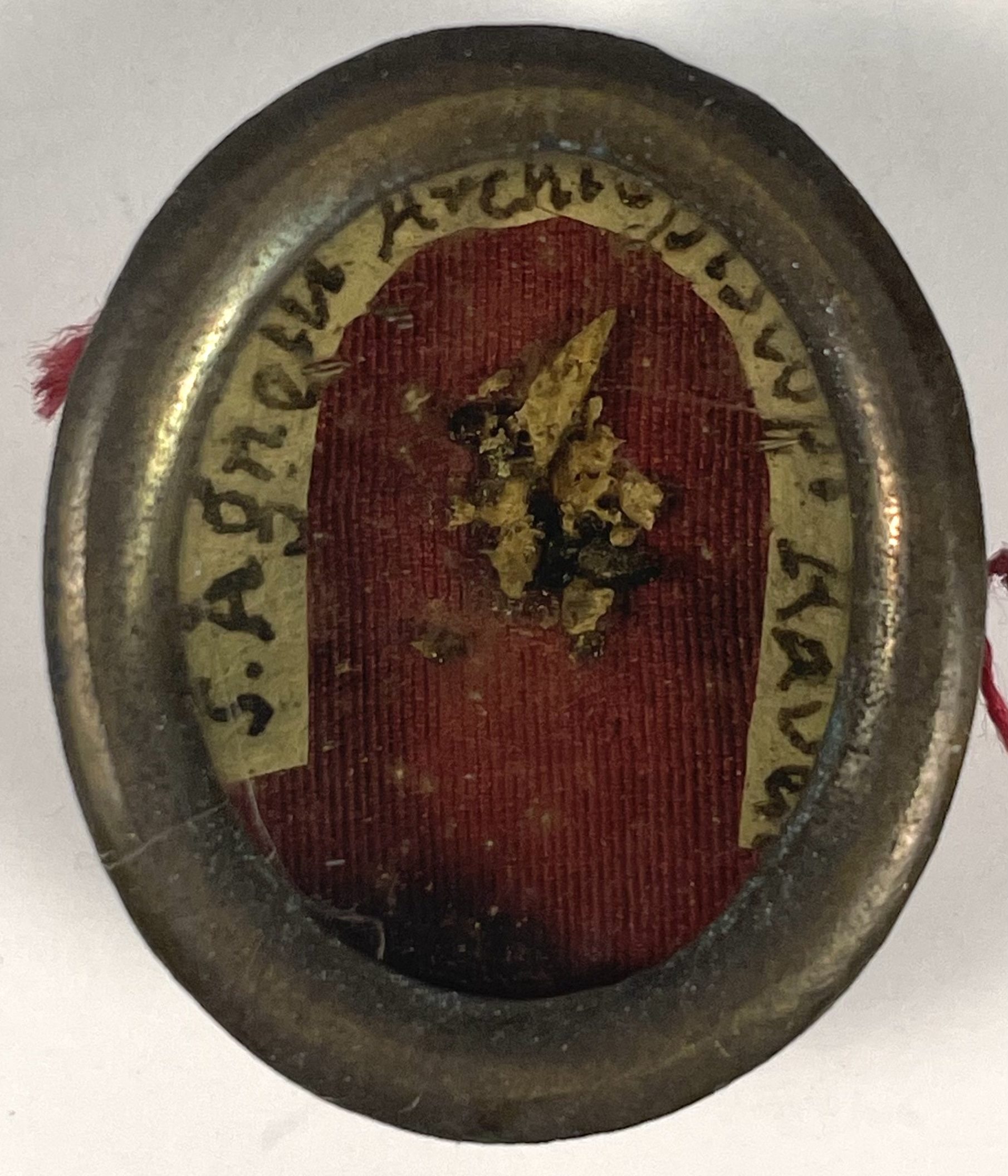 Oval glass-fronted brass reliquary theca housing a relic of Saint Agnellus, Archbishop of Ravenna. A relic is affixed to a red-colored silk background and identified in Latin on a manuscript cedula label as S. Agnelli Archbiepiscopi Raven. On the back, the theca is secured by a seal of red Spanish wax with a faint imprint of a coat of arms of a Roman Catholic Bishop.