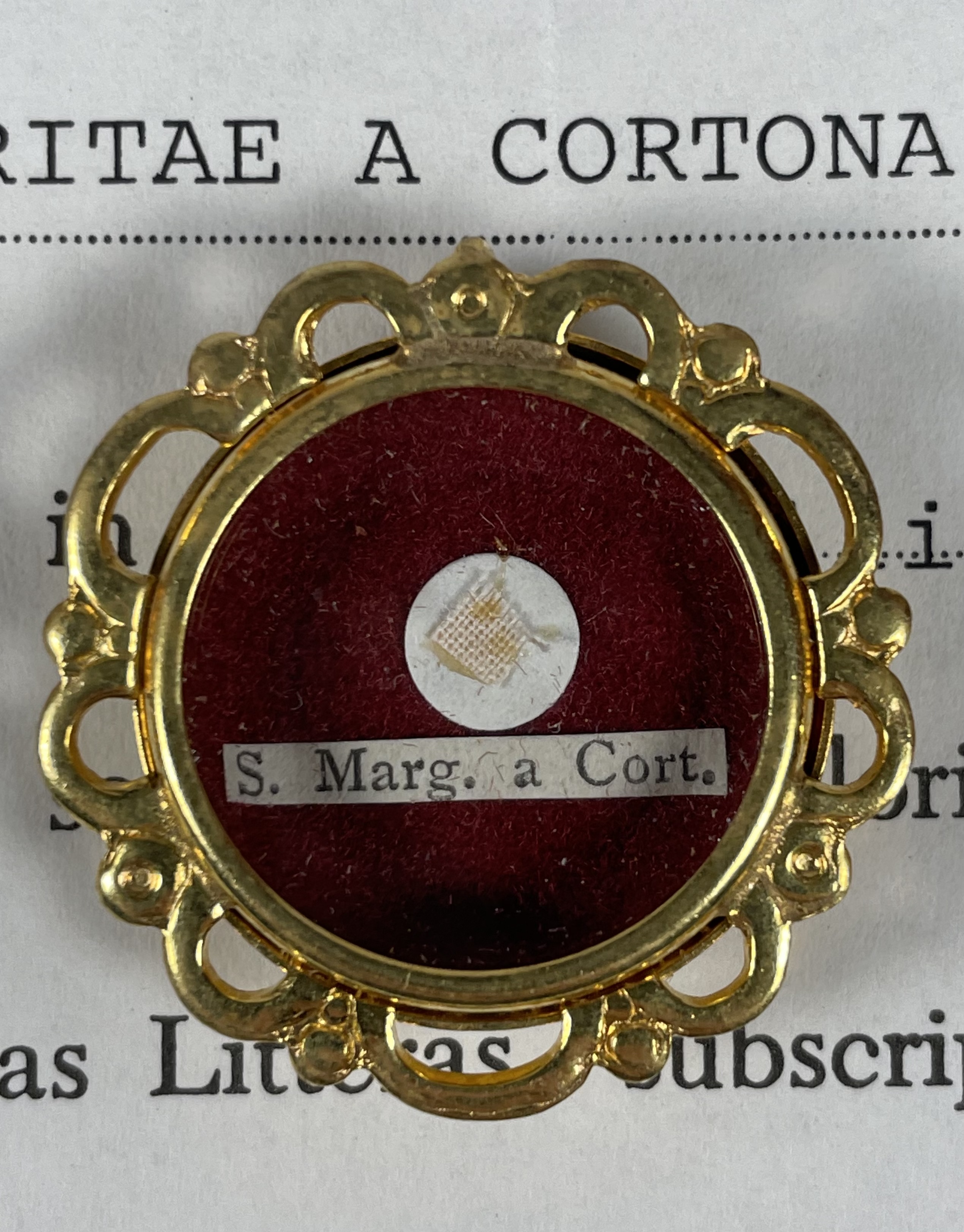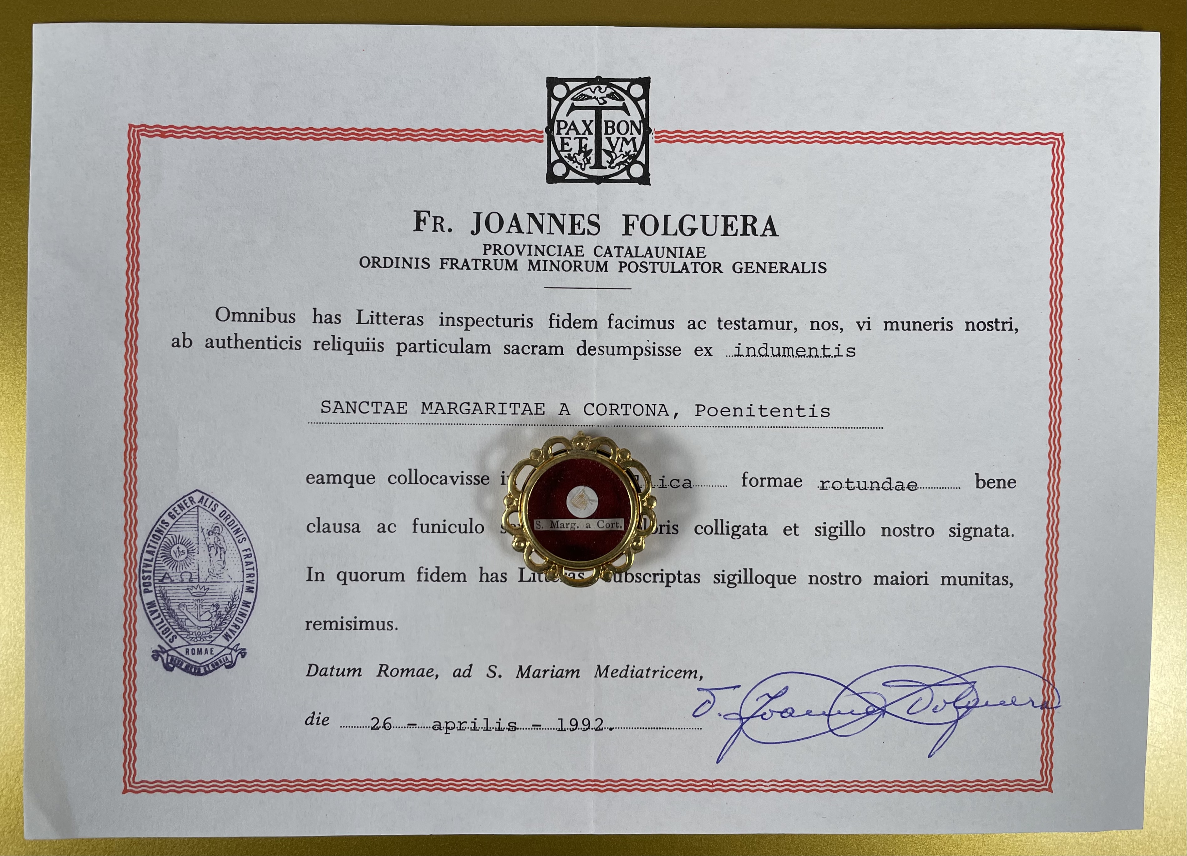 Saint Margaret of Cortona, T.O.S.F., (†1297) was an Italian penitent of the Third Order of St. Francis who was canonized in 1728. She is the patron saint of the falsely accused, hoboes, homeless, insane, orphaned, mentally ill, midwives, penitents, single mothers, reformed prostitutes, stepchildren, and tramps. Her body, found to be incorrupt even after 400 years, is preserved in a silver casket inside the church rebuilt in Cortona in her honor. Margaret was canonized by Pope Benedict XIII on 16 May 1728 and is honored with a Lesser Feast on the liturgical calendar of the Episcopal Church in the United States of America on 22 February.