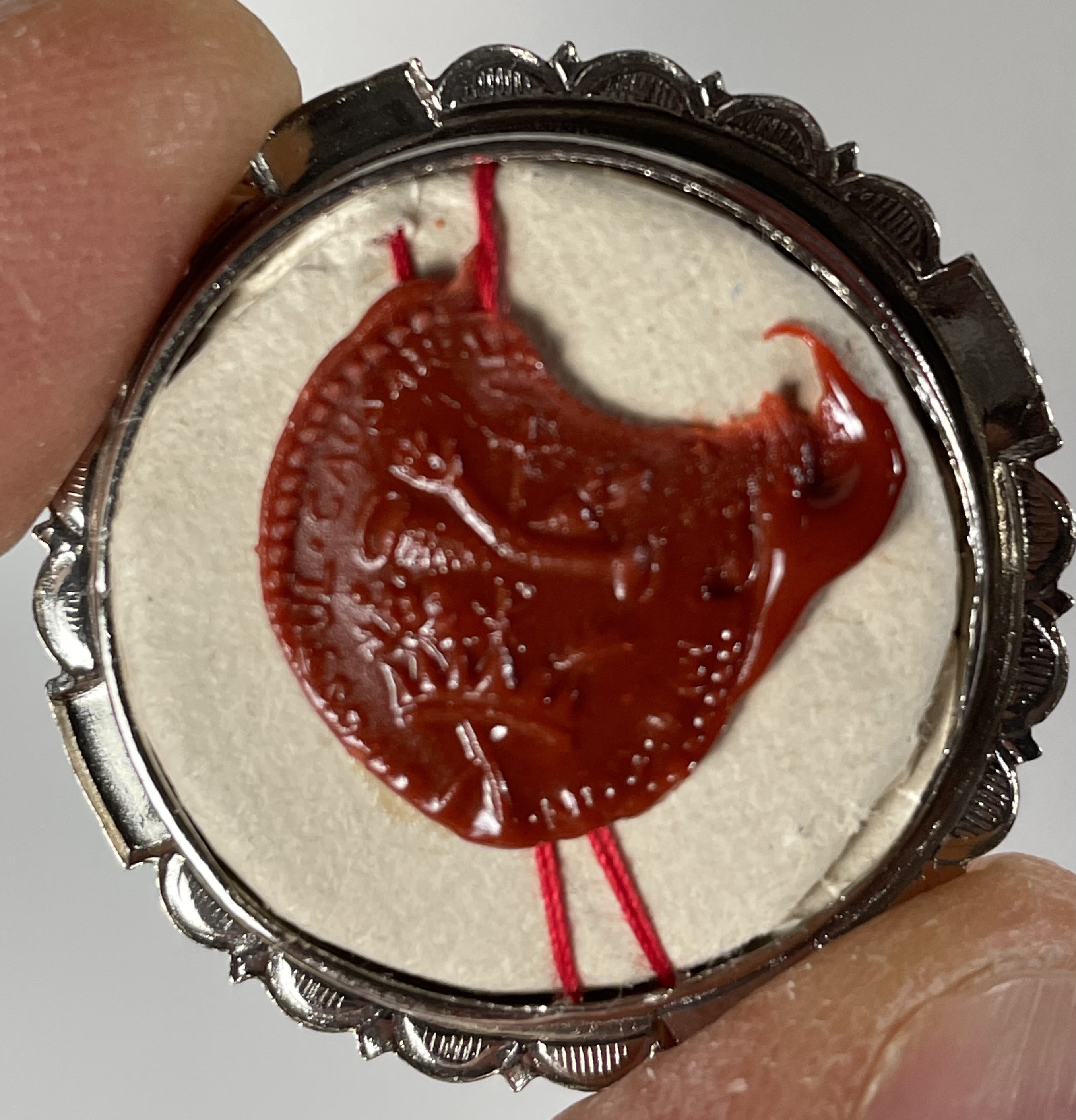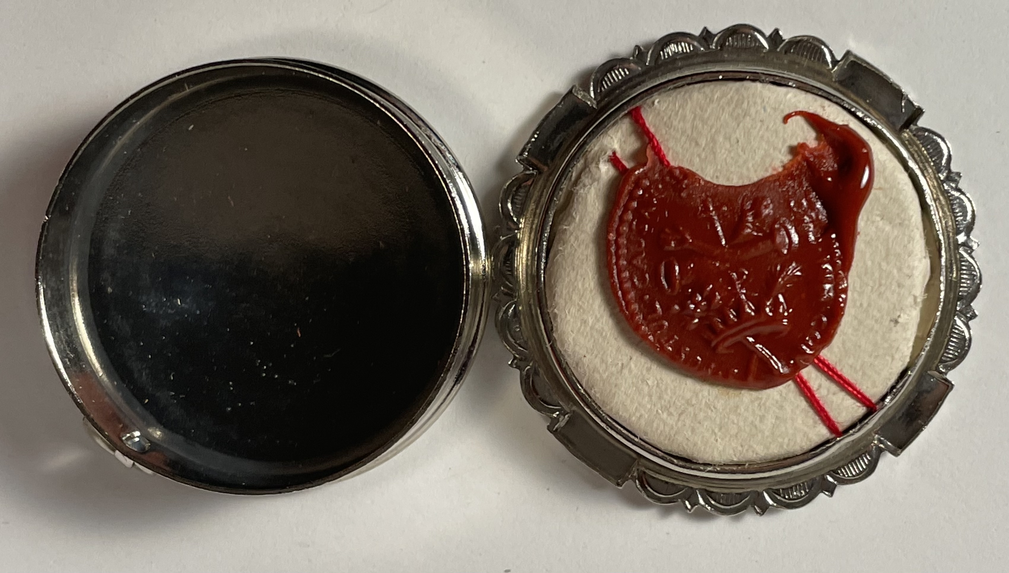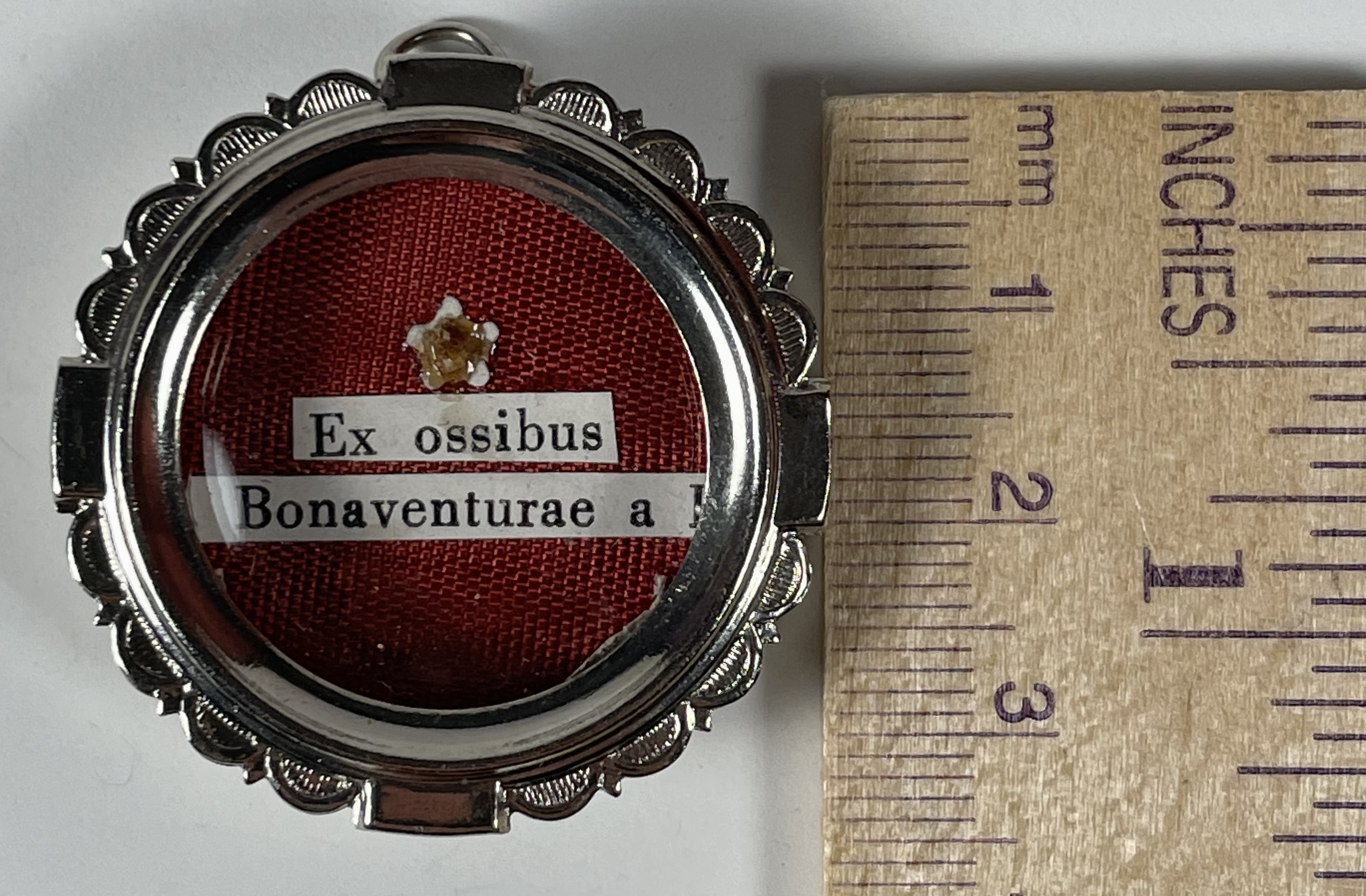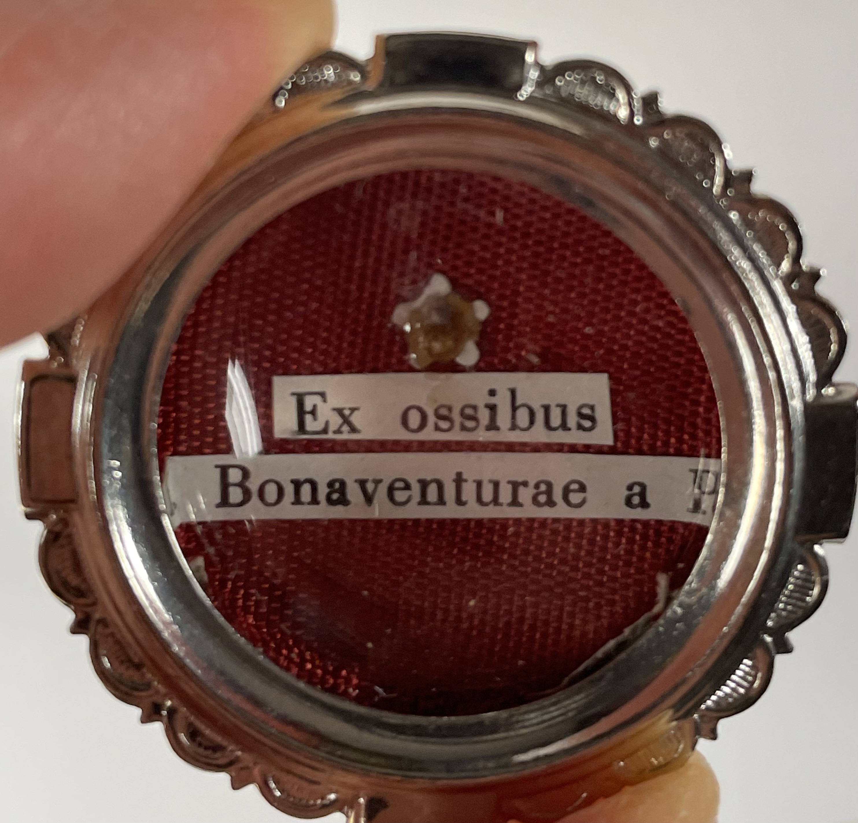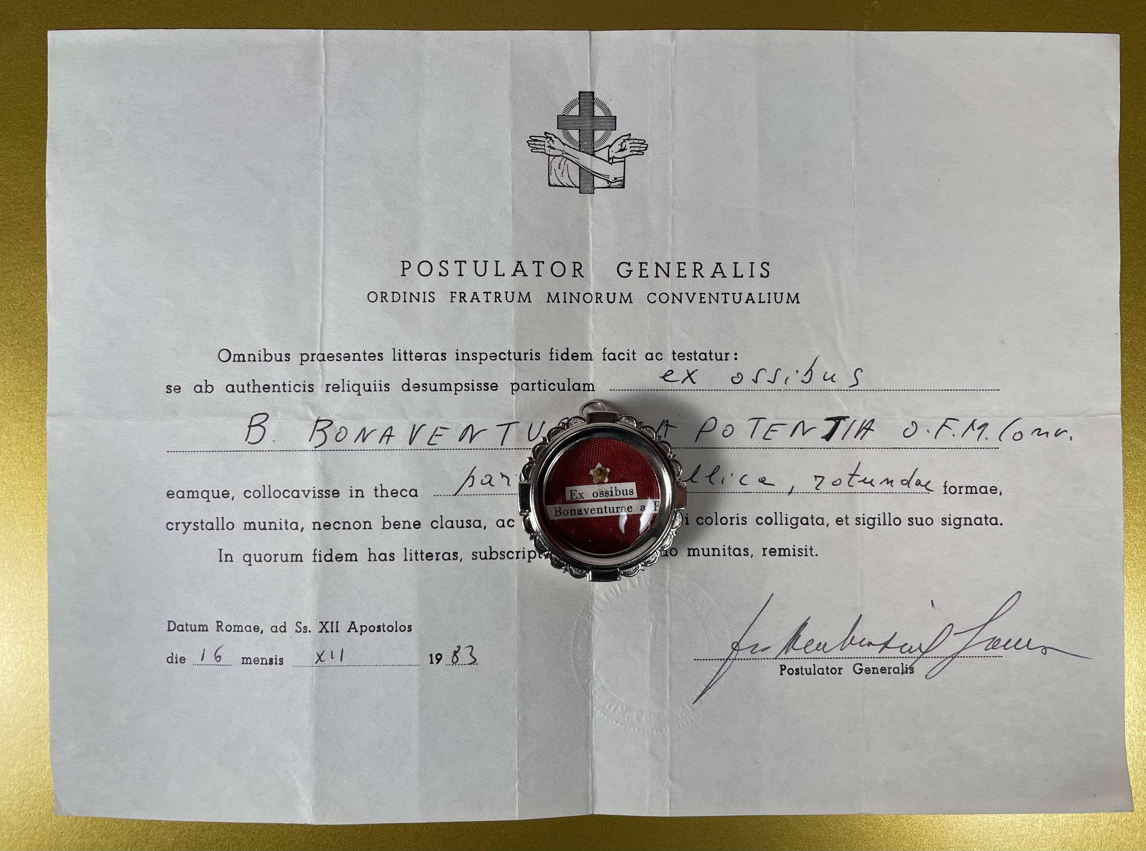 Round whiite-metal glass-fronted reliquary theca housing first-class ex ossibus  (of the bone) relic of the Blessed Bonaventure of Potenza, O.F.M.ConvThe relic is affixed to a red silk ground and identified in Latin on typeset cedula label as Ex ossibus / B. Bonaventurae a Pot. (Blessed Bonaventure of Potenza).  On the back, under a protective cap, the theca is secured with a seal of red Spanish wax bearing an imprint of a coat of arms of the Order of Friars Minor Conventual (the "Franciscans"). The relic is accompanied by the original matching authentics document issued and sealed in 1983 by the Postulator General of the Order responsible for the Causes of Canonization.