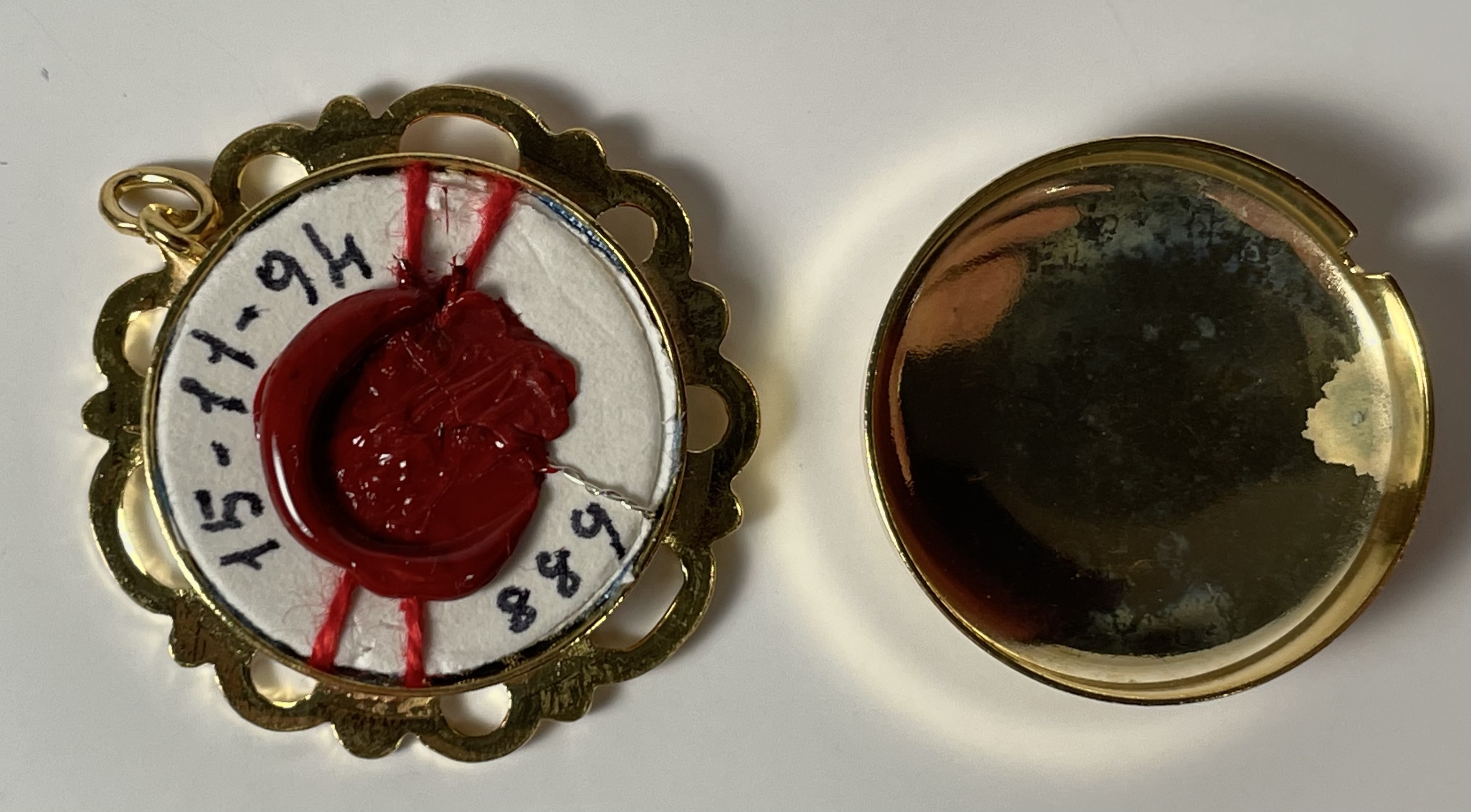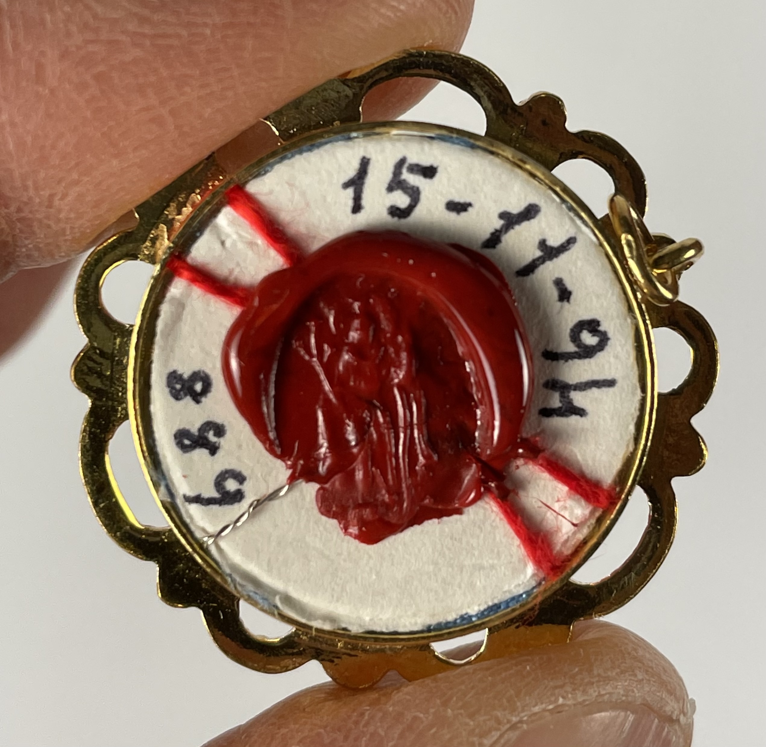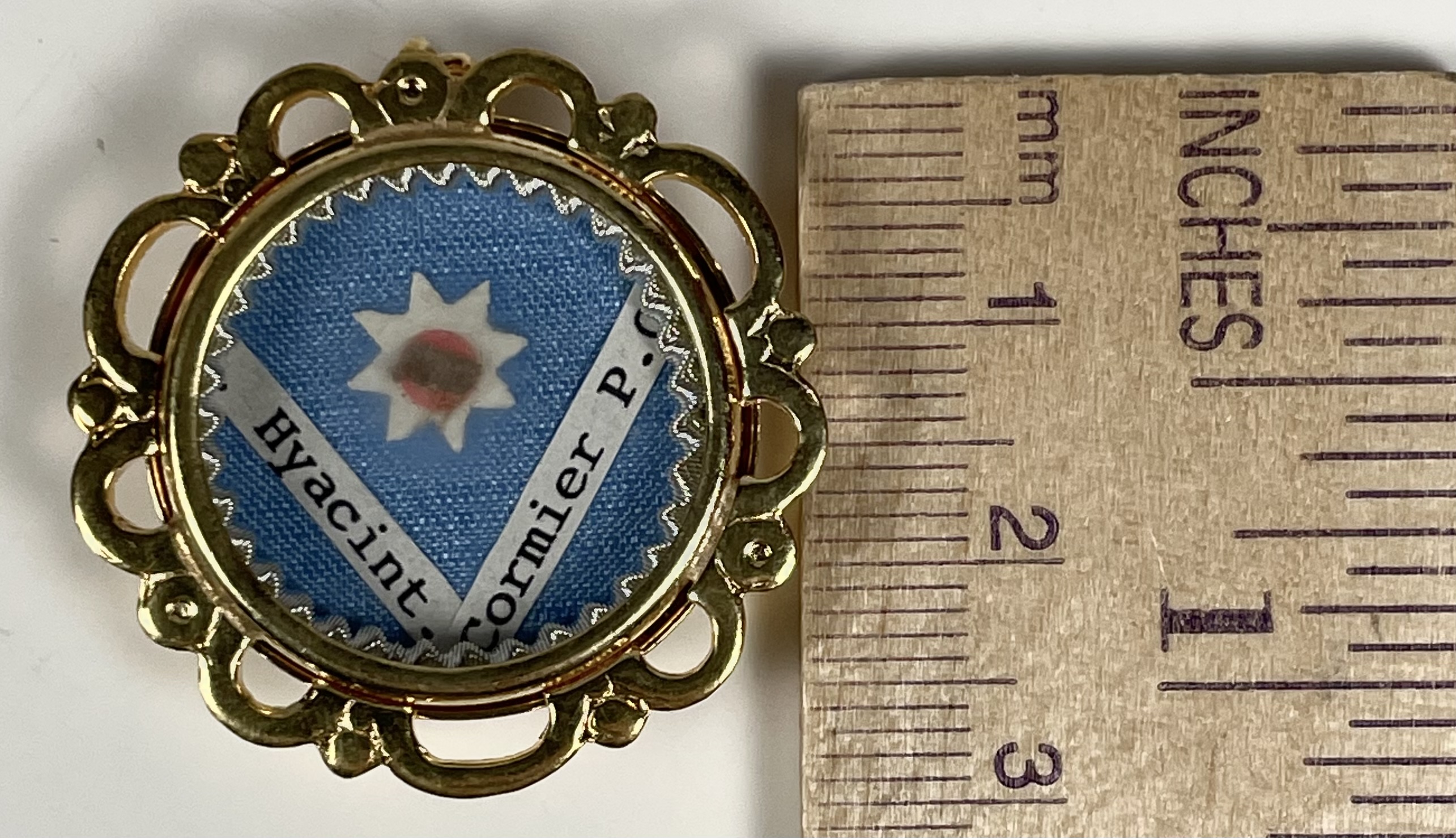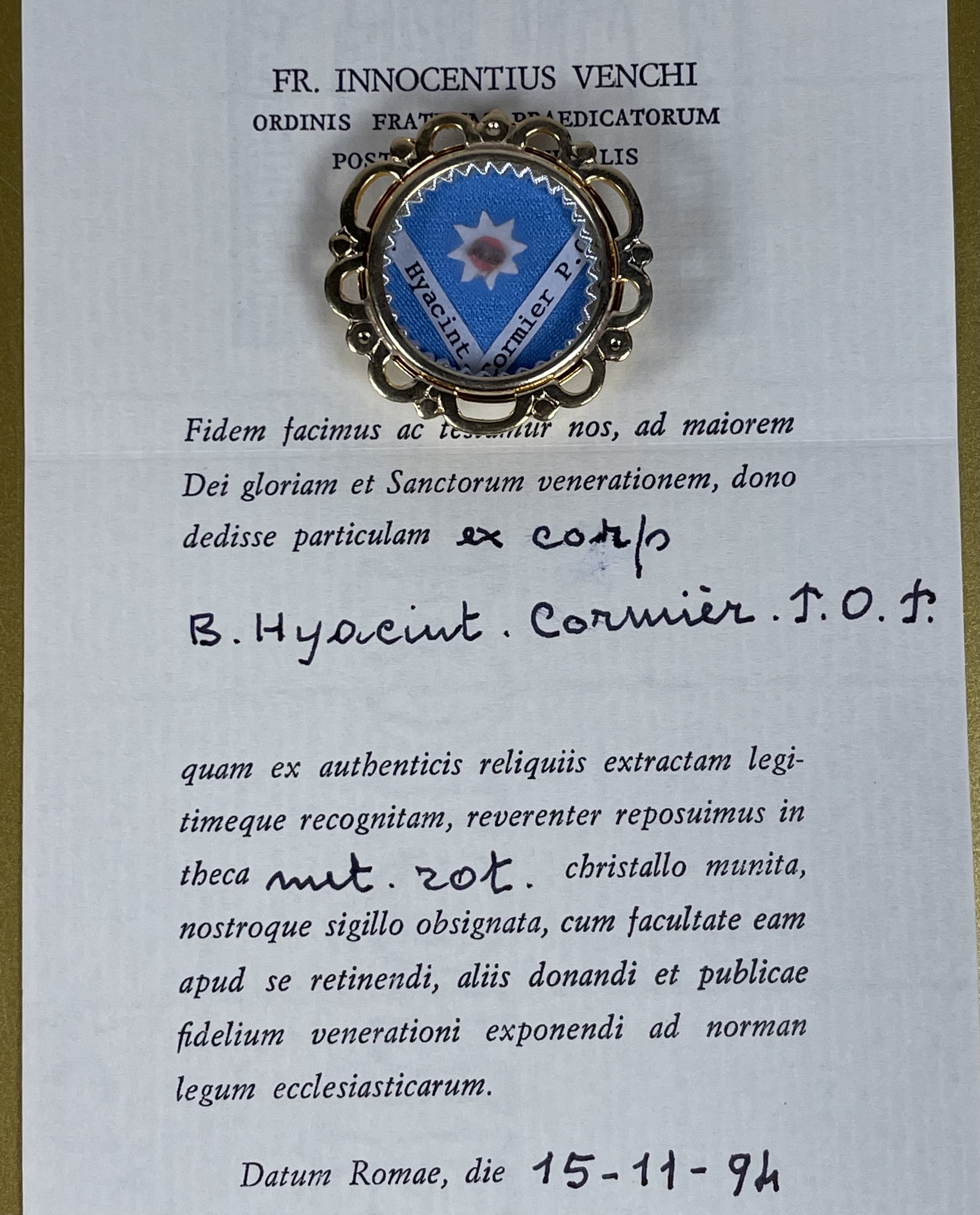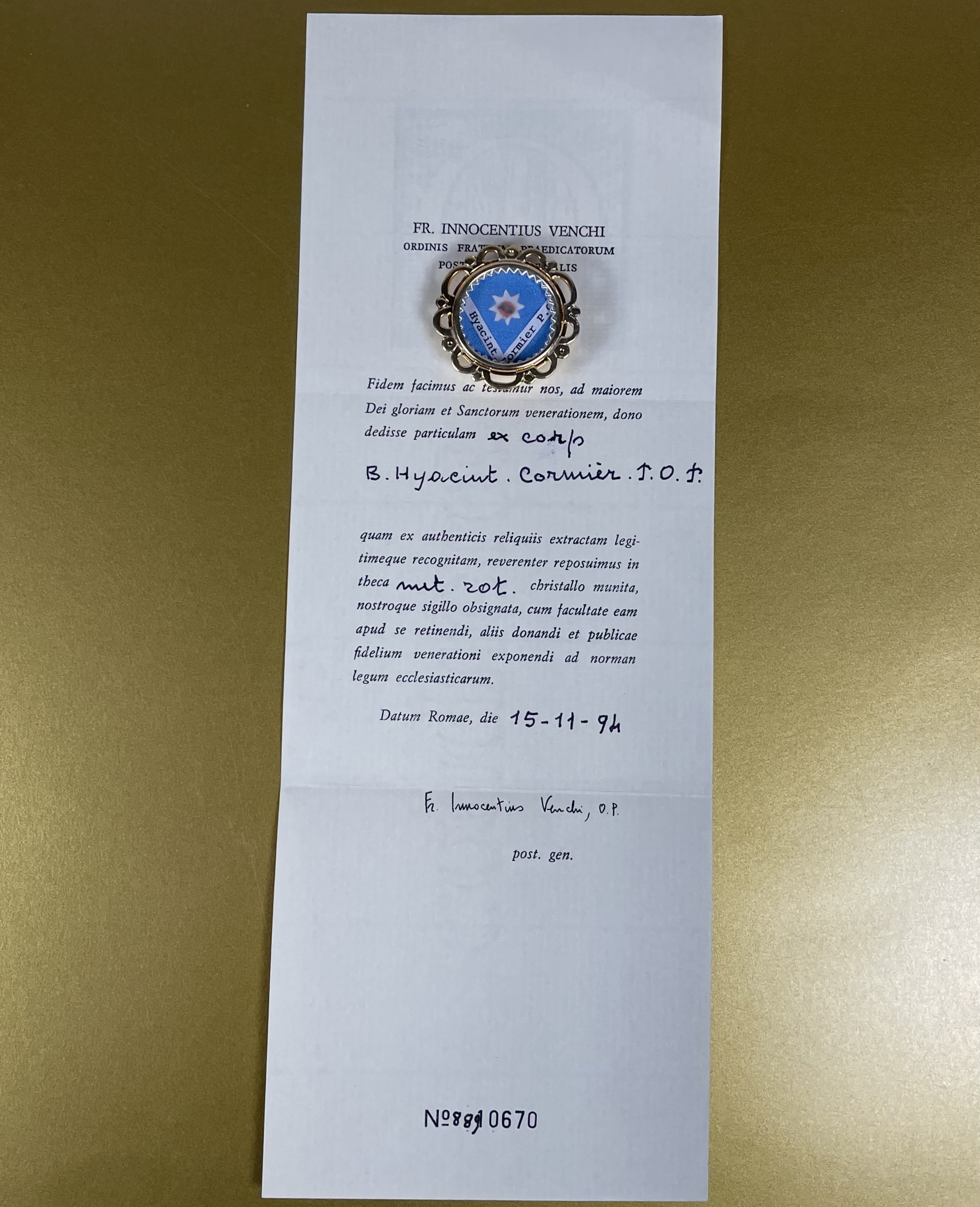 Round yellow-metal glass-fronted reliquary theca housing first-class ex corporis (of the body) relics of Saint Hyacinthe-Marie Cormier, O.P. The relic is affixed to a blue silk ground and identified in Latin on a typeset cedula label as B. Hyacint. Cormier P. O. [P.] (Saint Hyacinthe-Marie Cormier, Procurator of the Order of Preachers ) On the back, under a protective cap, the theca is secured with a seal of red Spanish wax bearing an imprint of a coat of arms of the Order of Friars Preachers (better known as the Dominicans). The relic is accompanied by an original matching authentics document issued and sealed by the Postulator General of the Order on November 15, 1995 - 5 days before His Beatification.