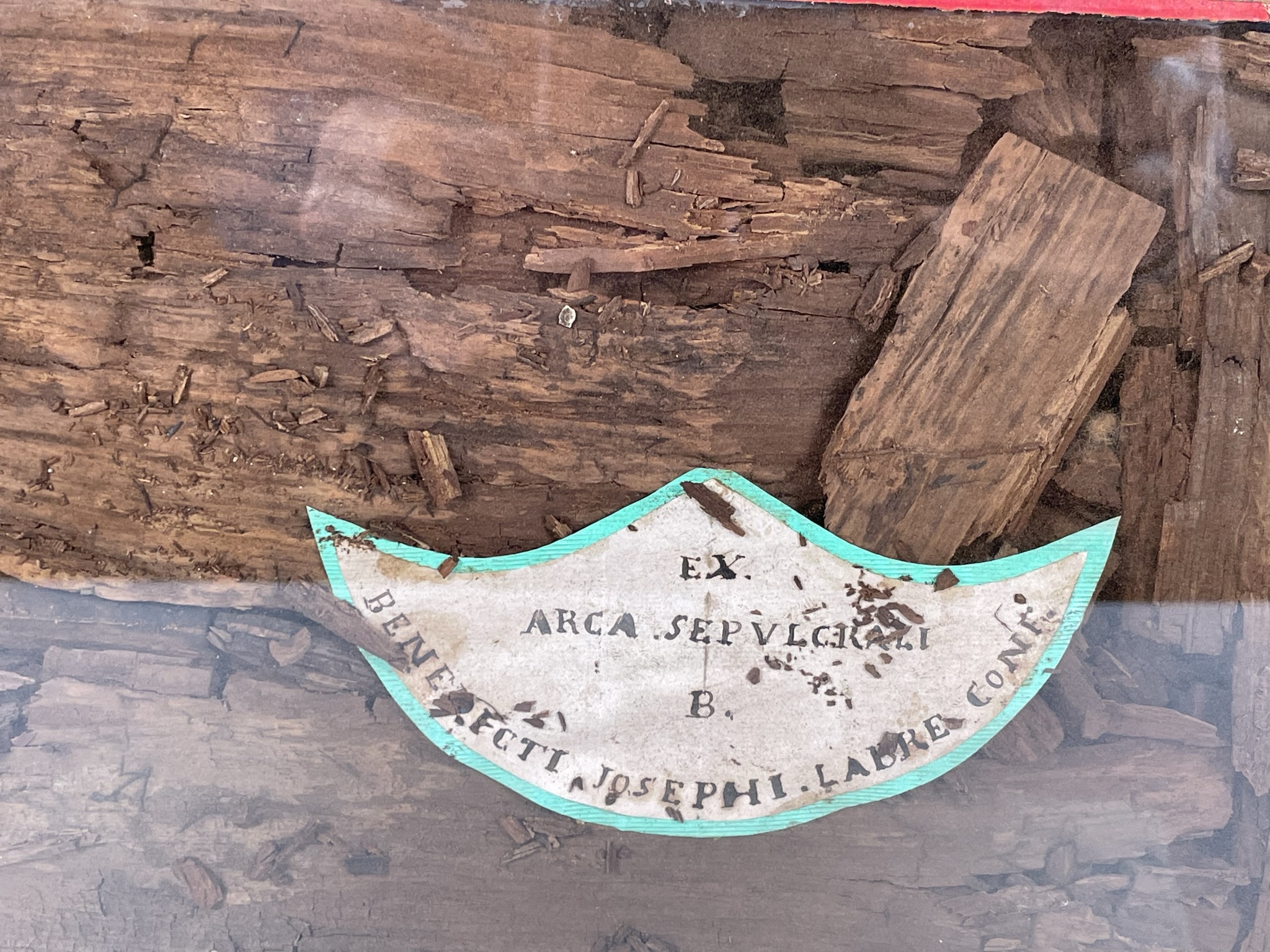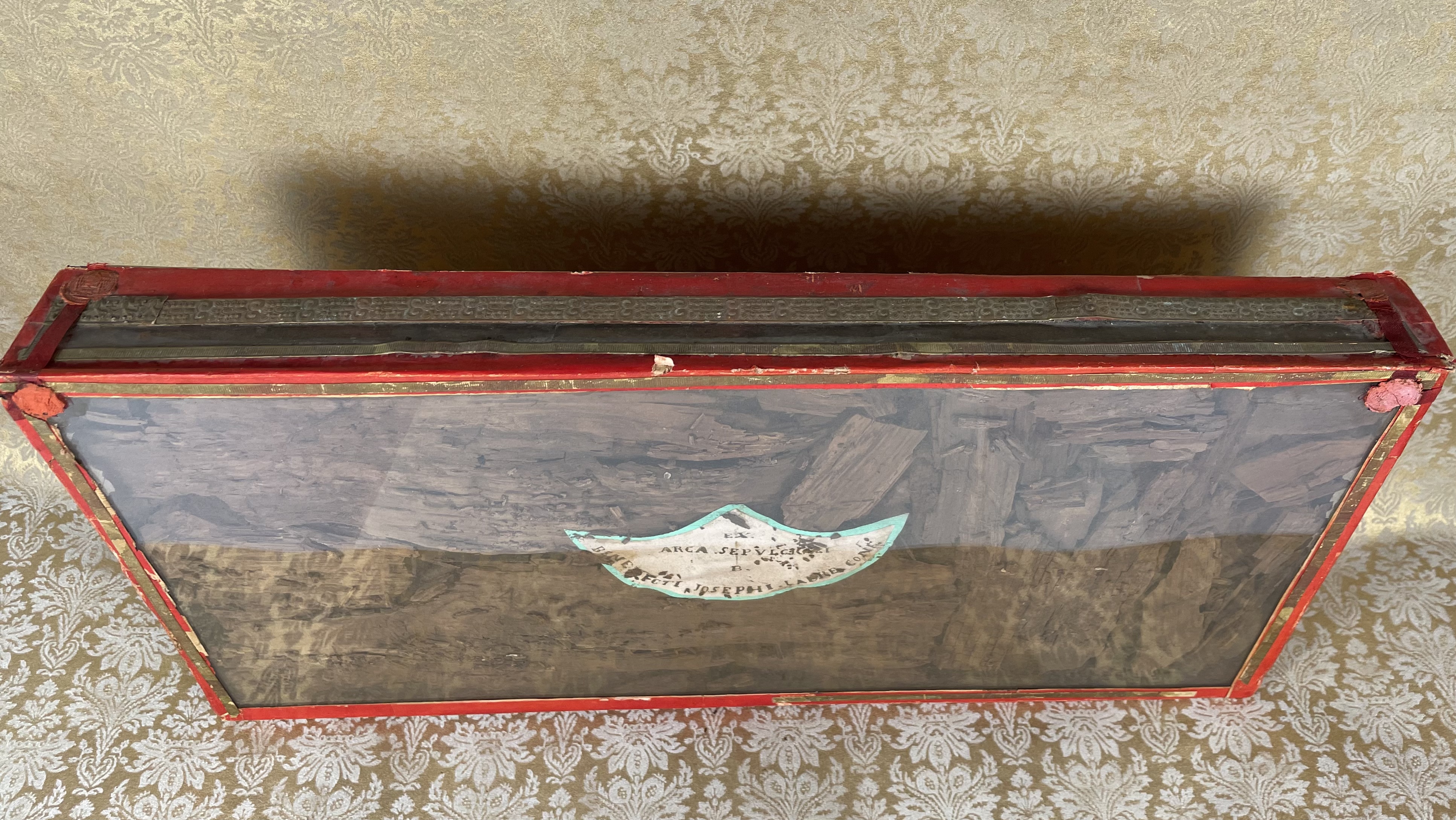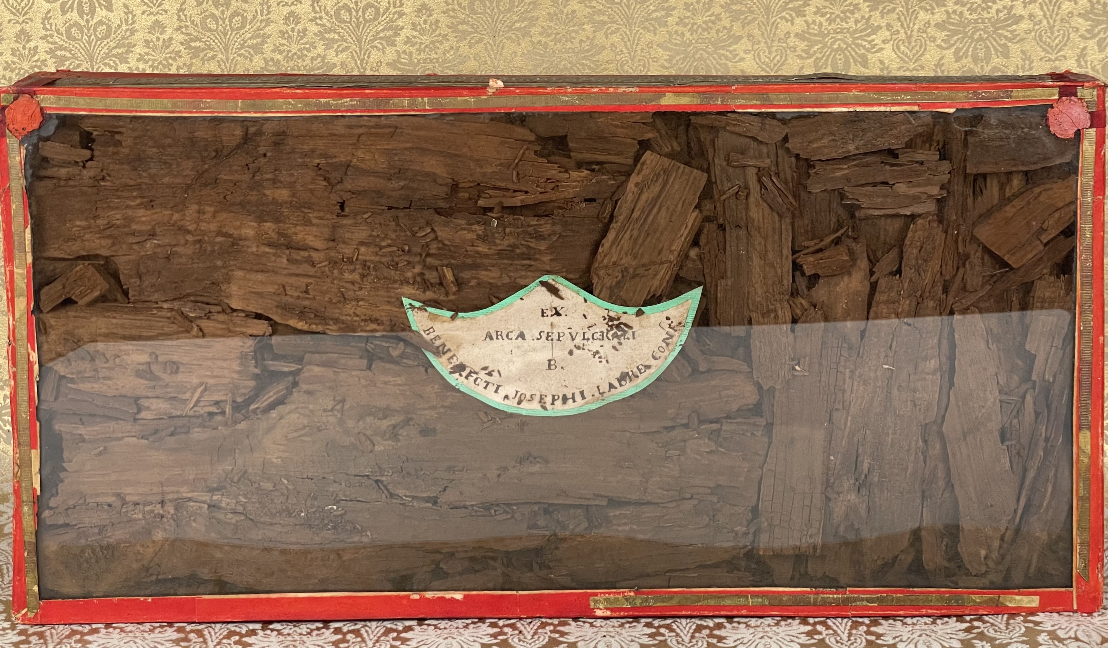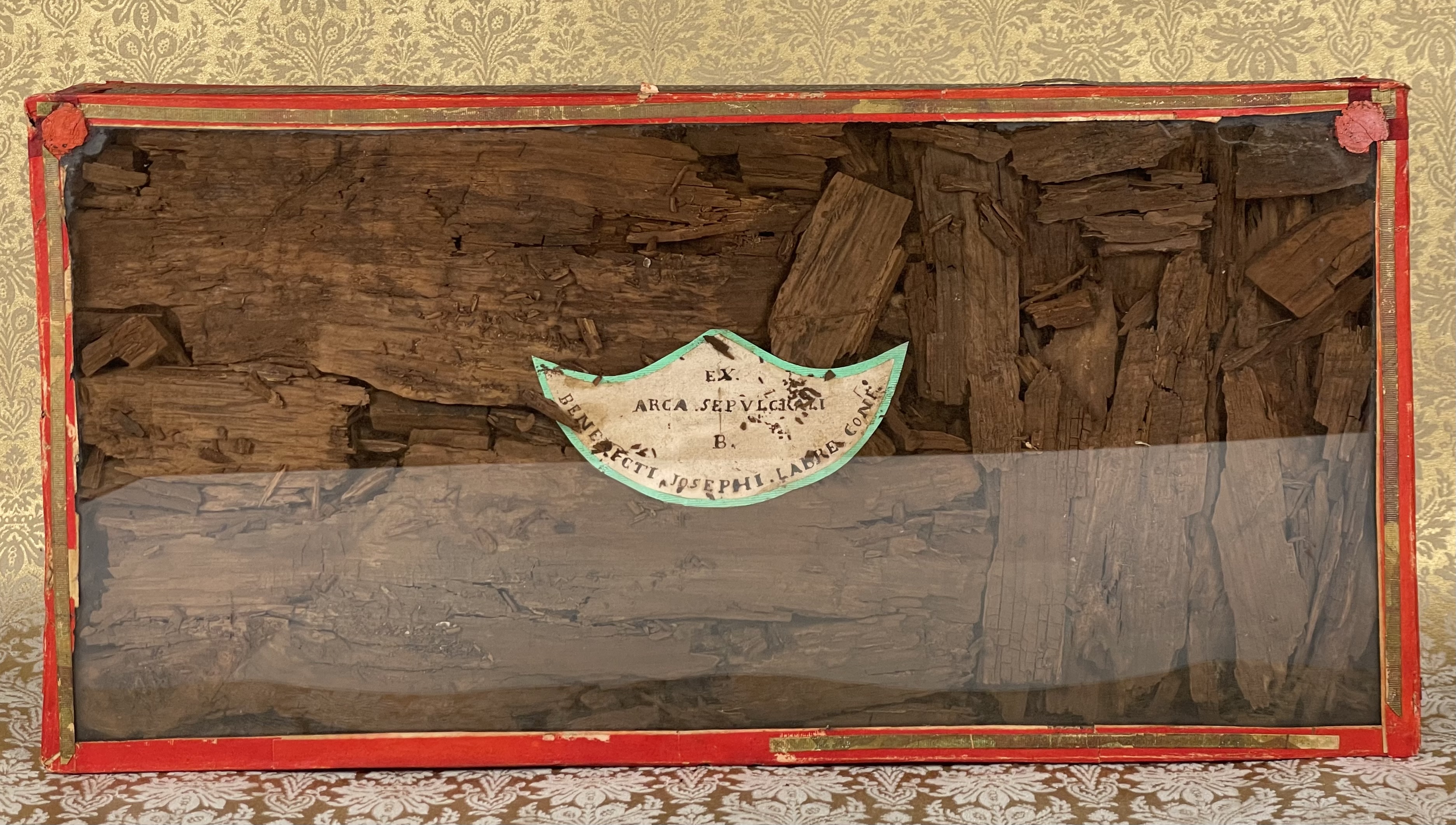 Rectangular glass-fronted reliquary housing very large and important second-class ex arca sepulcrali (of the burial coffin) pre-canonization relics of Saint Benedict Joseph Labre, T.O.S.F. The relics are contained inside of the reliquary box and identified in Latin on a manuscript cedula label as "ex arca sepulcrali  B. Benedictii Josephi Labre Conf." (from the burial coffin of the Blessed Benedict Joseph Labre, Confessor). The reliquary is secured by multiple seals of red Spanish wax bearing an imprint of a coat of arms of Monsignor Costantino Patrizi Naro (†1876), Dean of the College of Cardinals and the Vicar General of the Roman Curia.