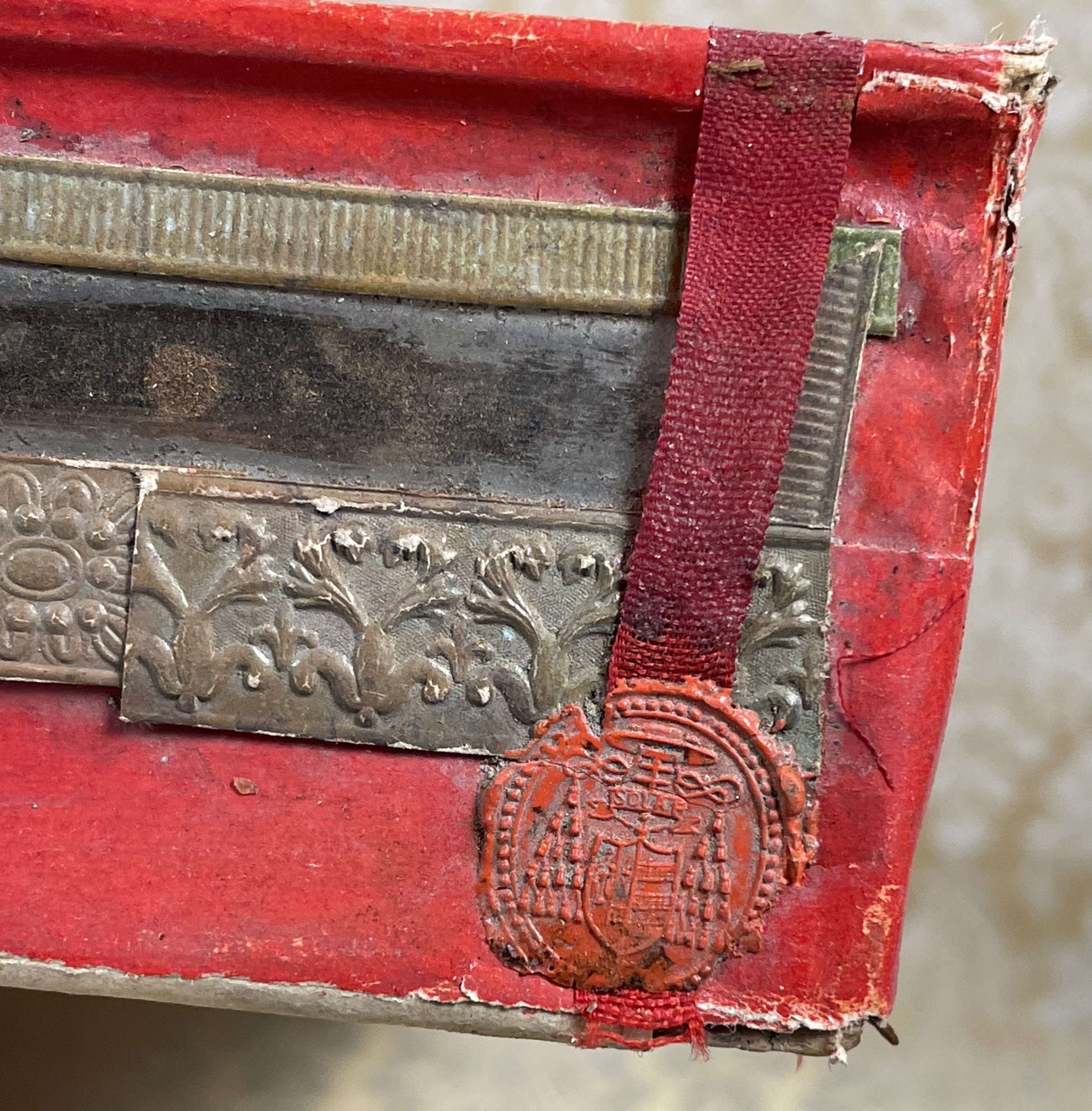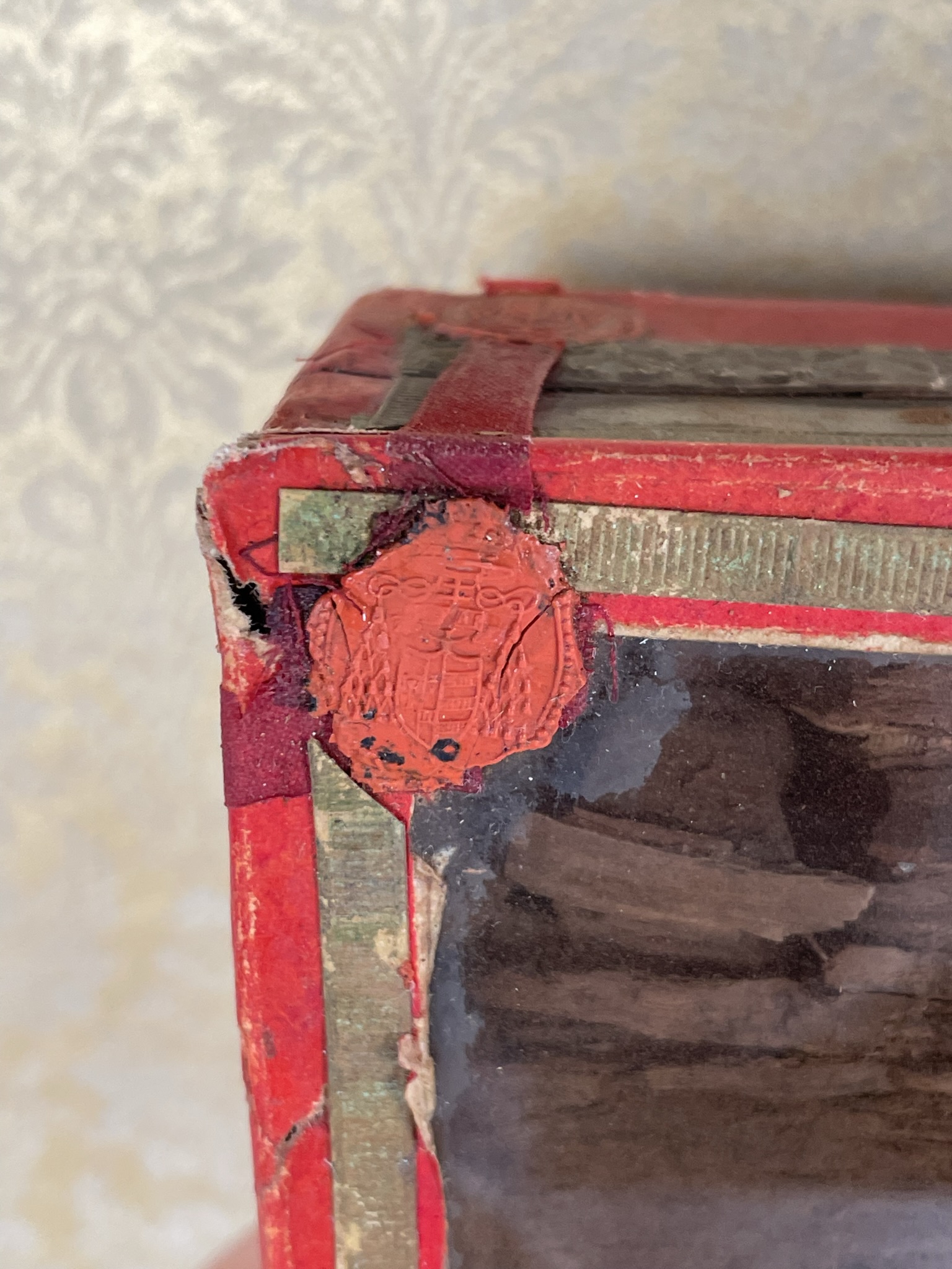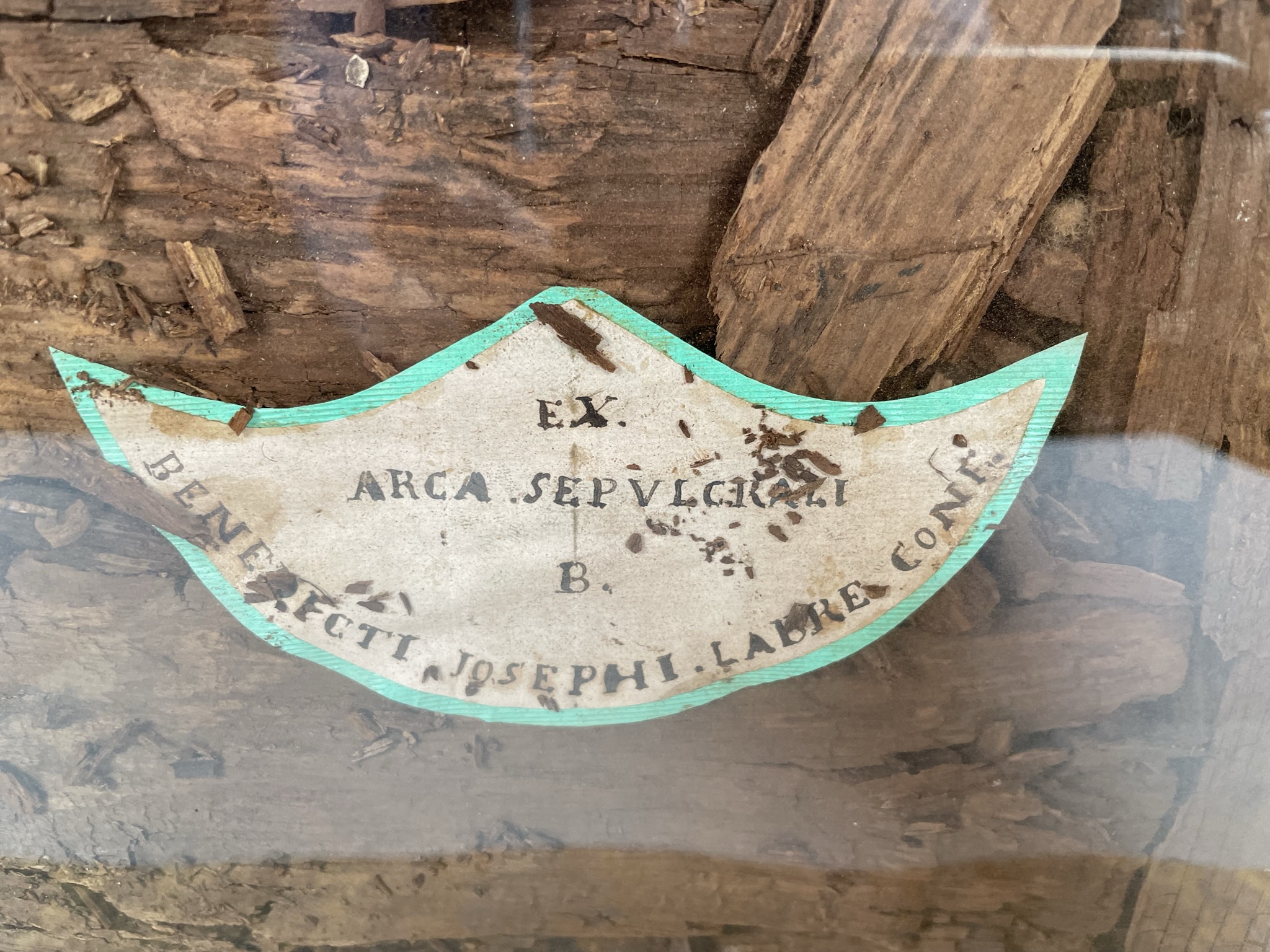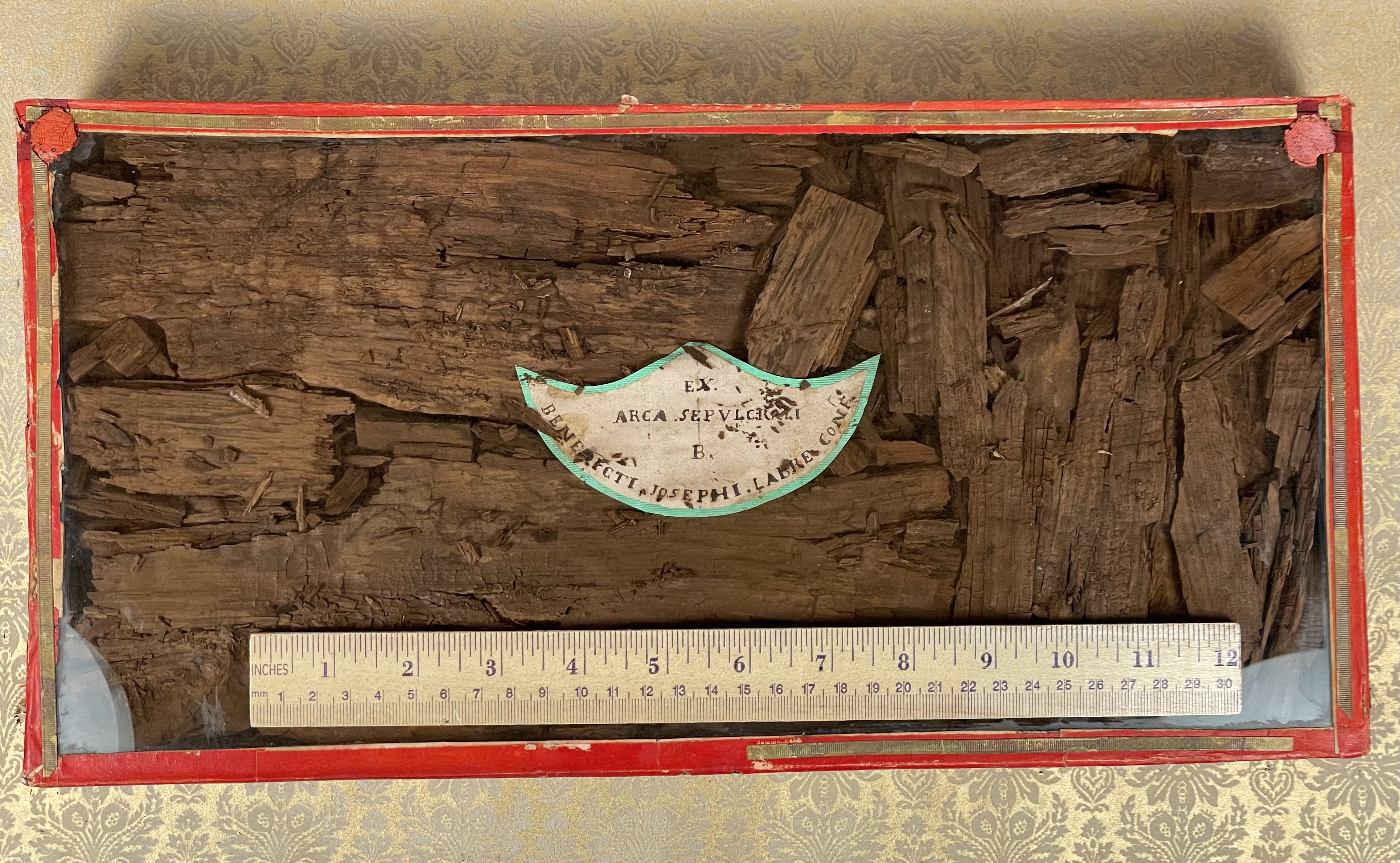 Rectangular glass-fronted reliquary housing very large and important second-class ex arca sepulcrali (of the burial coffin) pre-canonization relics of Saint Benedict Joseph Labre, T.O.S.F. The relics are contained inside of the reliquary box and identified in Latin on a manuscript cedula label as "ex arca sepulcrali  B. Benedictii Josephi Labre Conf." (from the burial coffin of the Blessed Benedict Joseph Labre, Confessor). The reliquary is secured by multiple seals of red Spanish wax bearing an imprint of a coat of arms of Monsignor Costantino Patrizi Naro (†1876), Dean of the College of Cardinals and the Vicar General of the Roman Curia.