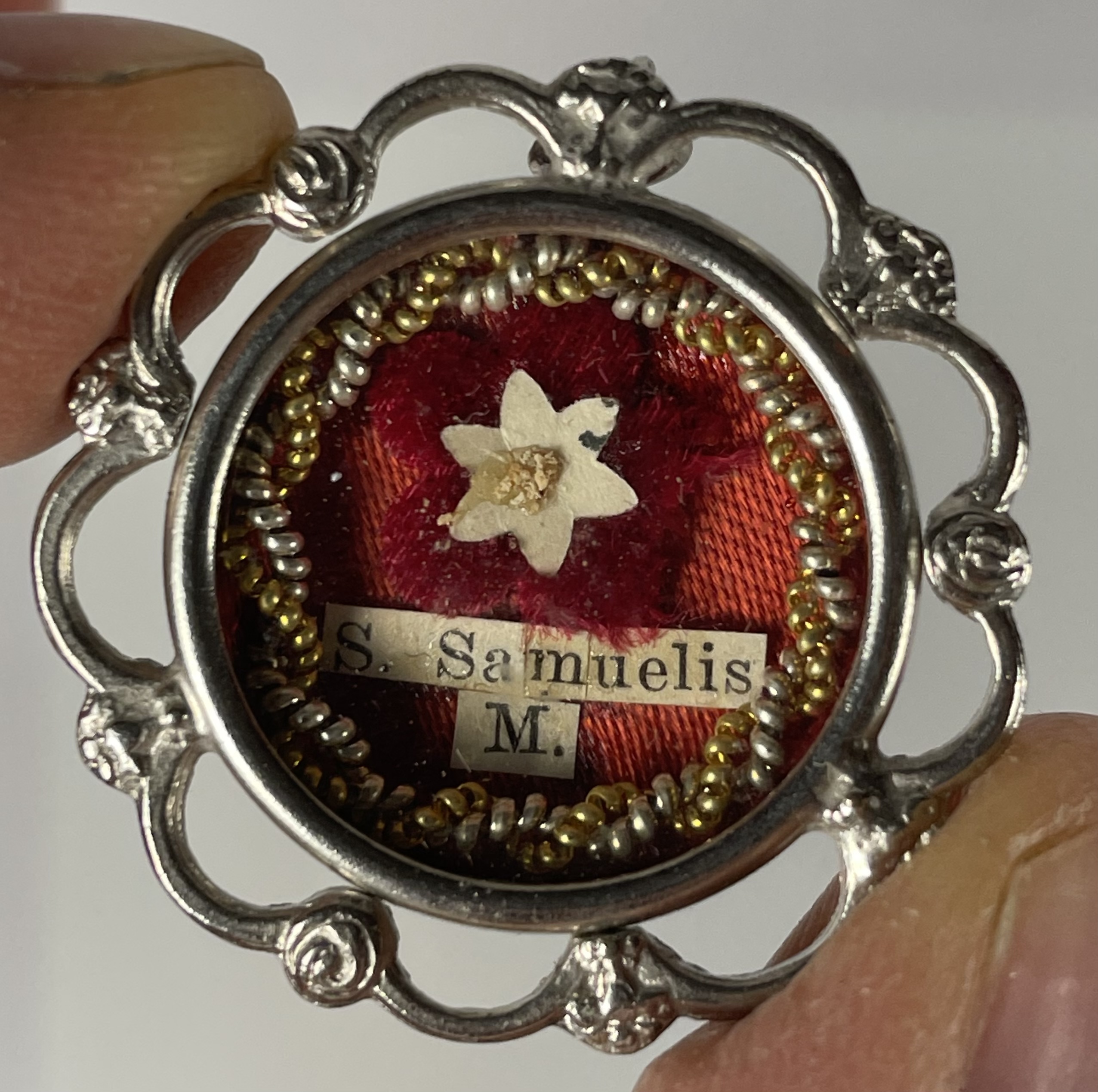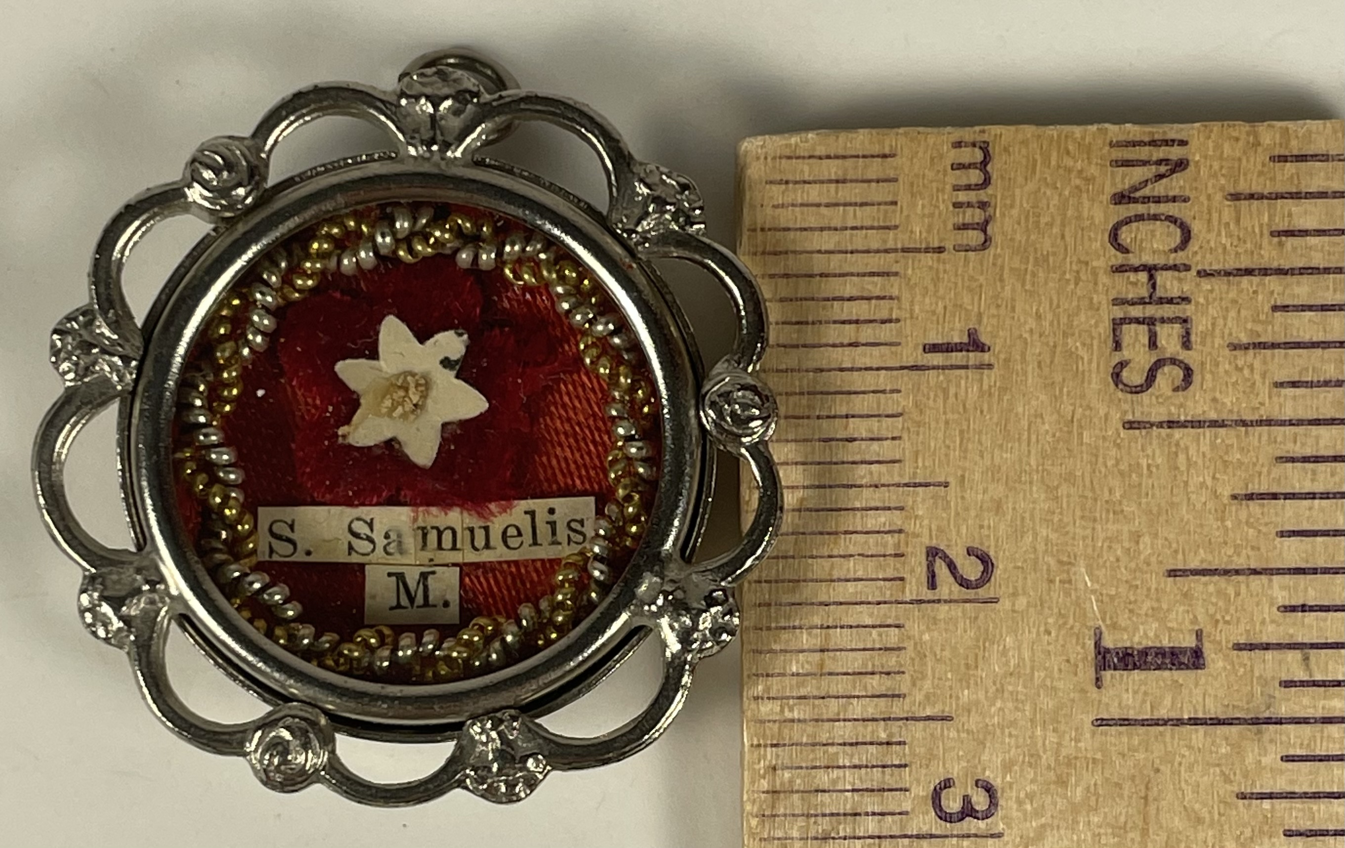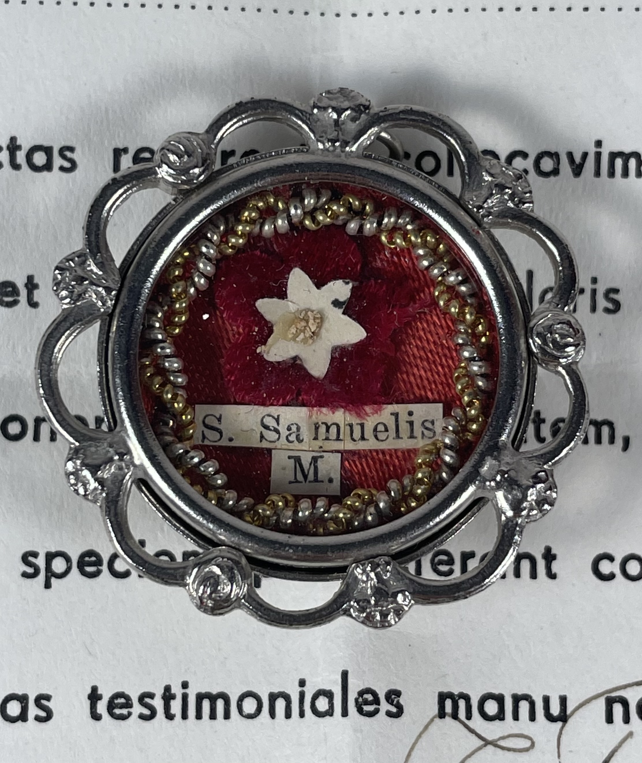 Round white-metal glass-fronted reliquary theca housing the first-class ex ossibus (of the bone) relic of Saint Samuel, Martyr. The relic is affixed to a red silk ground identified in Latin on a typeset cedula label as S. Samuelis M. (Saint Samuel, Martyr). On the back, under a protective cap, the theca is secured with a seal of red Spanish wax bearing an imprint of a coat of arms of Fr. Matteo Guido Sperandeo (†1987), Bishop of Calvi e Teano, Italy. The relic is accompanied by the original matching authentics document issued in 1957 by Bishop Sperandeo.