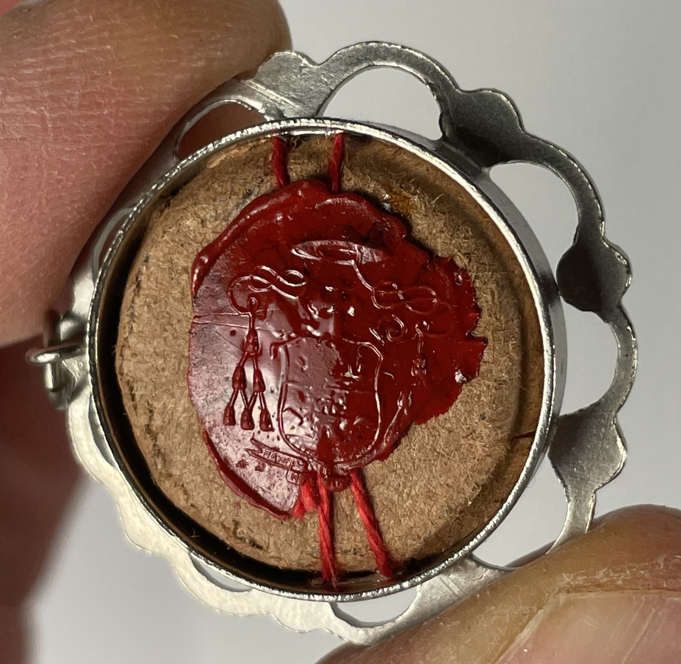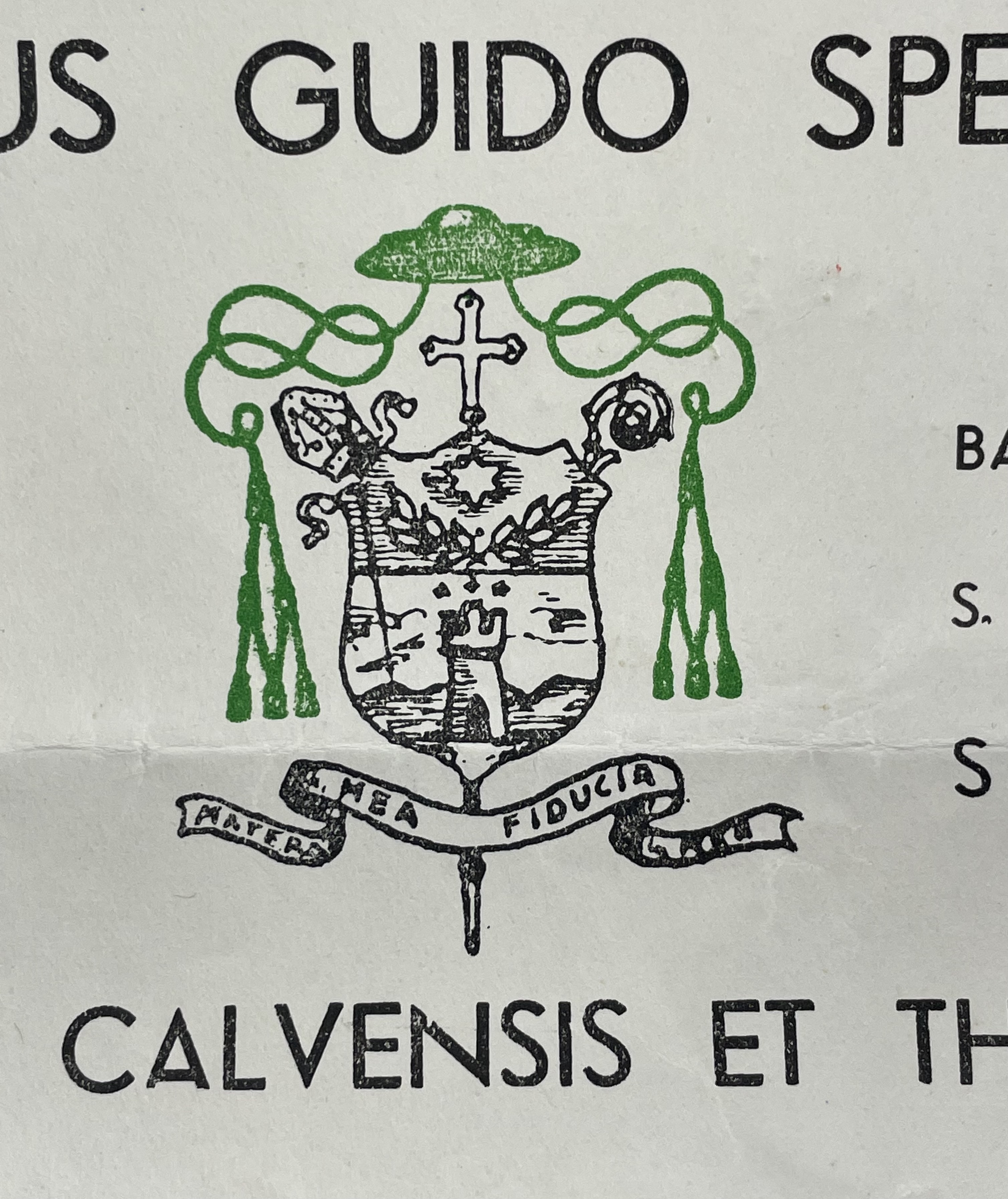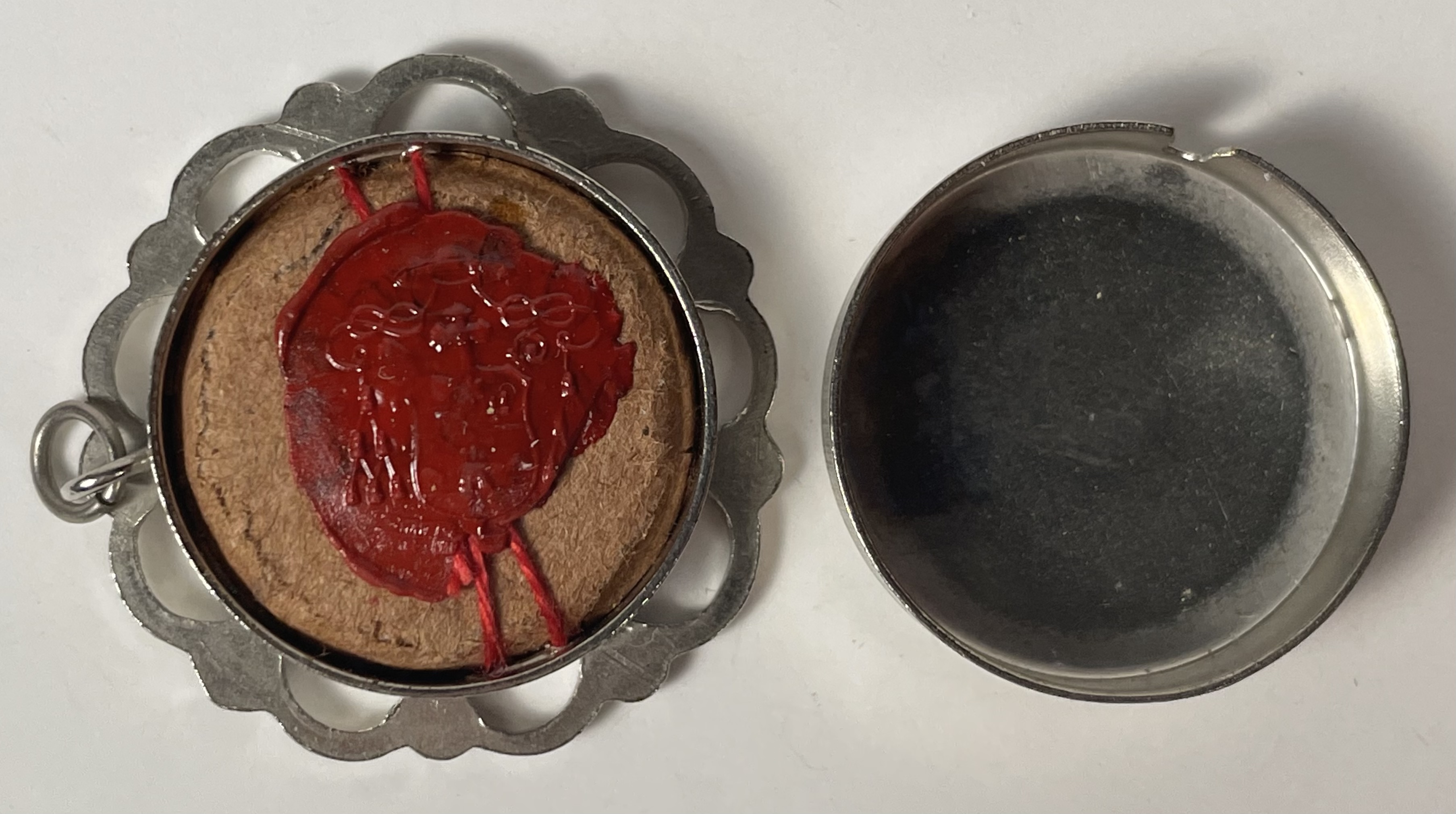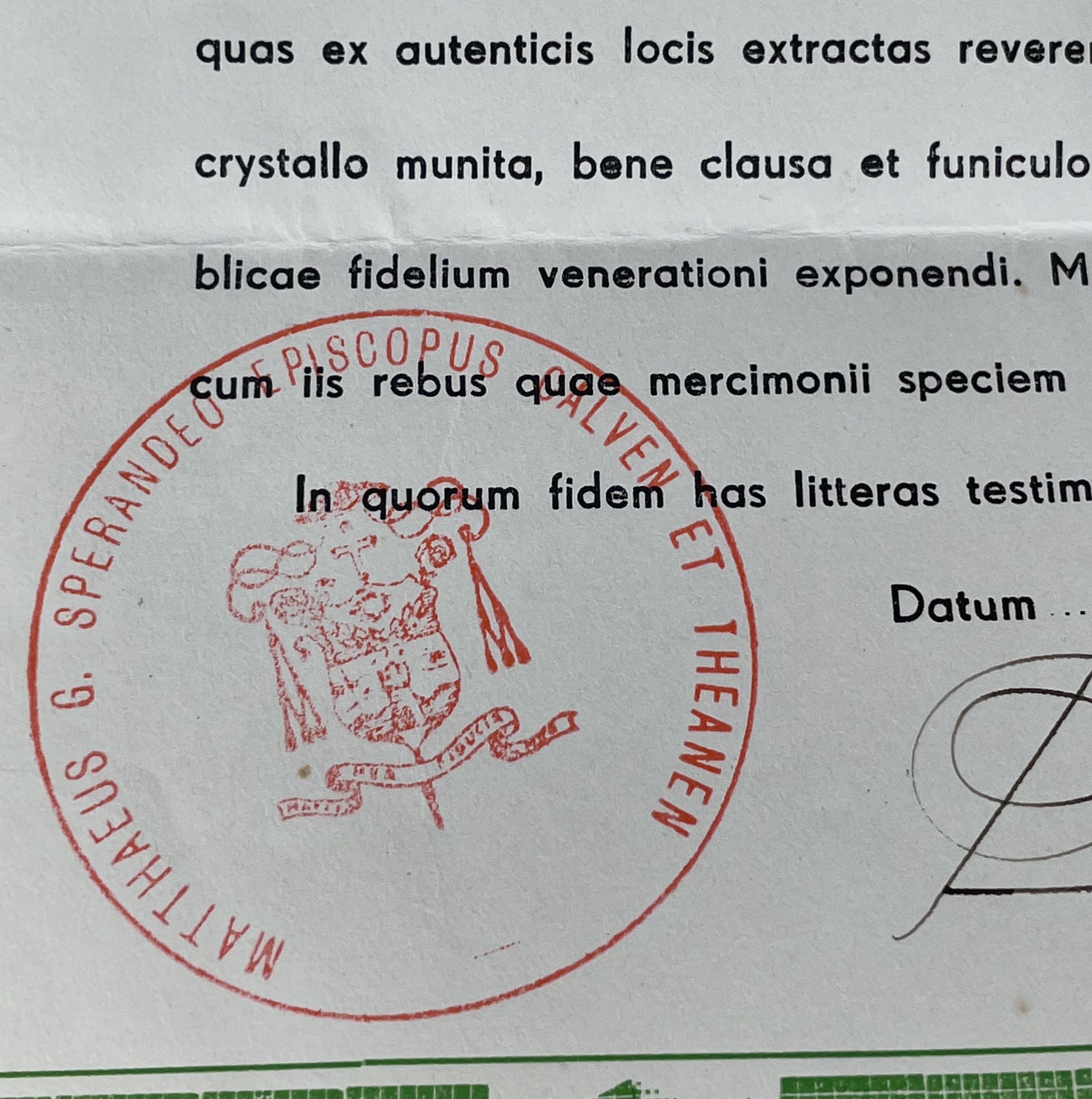 Round white-metal glass-fronted reliquary theca housing the first-class ex ossibus (of the bone) relic of Saint Samuel, Martyr. The relic is affixed to a red silk ground identified in Latin on a typeset cedula label as S. Samuelis M. (Saint Samuel, Martyr). On the back, under a protective cap, the theca is secured with a seal of red Spanish wax bearing an imprint of a coat of arms of Fr. Matteo Guido Sperandeo (†1987), Bishop of Calvi e Teano, Italy. The relic is accompanied by the original matching authentics document issued in 1957 by Bishop Sperandeo.