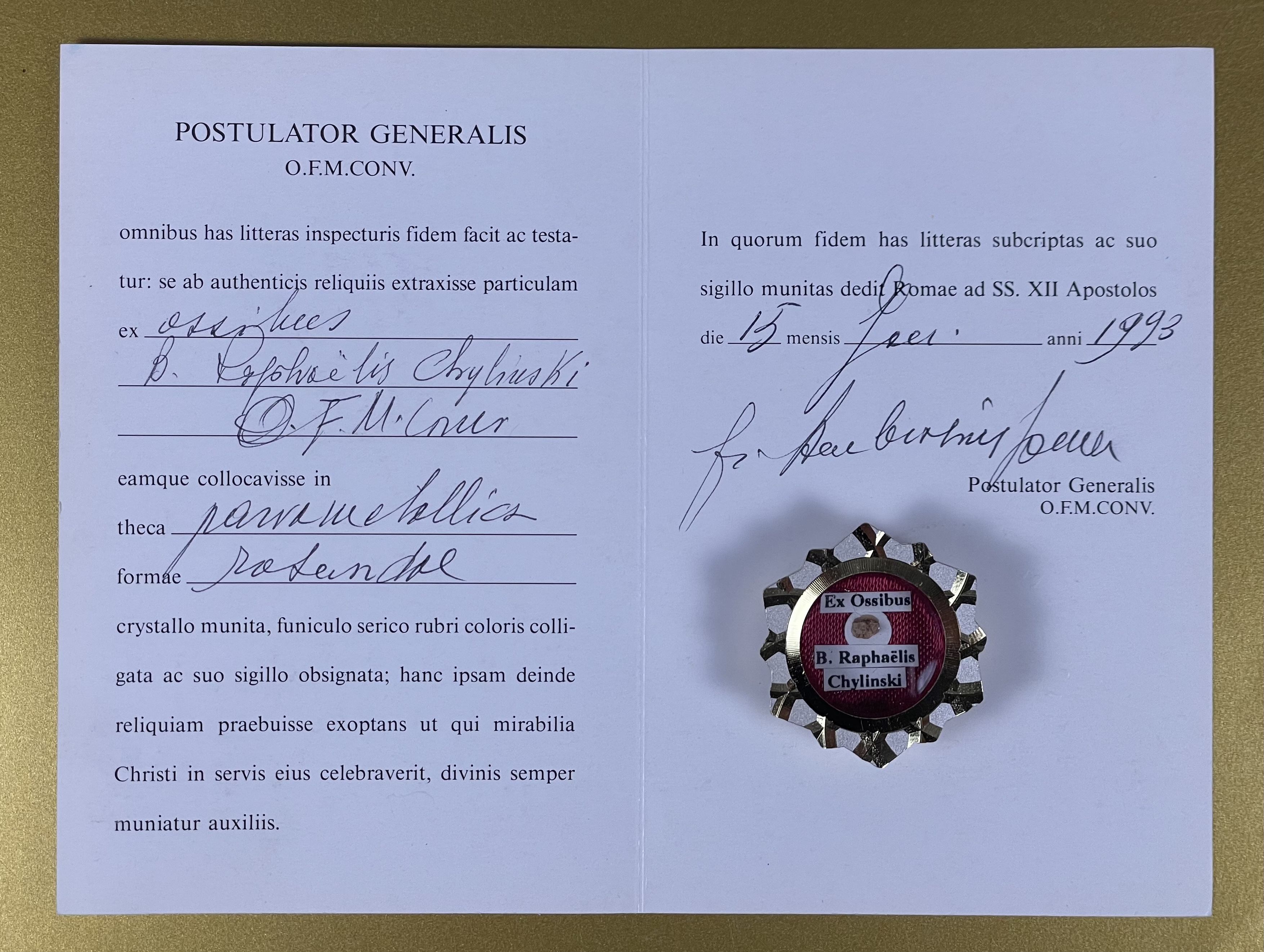 Blessed Rafał Chyliński (†1741) was a Polish Roman Catholic priest and a professed member of the Order of Friars Minor Conventual. He first served as a soldier but decided to become a priest instead and so entered the Franciscans and made his profession prior to ordination. He also became known for his simplistic preaching and for his generous outreach to the poor through the distribution of clothing and food. His beatification was celebrated on 9 June 1991 in the capital of Warsaw on the occasion of Pope John Paul II visiting the nation. His Feast day is celebrated on December 2.