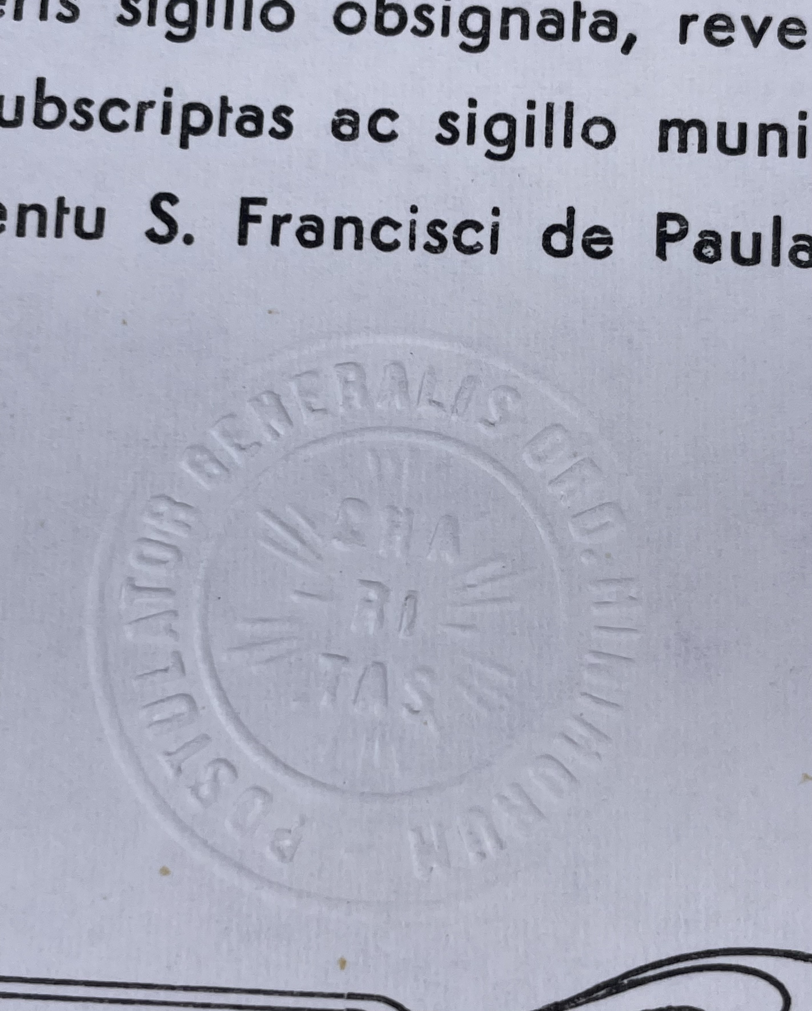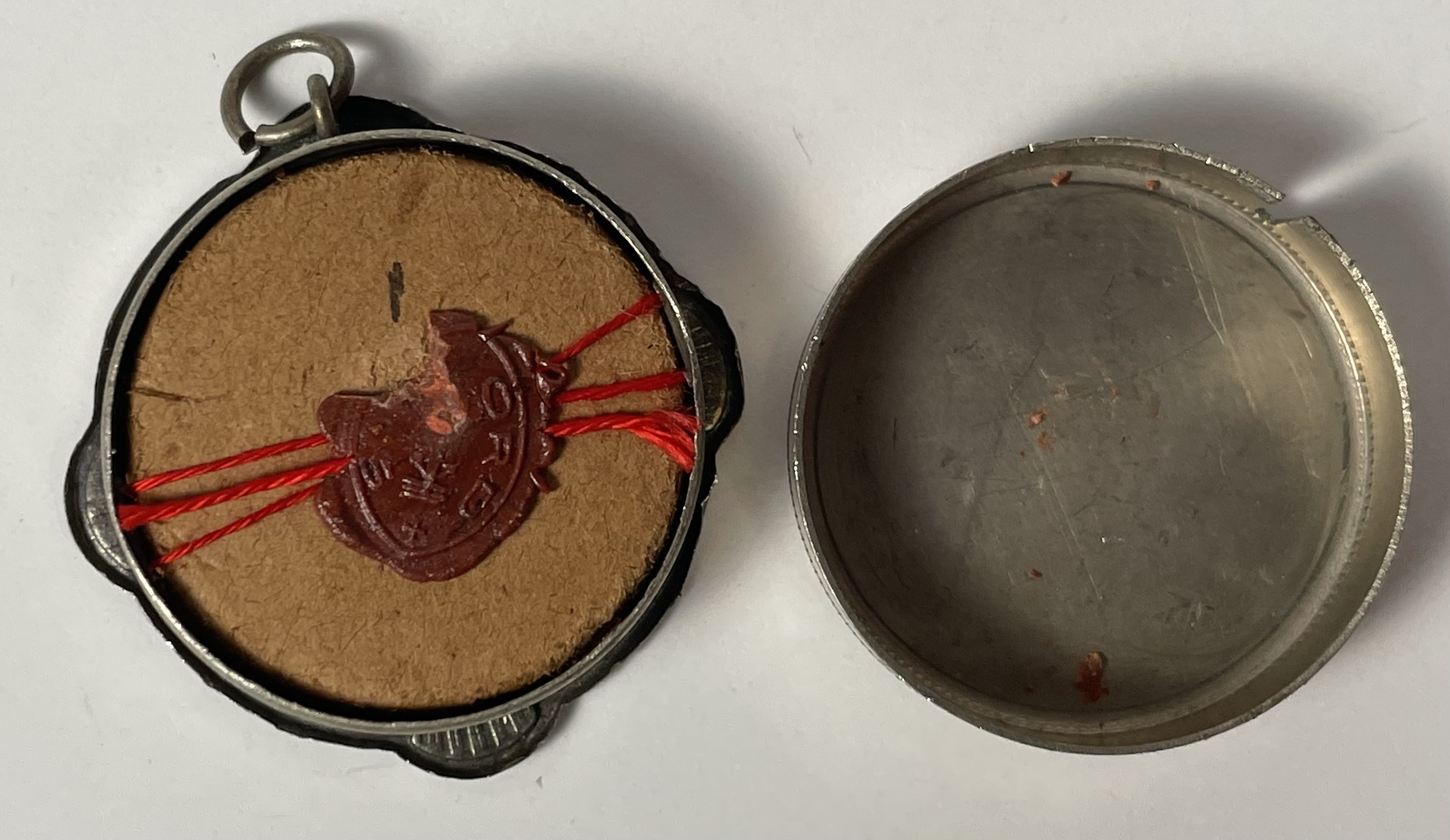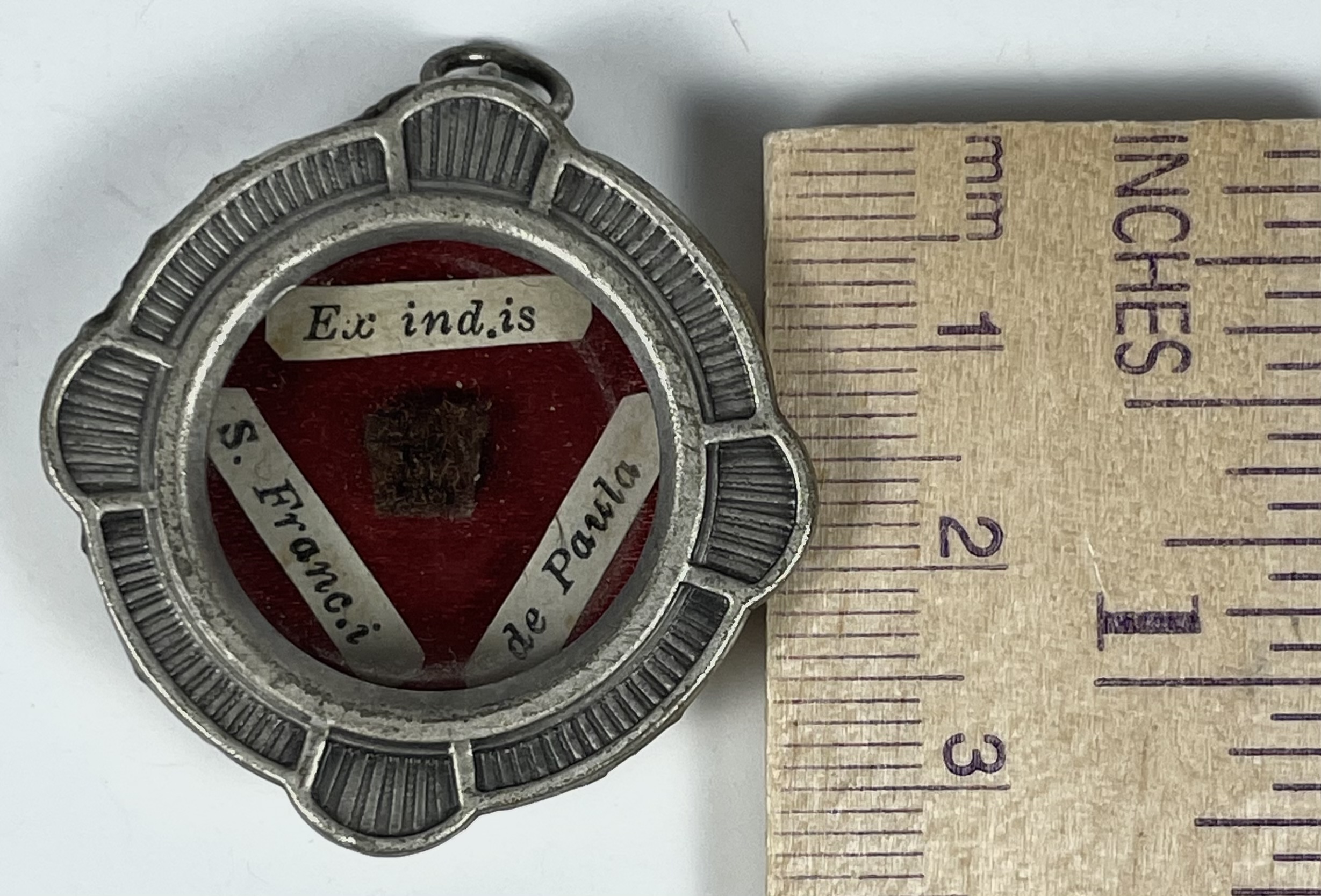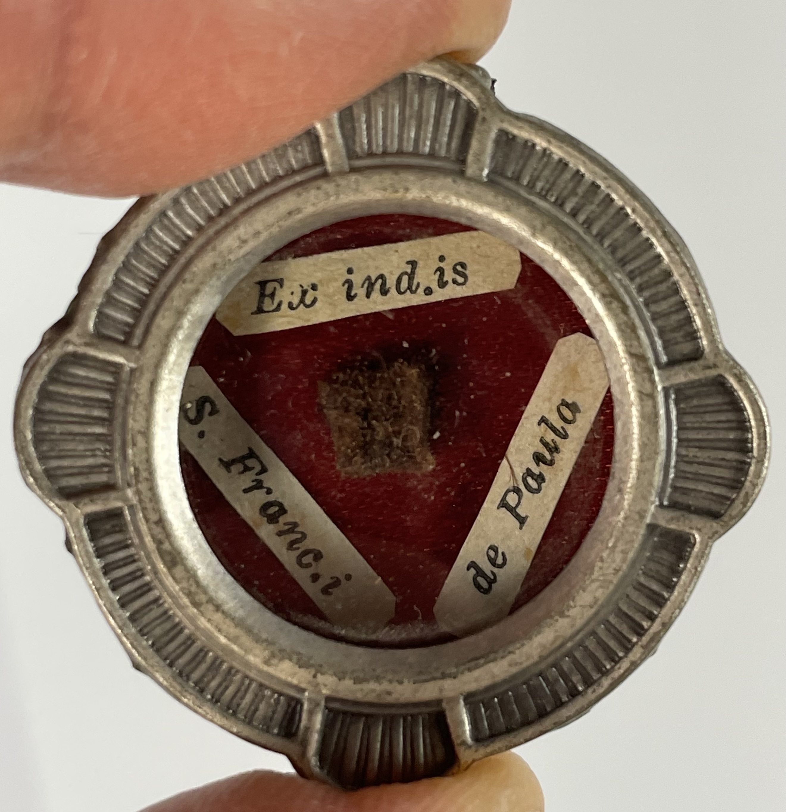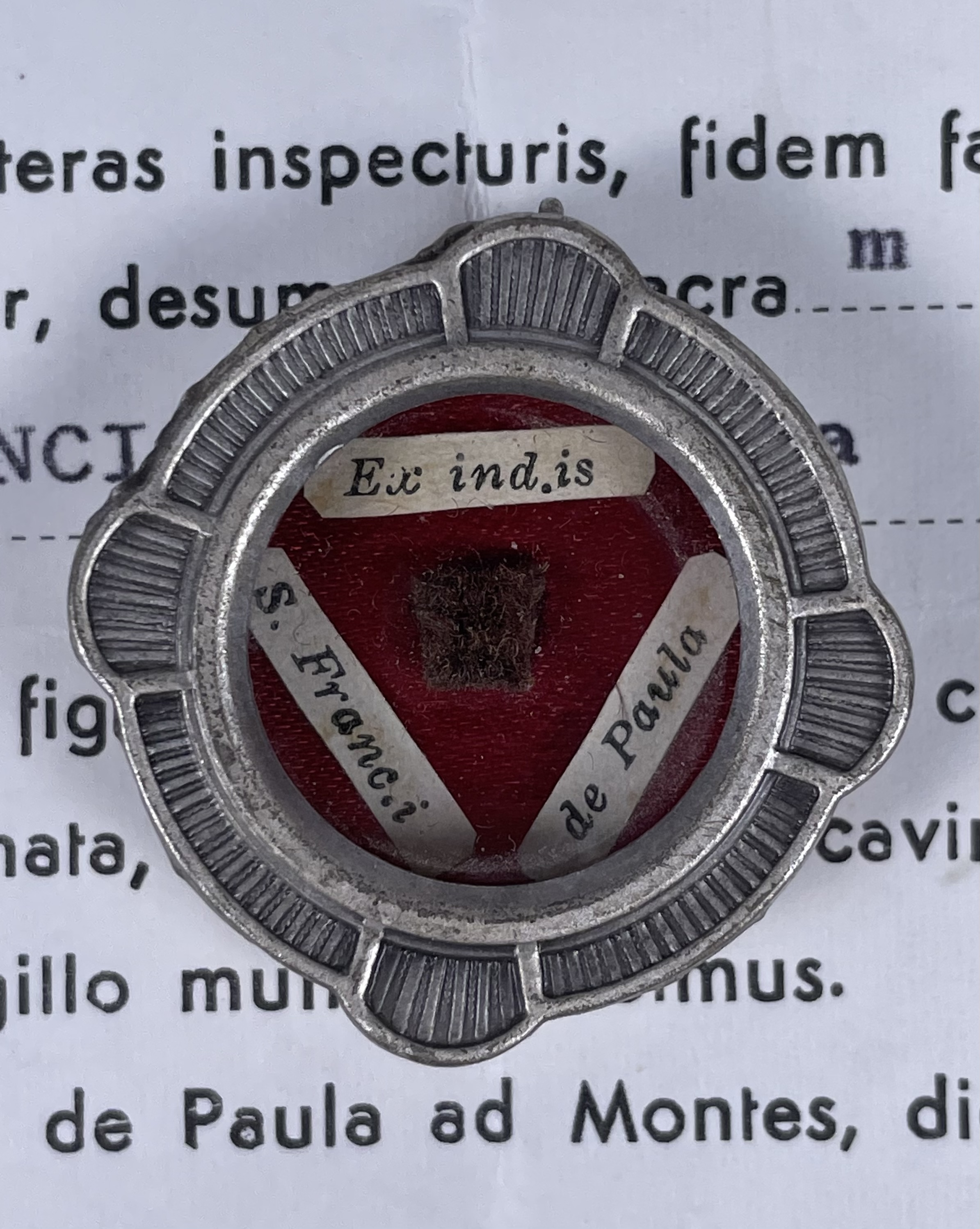 Round white-metal glass-fronted reliquary theca housing the second-class ex indumentis (of the clothing) relic of Saint Francis of Paola, O.M. The relic is affixed to a red silk ground and identified in Latin on a typeset cedula label as Ex ind.is S. Franc.i de Paula (ex indumentis Saint Francis of Paola). On the back, under a protective cap, the theca is secured with a seal of red Spanish wax bearing an imprint of a coat of arms of the Order of Minims. The relic is accompanied by the original matching authentics document issued in 1981 by the Postulator General responsible for the Cause of Beatification and Canonization.