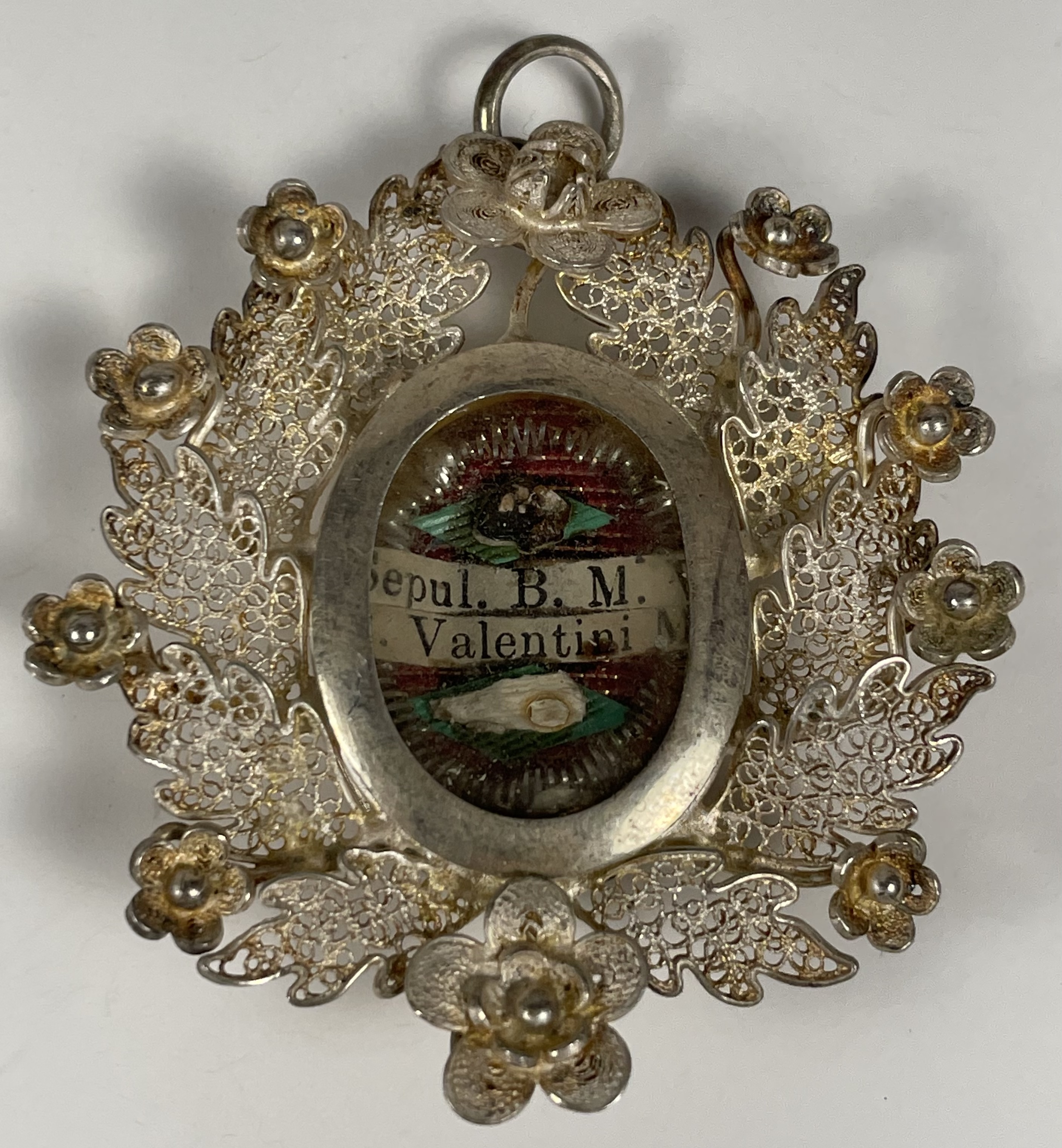 Saint Valentine of Rome (†269) (Italian: San Valentino, Latin: Valentinus) is a widely recognized 3rd-century Roman saint, commemorated in Christianity on February 14 and since the High Middle Ages associated with a tradition of courtly love. He was a priest and bishop in the Roman Empire who ministered to persecuted Christians. He was martyred and his body was buried at a Christian cemetery on the Via Flaminia close to the Ponte Milvio to the north of Rome, on February 14, which has been observed as the Feast of Saint Valentine (Saint Valentine's Day) since 496 AD. Relics of him were kept in the Church and Catacombs of San Valentino in Rome, which "remained an important pilgrim site throughout the Middle Ages until the relics of St. Valentine were transferred to the church of Santa Prassede during the pontificate of Nicholas IV". His skull, crowned with flowers, is exhibited in the Basilica of Santa Maria in Cosmedin, Rome. His Feast is commemorated on February 14 (Catholic, Anglican and Lutheran Churches) and July 6 and July 30 (Eastern Orthodox) and he is a Holy Patron of Affianced couples, against fainting, beekeepers, happy marriages, love, plague, and epilepsy.