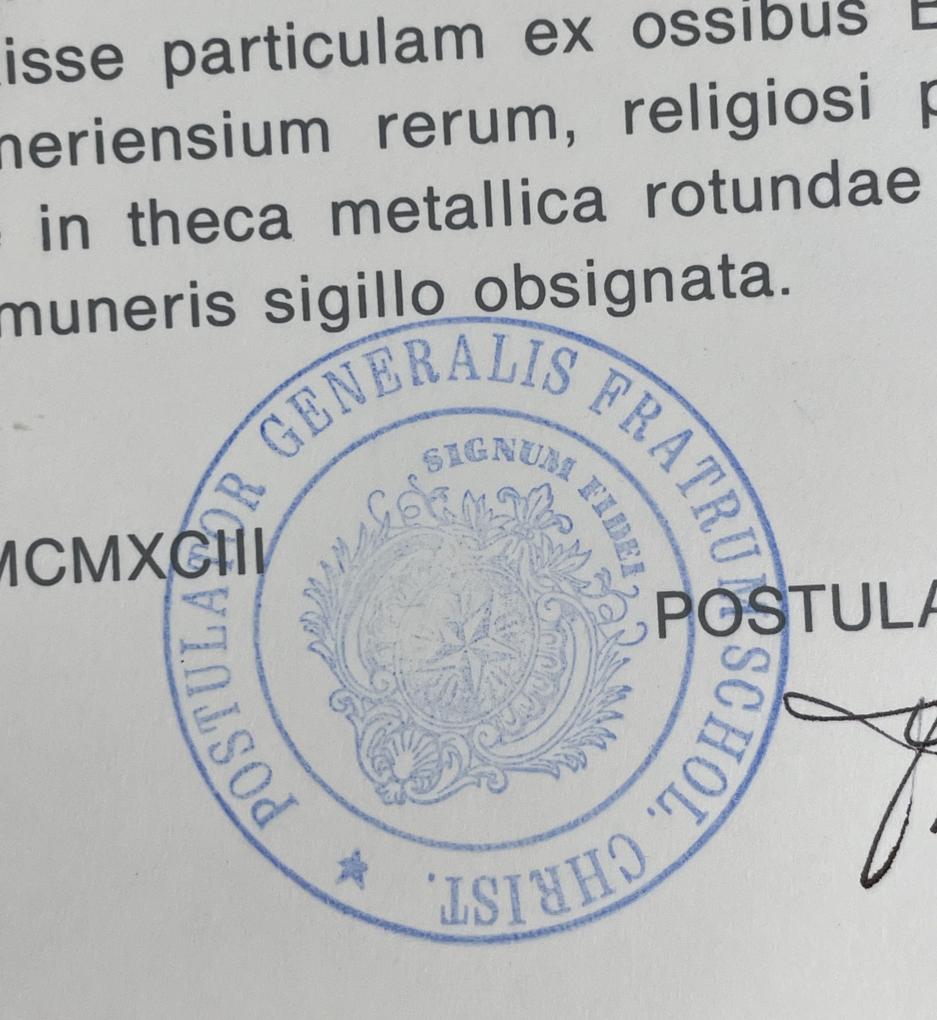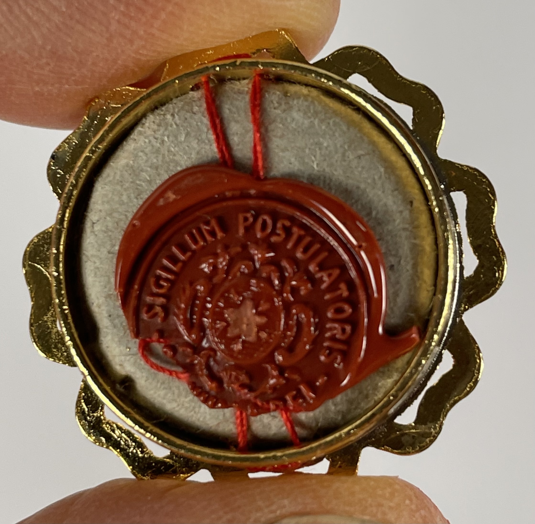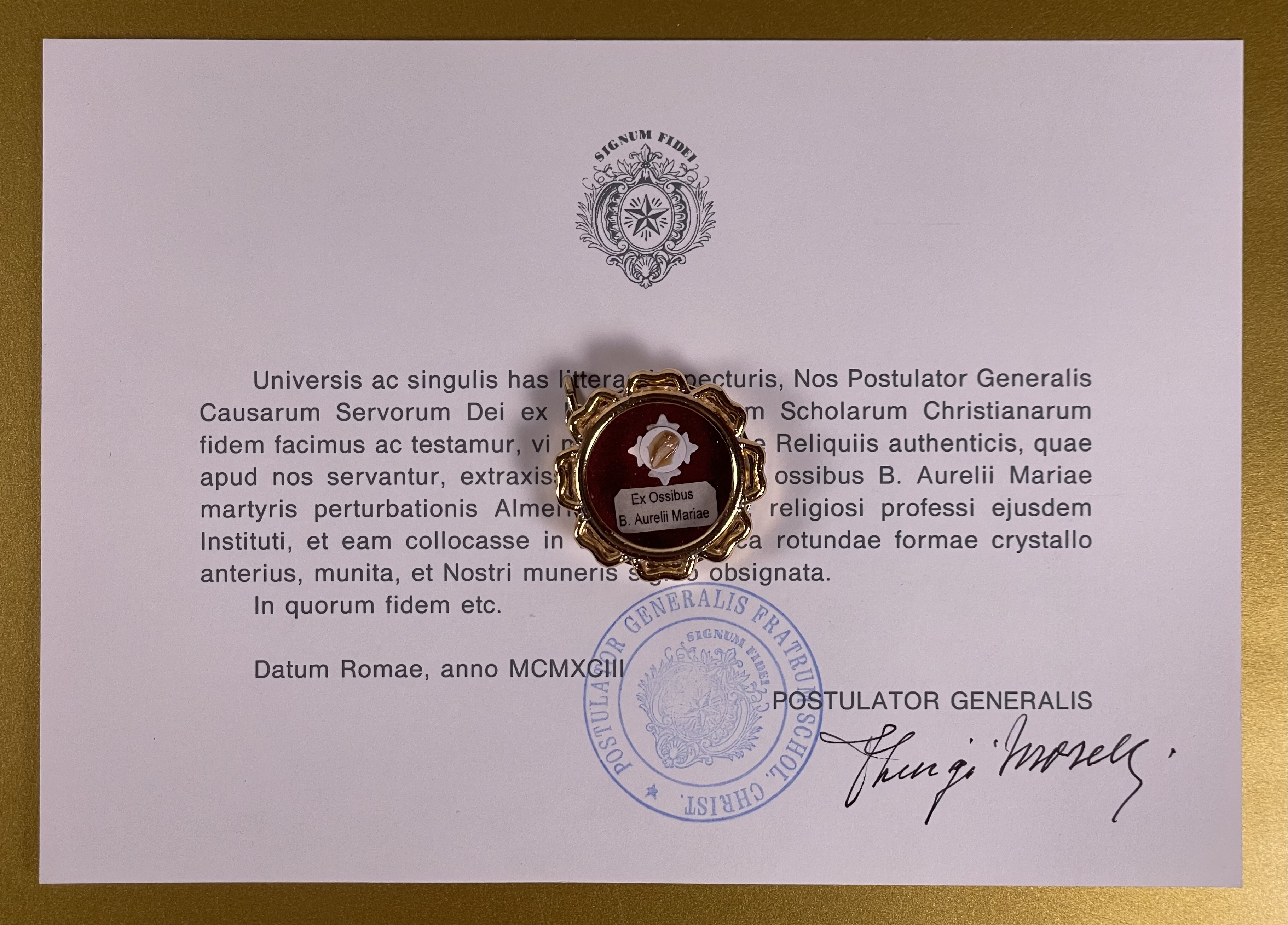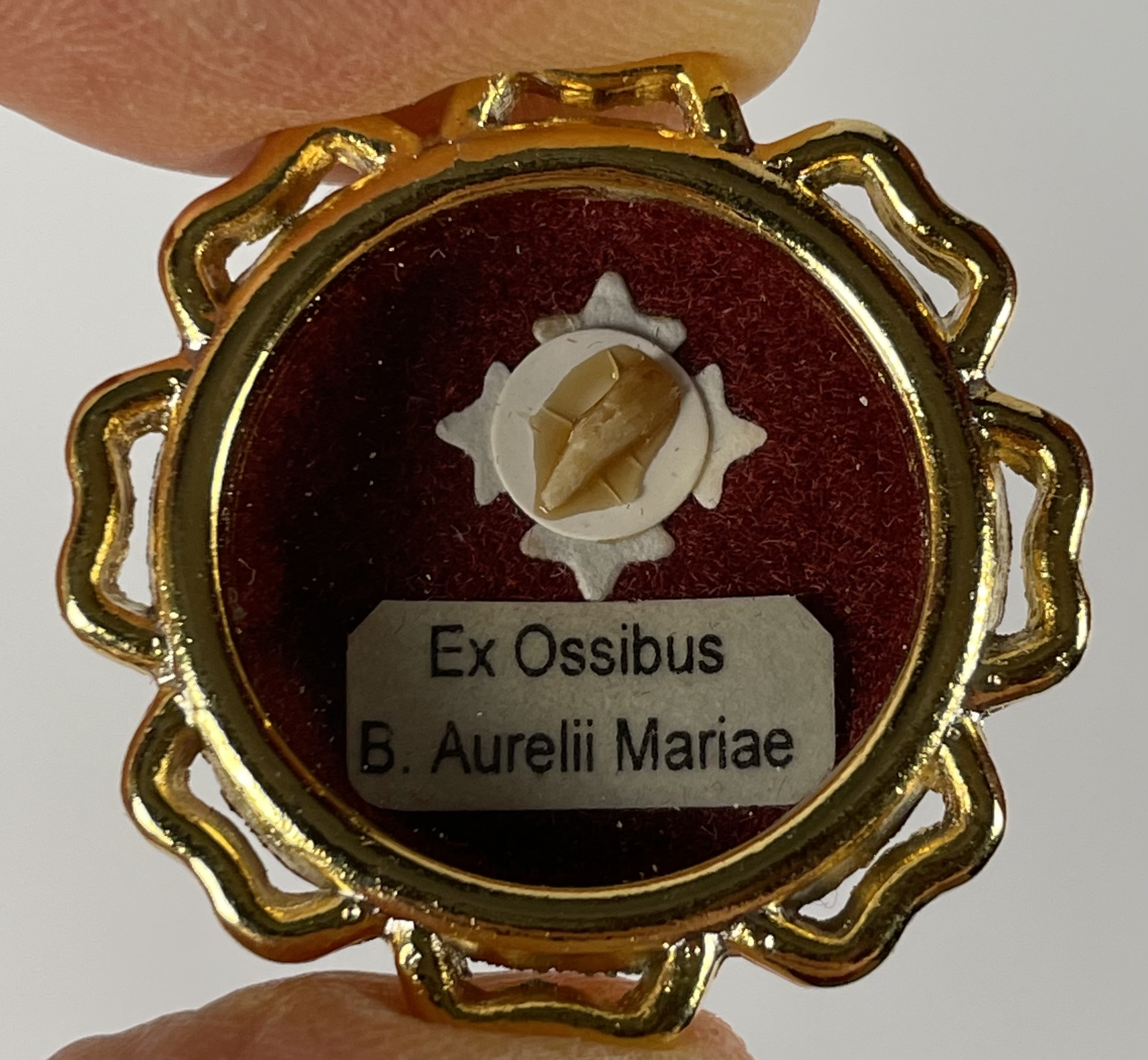 Round glass-fronted yellow-metal reliquary theca housing the first-class ex ossibus (of a bone) relics of the Blessed Aurelio Maria. The relic is affixed to a red silk ground and identified in Latin on a typeset cedula label as Ex Ossibus B. Aurelii Mariae (from the bone of the Blessed Aurelio Maria.). On the back, under the protective cap, the theca is secured with a seal of red Spanish wax bearing an imprint of a coat of arms of the Institute of the Brothers of the Christian Schools (The De La Salle Brothers). The relic is accompanied by the original matching authentics document issued in 1993 (the year of his beatification) by the Postulator General of the Order.