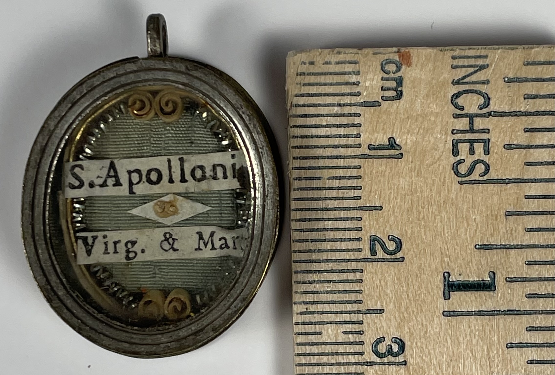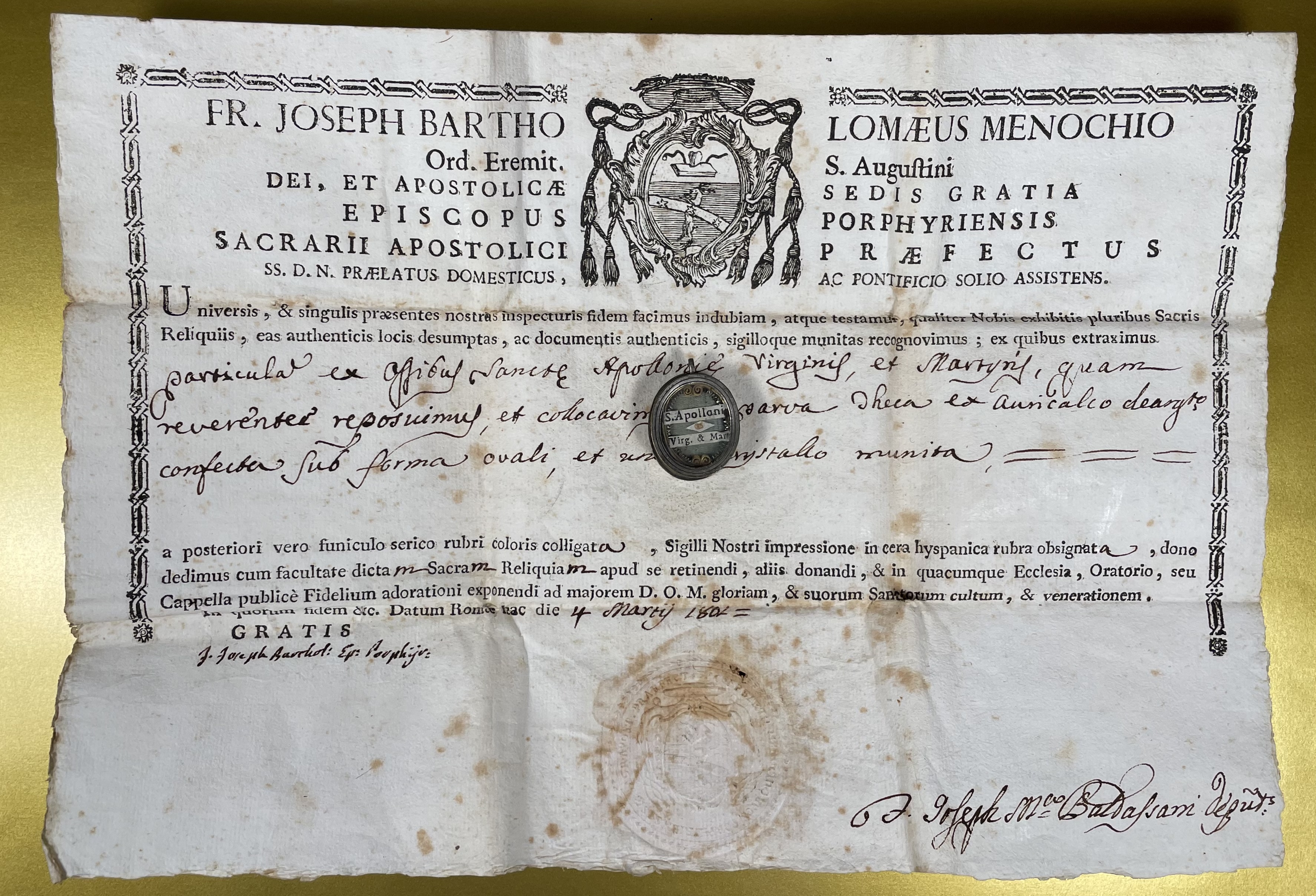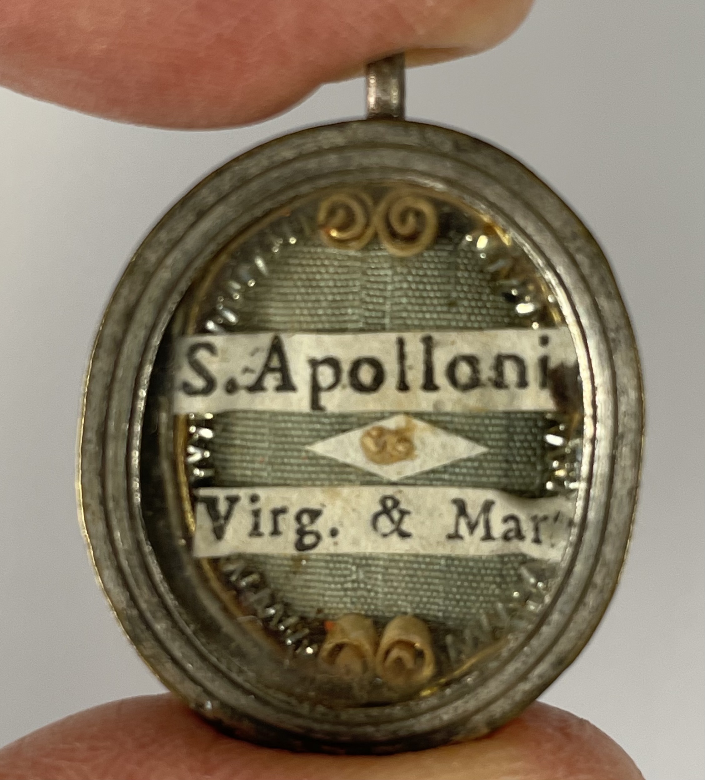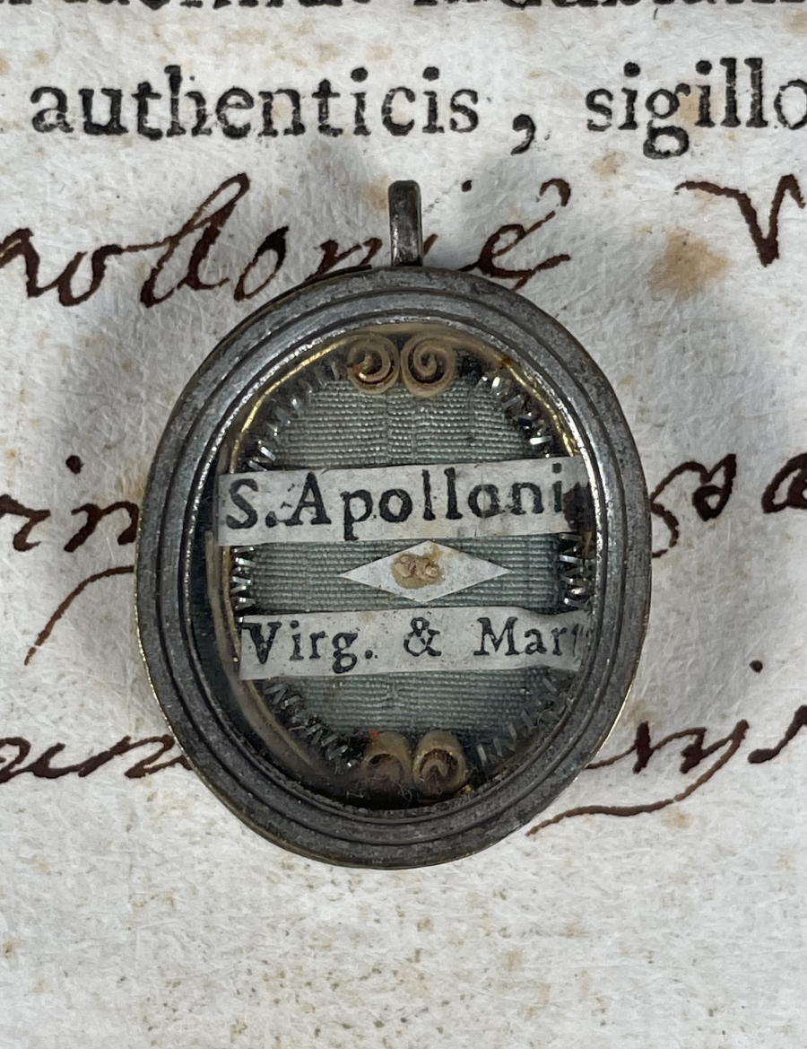 Oval brass glass-fronted reliquary housing the first-class ex ossibus (of the bone) relics of Saint Apollonia. The relic is affixed to the background of red silk ground surrounded by paperolle and silver wire ornamentation and identified in Latin on a typeset cedula label as S. Apolloni / Virg. e Mart. (St. Apollonia, Virgin & Martyr). On the back, the theca is secured with a perfectly preserved seal of red Spanish wax bearing an imprint with a coat of arms of Fr. Giuseppe Bartolomeo Menocchio, O.E.S.A. (1741- 1823), Titular Bishop of Porphyreon and Sacristan of His Holiness Pius VII. The relic is accompanied by the original matching authentics document issued by Fr. Menocchio in 1802.
