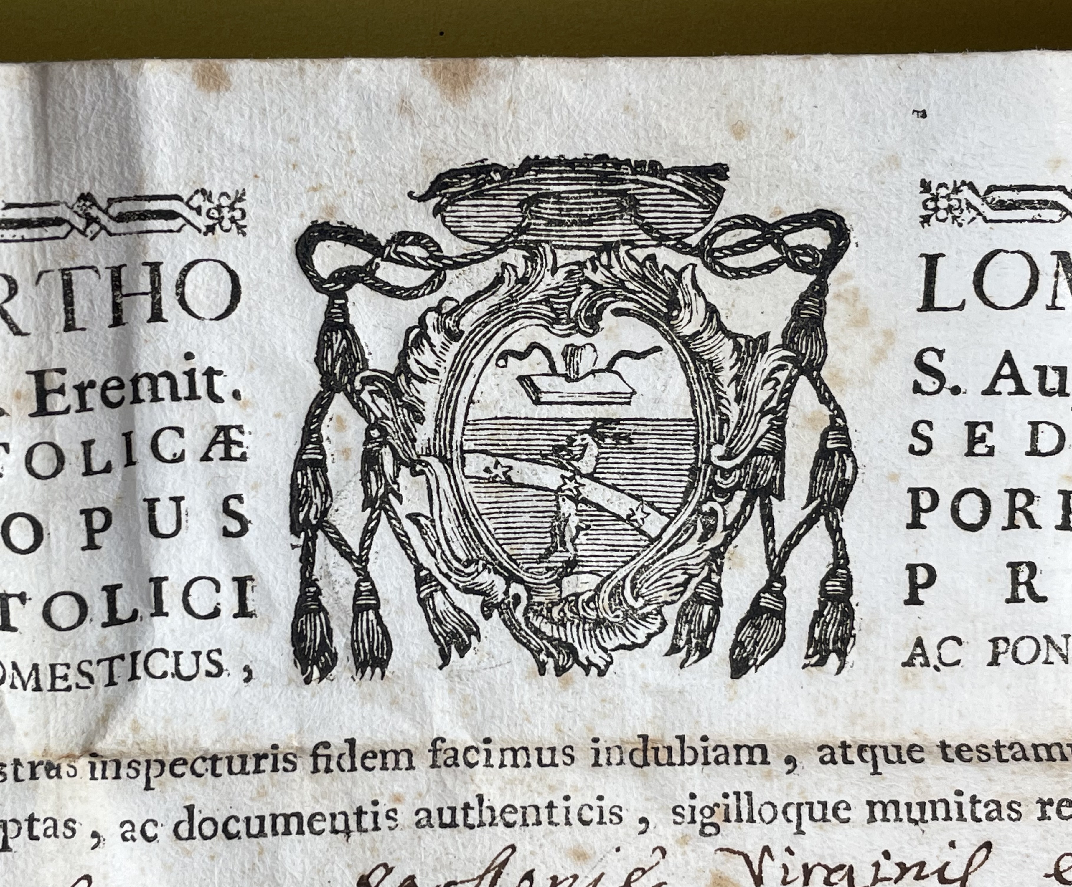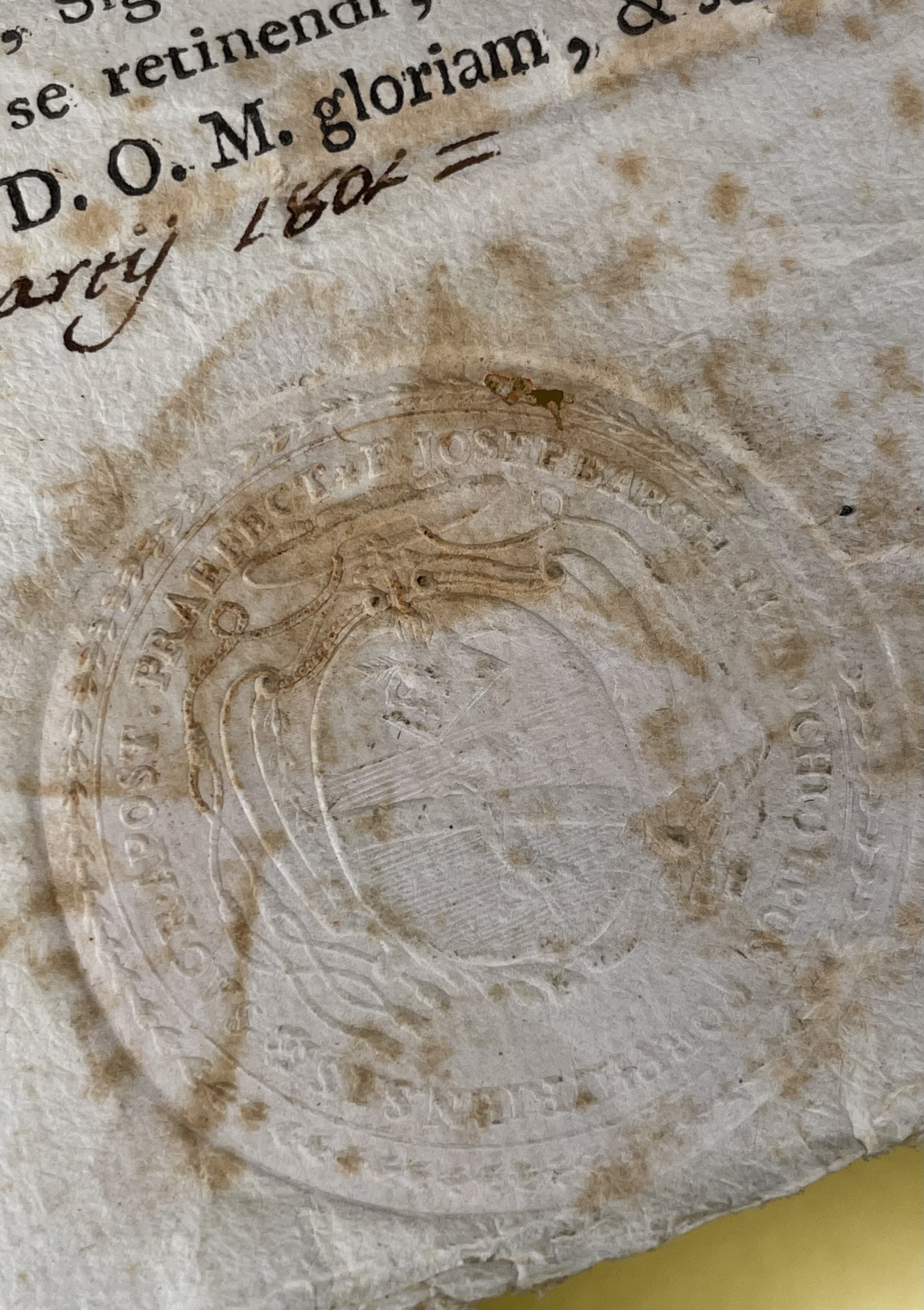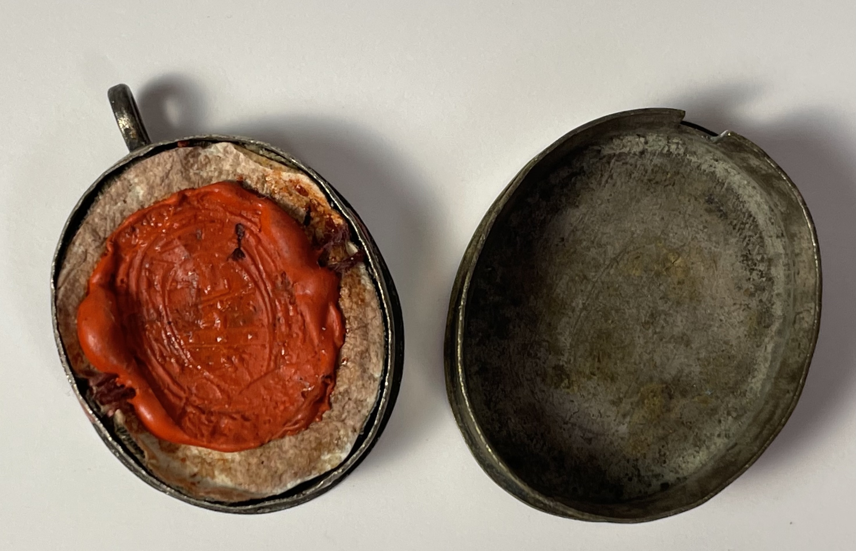 Oval brass glass-fronted reliquary housing the first-class ex ossibus (of the bone) relics of Saint Apollonia. The relic is affixed to the background of red silk ground surrounded by paperolle and silver wire ornamentation and identified in Latin on a typeset cedula label as S. Apolloni / Virg. e Mart. (St. Apollonia, Virgin & Martyr). On the back, the theca is secured with a perfectly preserved seal of red Spanish wax bearing an imprint with a coat of arms of Fr. Giuseppe Bartolomeo Menocchio, O.E.S.A. (1741- 1823), Titular Bishop of Porphyreon and Sacristan of His Holiness Pius VII. The relic is accompanied by the original matching authentics document issued by Fr. Menocchio in 1802.