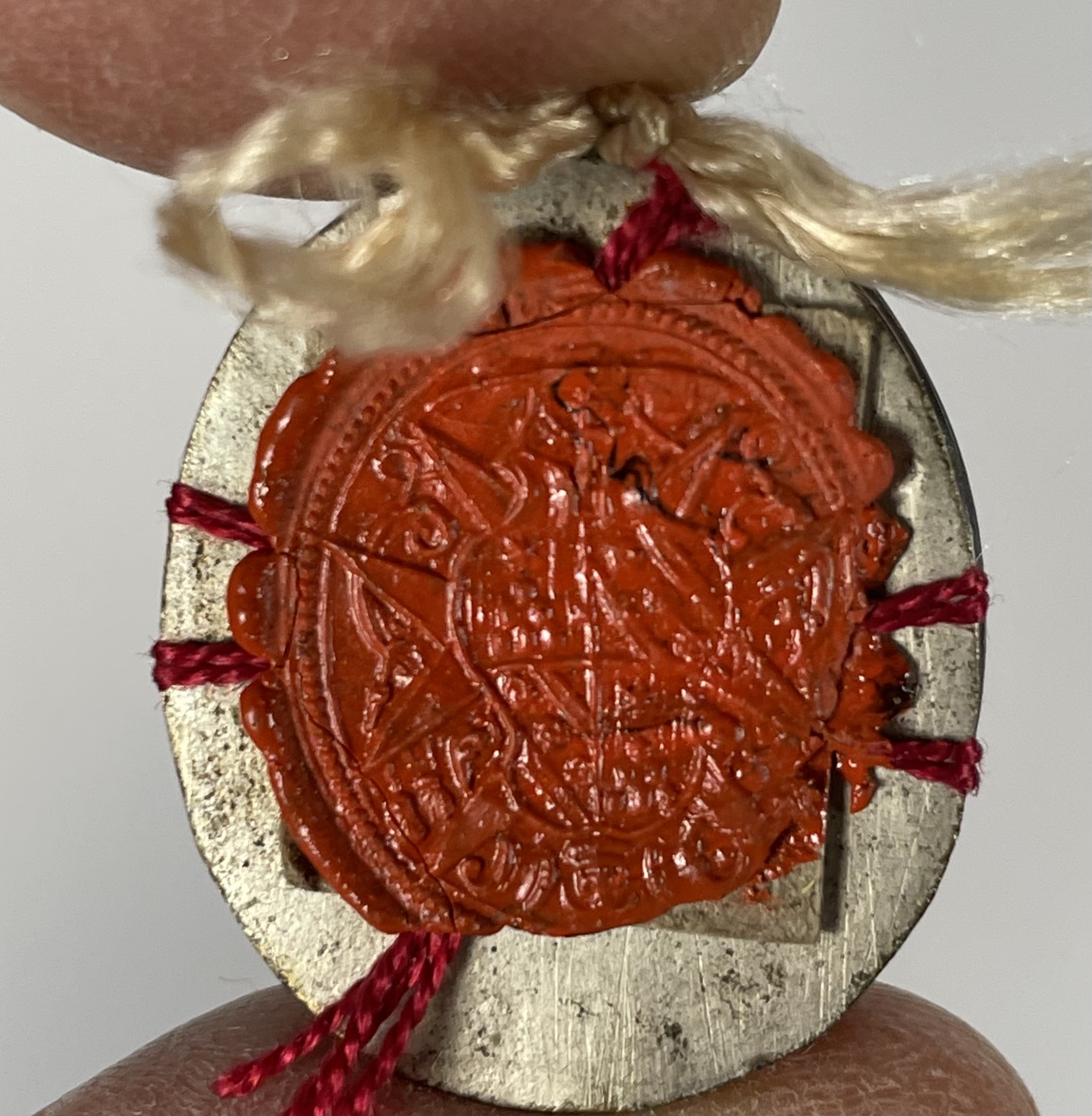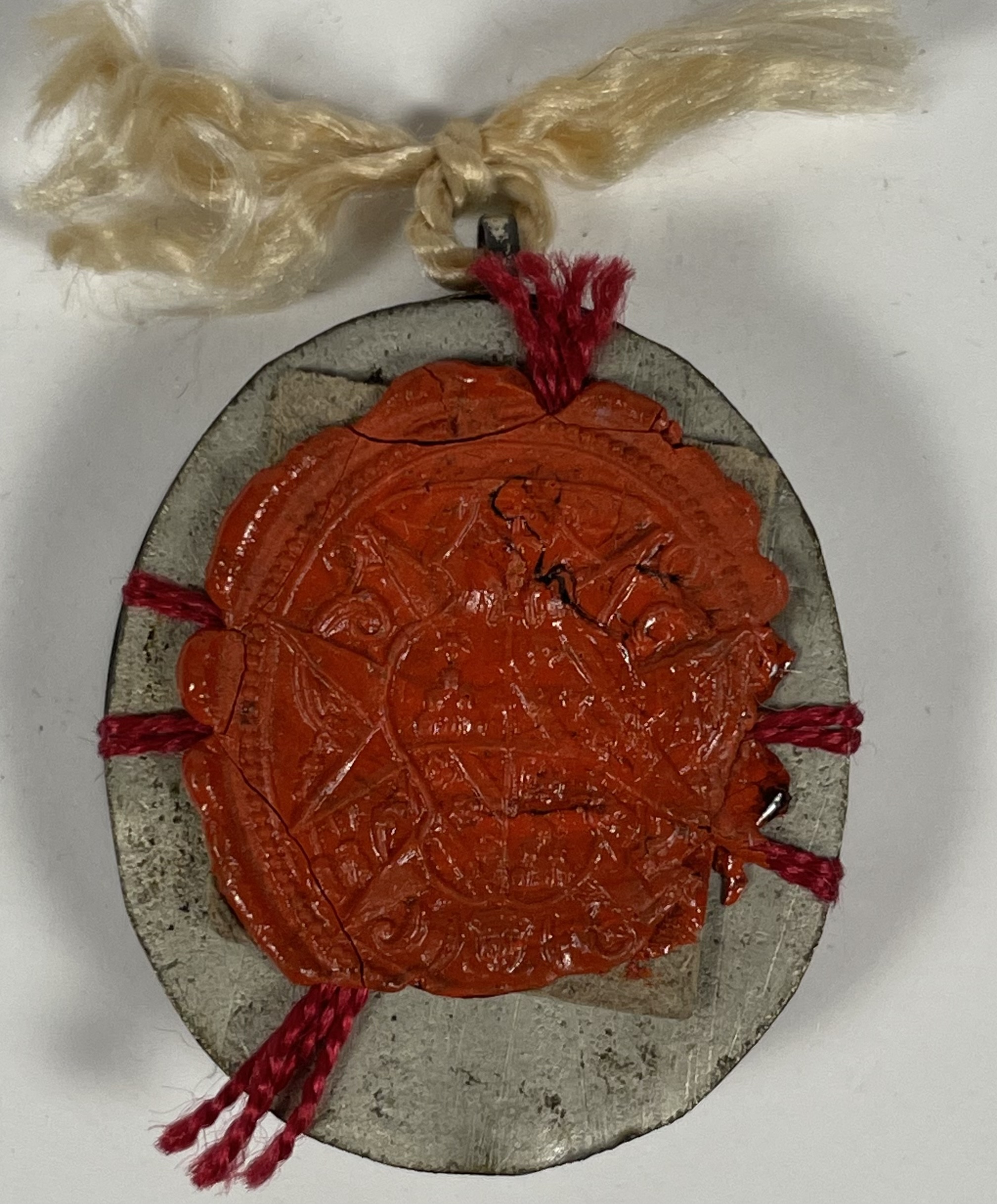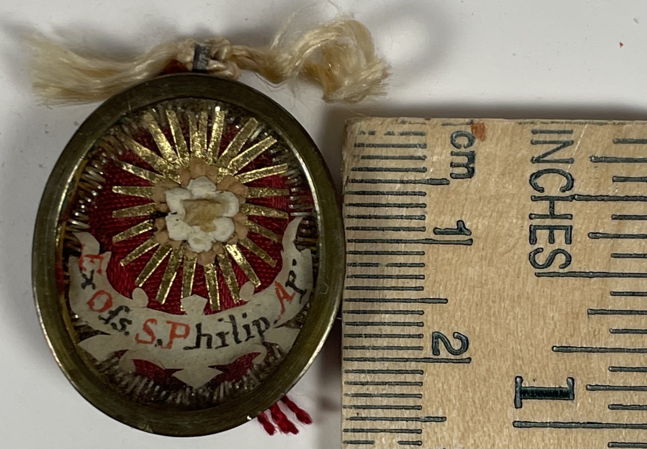 Oval silvered metal glass-fronted theca housing the first-class ex ossibus relic of Saint Philip the Apostle. The relic is affixed to a red silk background surrounded by silver wire ornamentation and identified on a manuscript cedula label as Ex Oss. S. Philip Ap. (from the bone of Saint Philip, Apostle). On the back, the theca is secured by a seal of red Spanish wax with an imprint of a coat of arms of Cardinal Antonio Felice Zondadari (†1823), Archbishop of Siena (1795-1823).