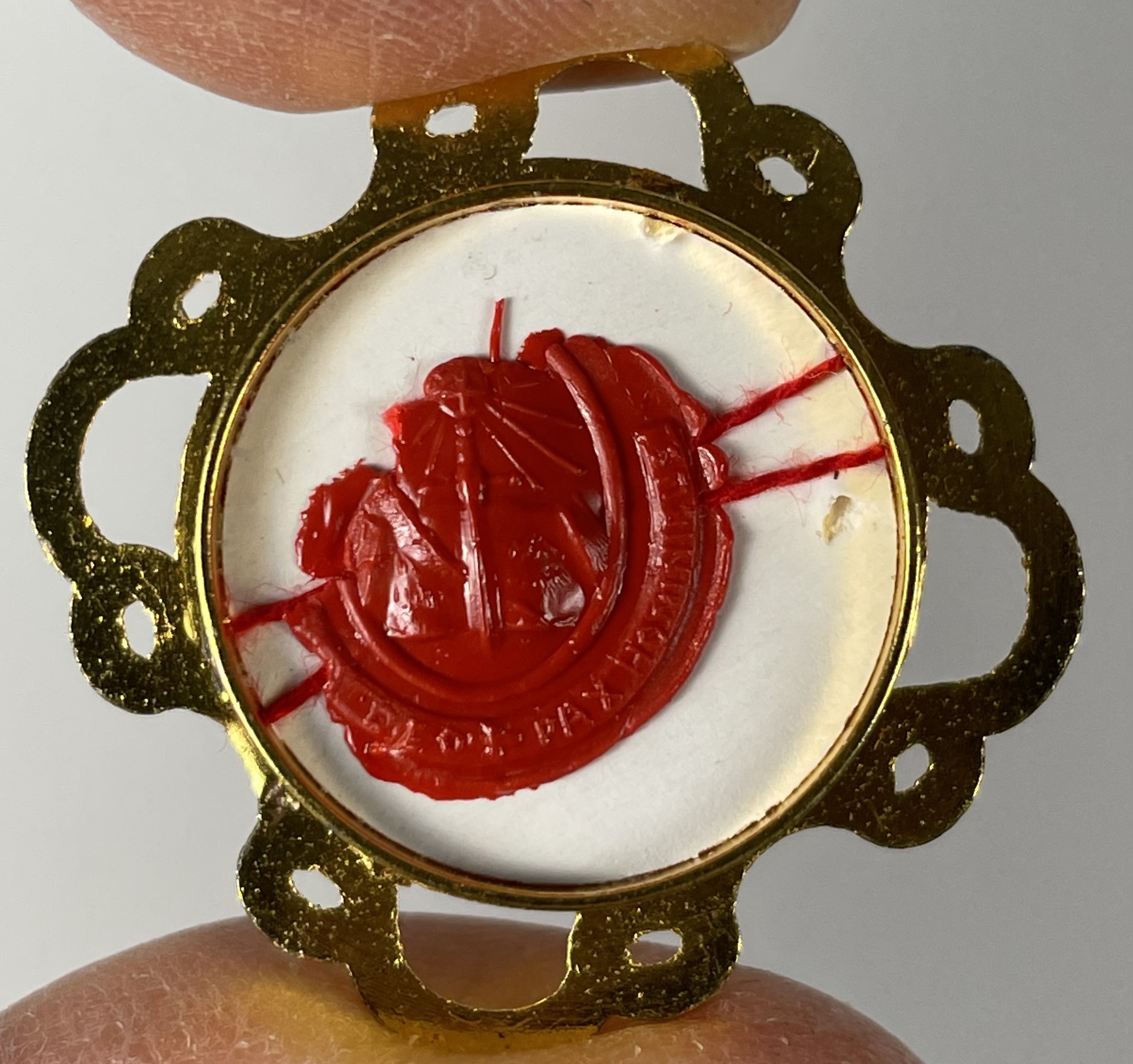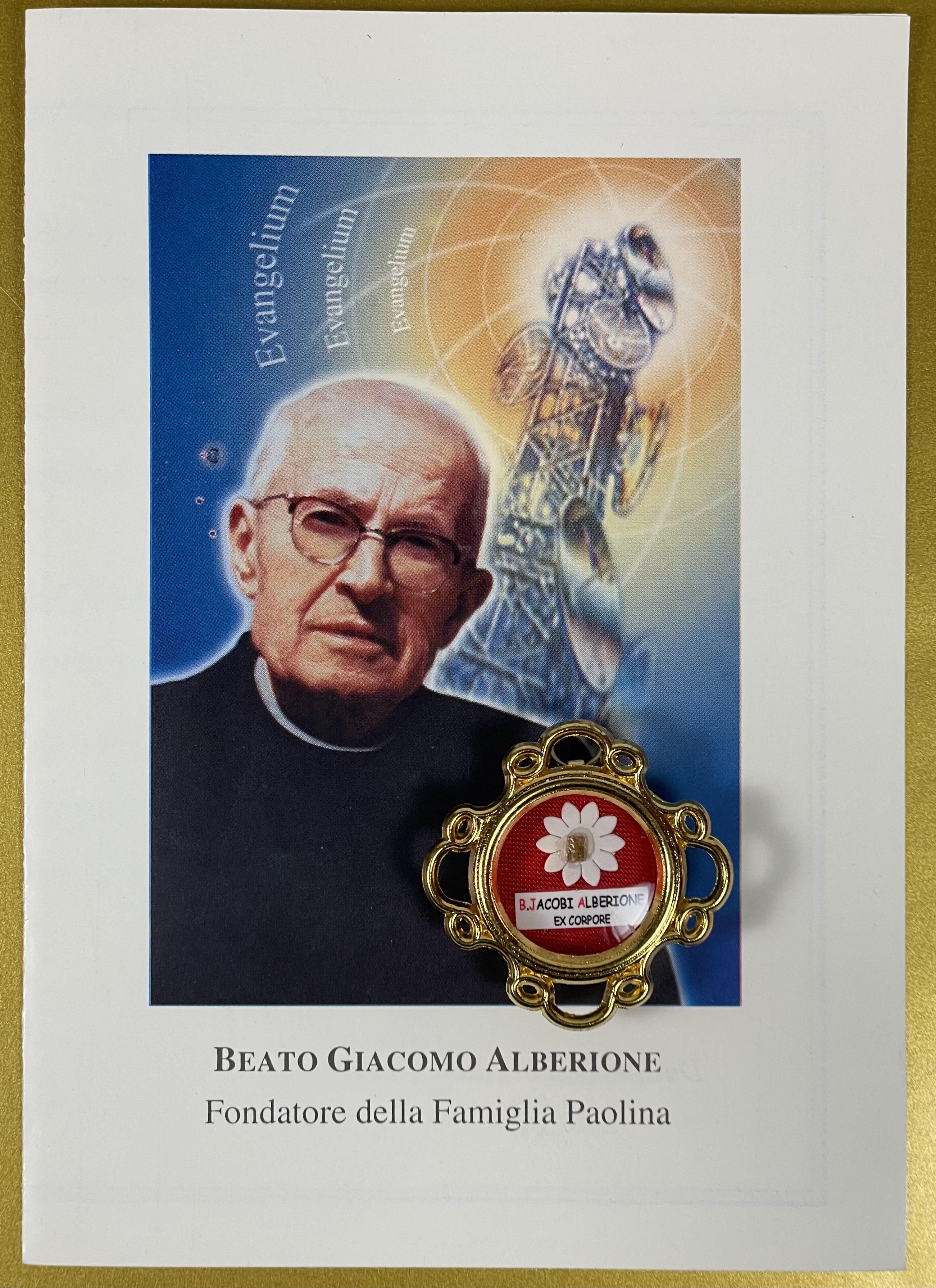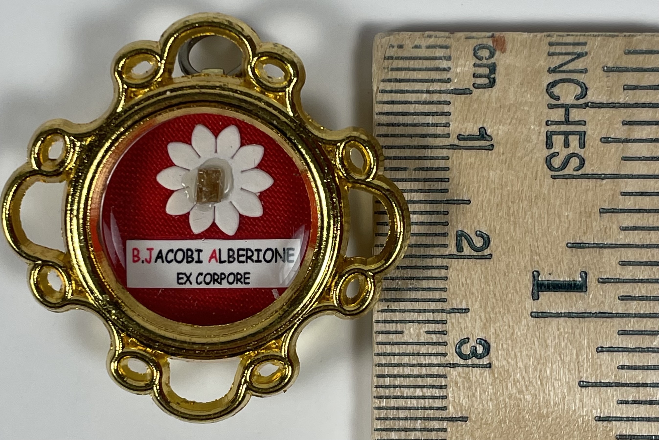 Round glass-fronted yellow-metal reliquary theca housing the first-class ex corpore  (of the body) relic of Blessed James AlberioneThe relic is affixed to a red silk ground and identified in Latin on a bi-color typeset cedula label as B. Jacobi Alberione // ex corpore (of the body of the Blessed James Alberione). On the back, under the protective cap, the theca is secured with a seal of red Spanish wax bearing an imprint of a coat of arms of the Pauline Family, a Roman Catholic congregation of nine institutes of consecrated life that he founded. The relic is accompanied by the original matching authentics document issued on 27 April 2003 (the day of his beatification) by the Postulator General of the Order.
