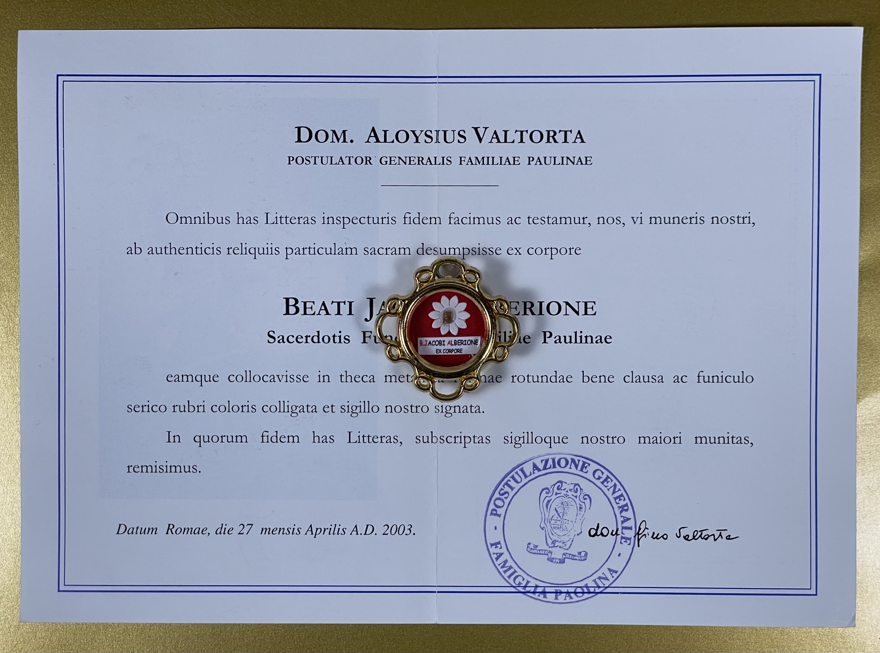 2003 Documented reliquary theca with relics of the Blessed James (Giacomo) Alberione, founder of the Pauline Family