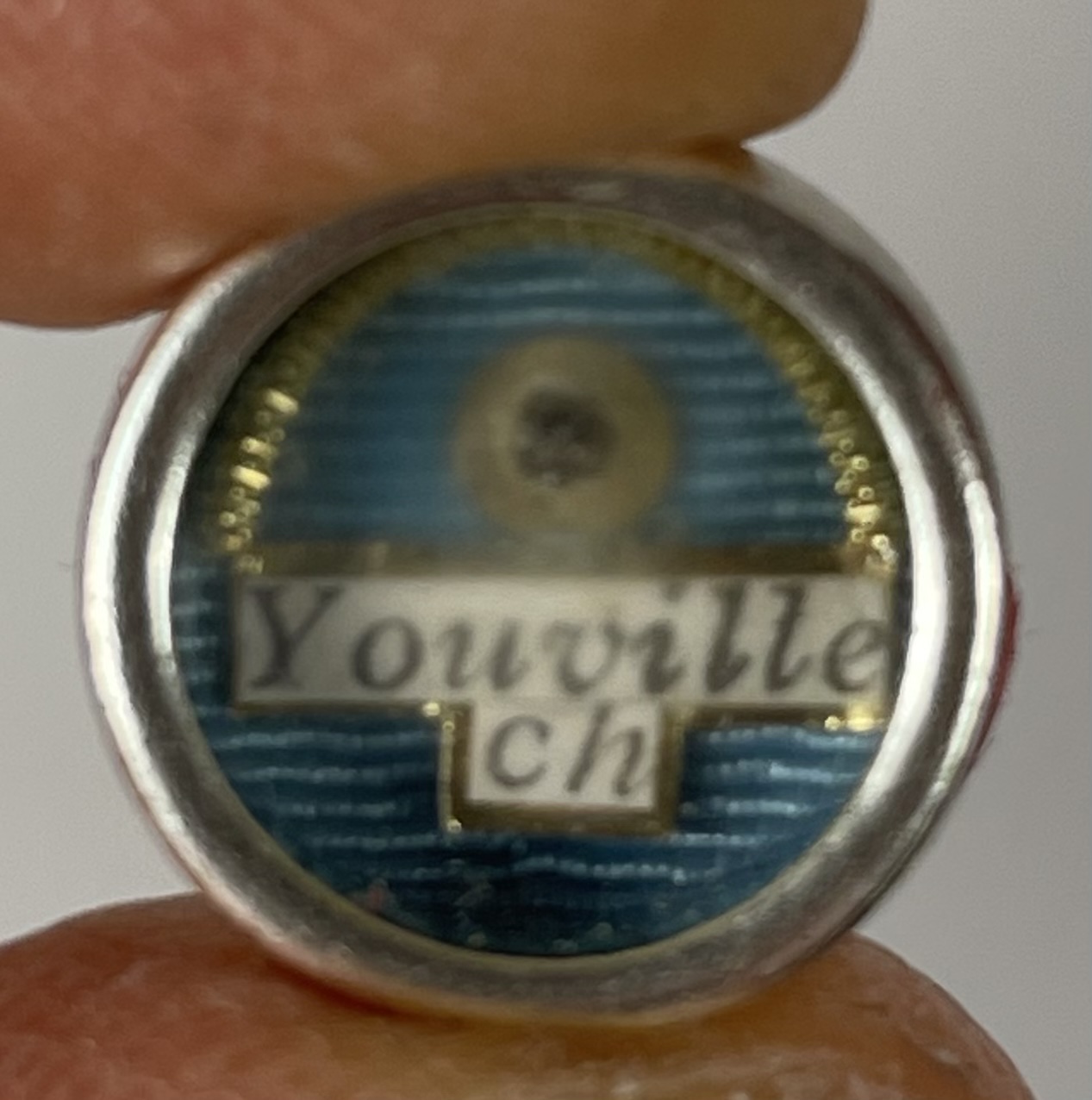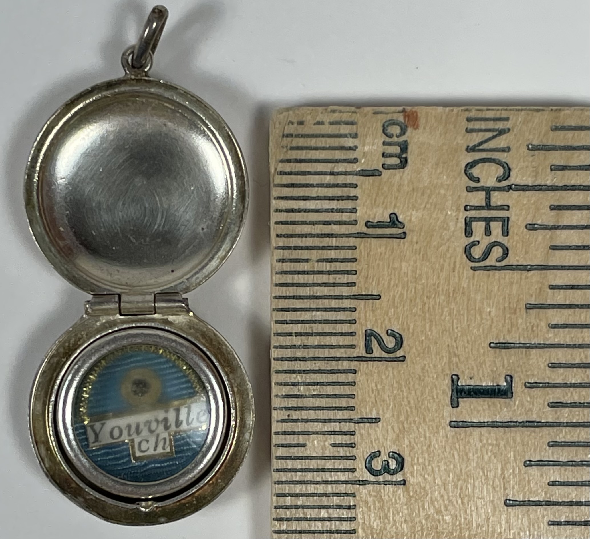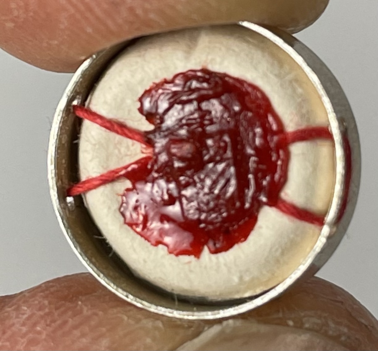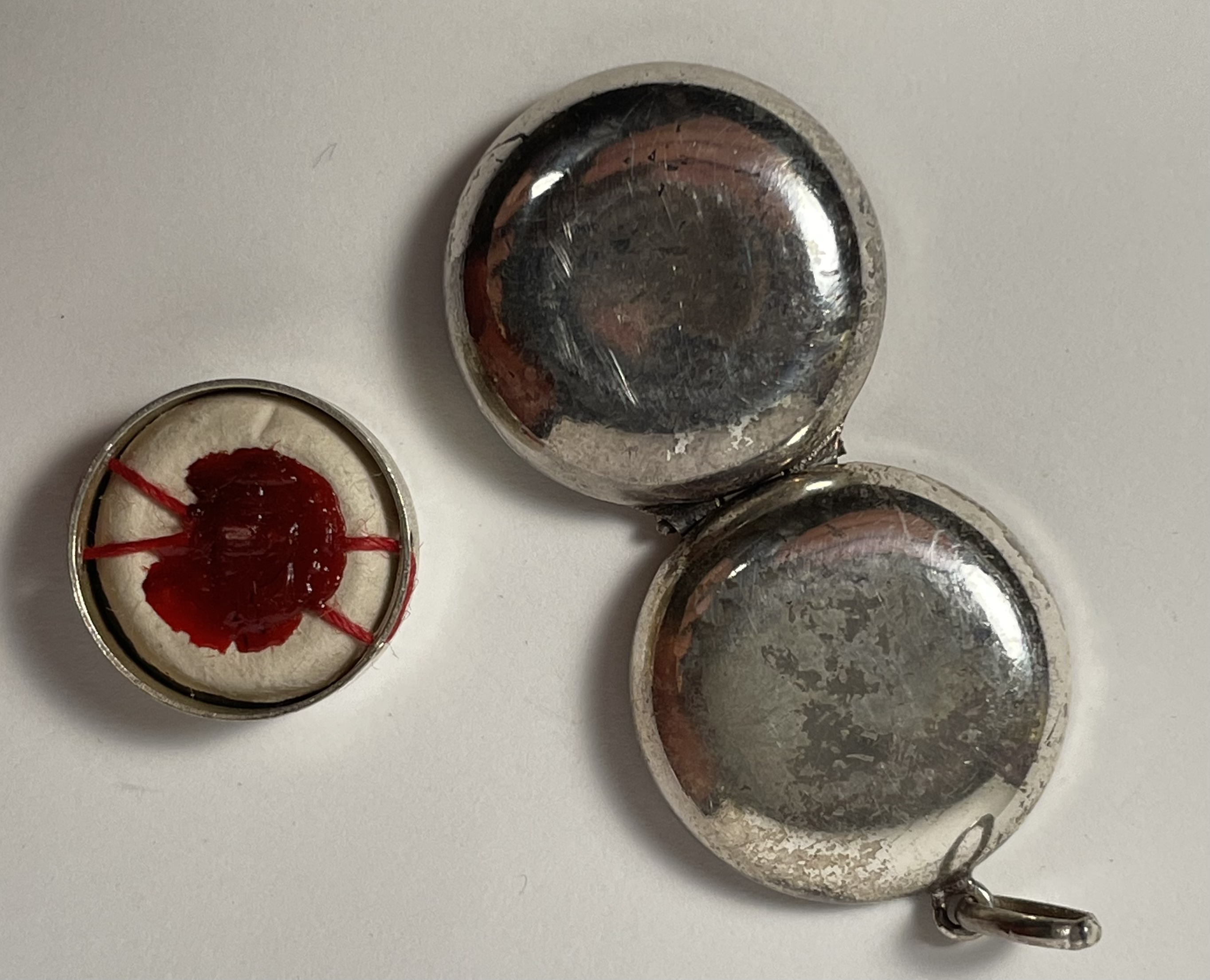 Small round glass-fronted reliquary theca held in a clam-shaped silver pendant housing the first-class ex corporis (of the body) relic of the Saint Marie-Marguerite d'Youville. The relic is affixed to a red silk ground and identified in French on a typeset cedula label as Youville Ch. On the back,  the theca is secured with a seal of red Spanish wax bearing an imprint of a coat of arms of Cardinal Jean-Claude Turcotte, the Archbishop of Montreal (1990-2012). The relic is accompanied by the original matching authentics document issued on December 9, 1990 (the very day of her canonization) by Andre Cimichella, the Auxiliary bishop of Montreal.