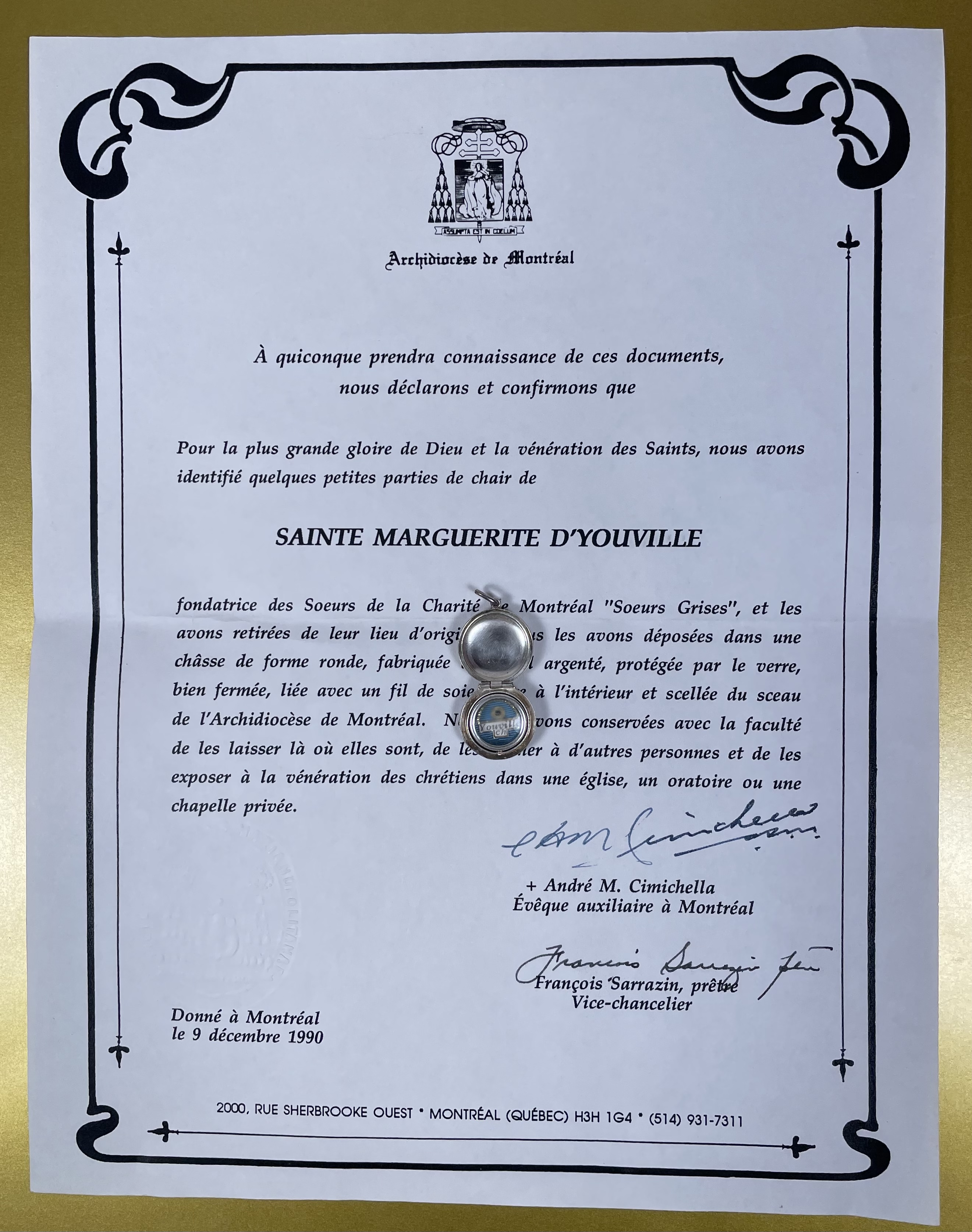 1990 Documented reliquary theca with relics of Canadian Saint Marie-Marguerite d'Youville, founder of the Order of Sisters of Charity of Montreal