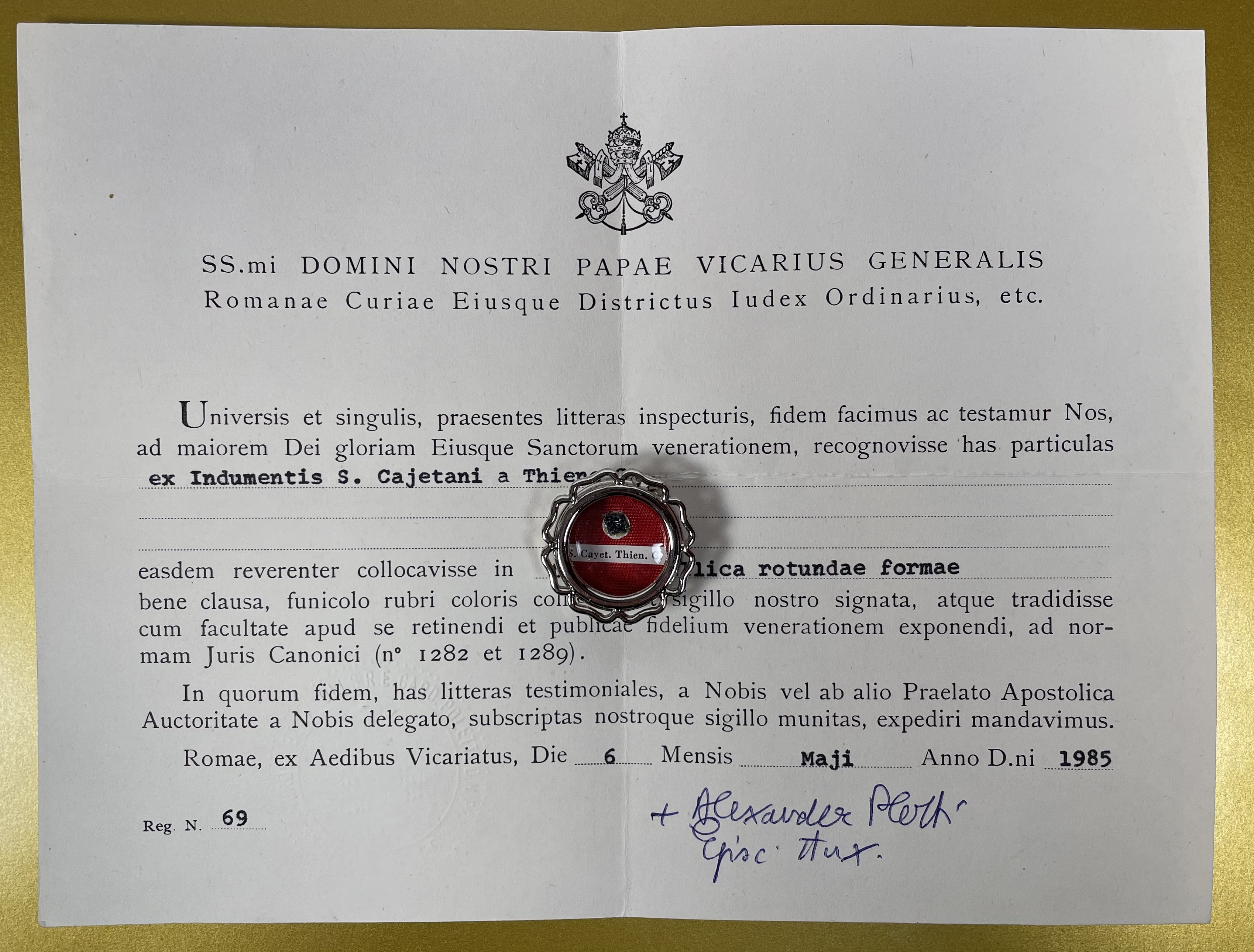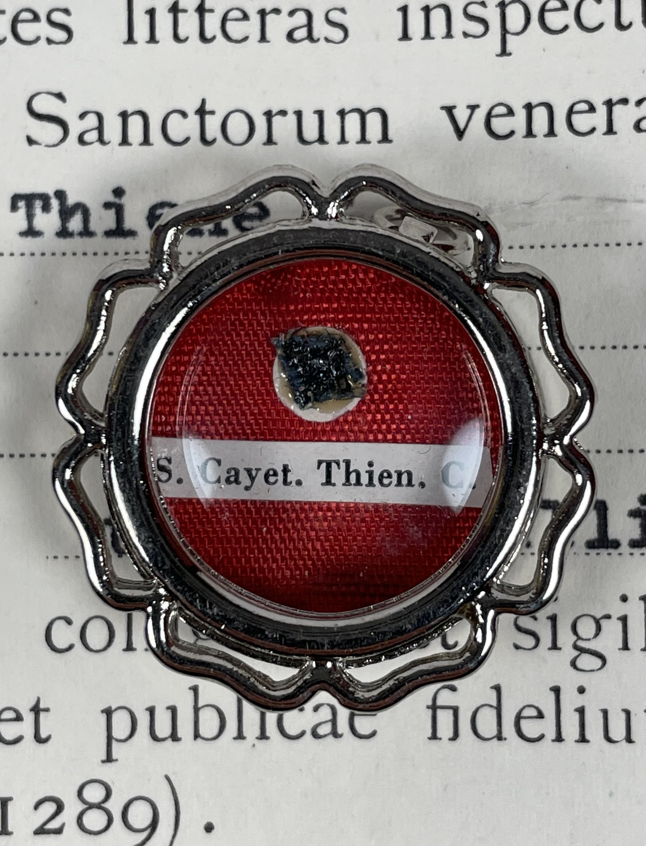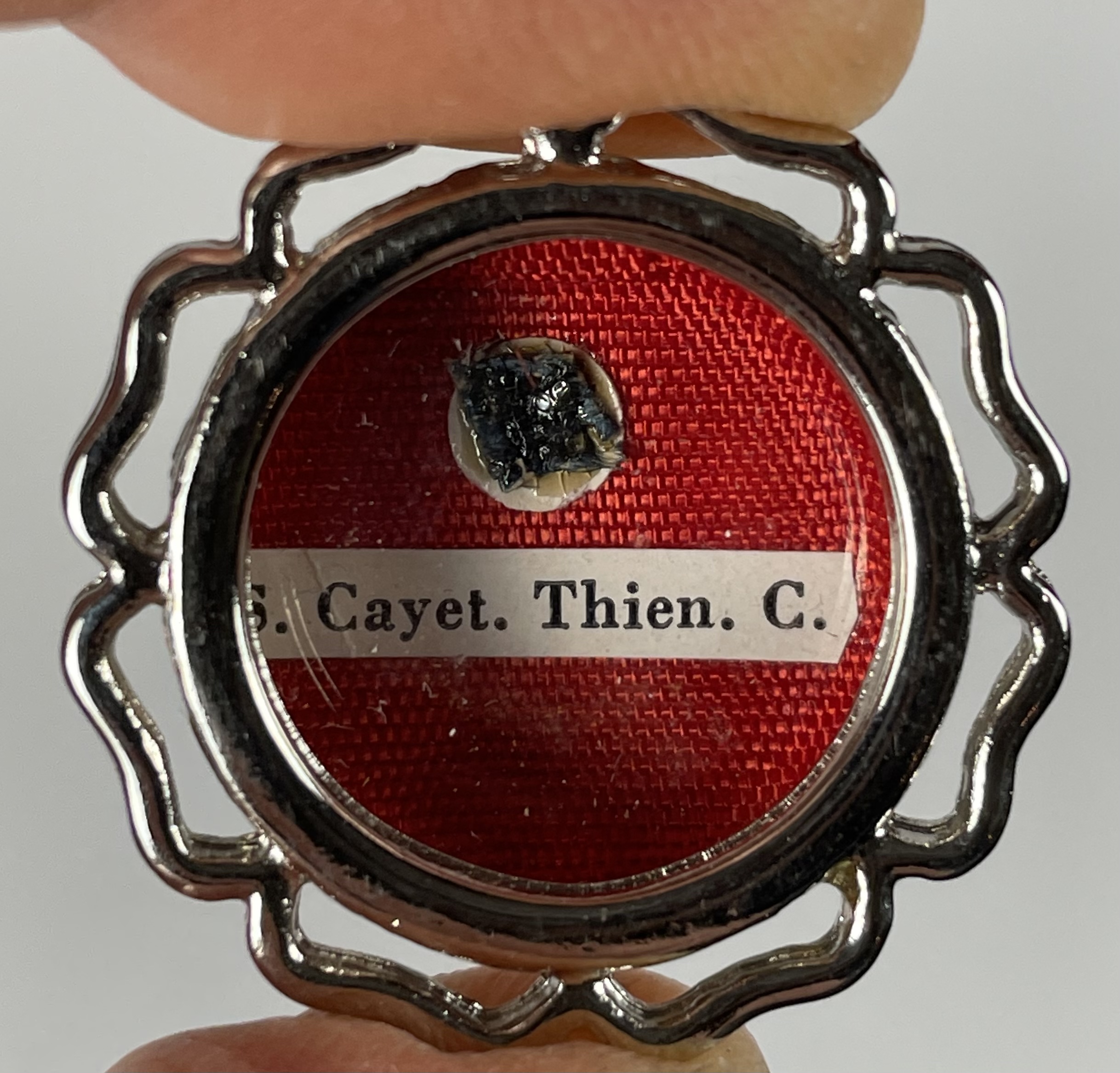 Round glass-fronted white-metal reliquary theca housing the second-class ex indumentis (of the clothes) relics of Saint Cajetan. The relics are affixed to a red silk ground and identified in Latin on typeset cedulae labels as S. Cayet. Thien. C. (Saint Cajetan dei Thiene, Confessor). On the back, under the protective cap, the theca is secured with a seal of red Spanish wax bearing an imprint of a coat of arms of Monsignor Ugo Poletti (†1997), an Italian Cardinal of the Roman Catholic Church who served as Vicar General of Rome (1973–1991). The relic is accompanied by the original matching authentics document issued in 1985 by Msgr. Poletti.
