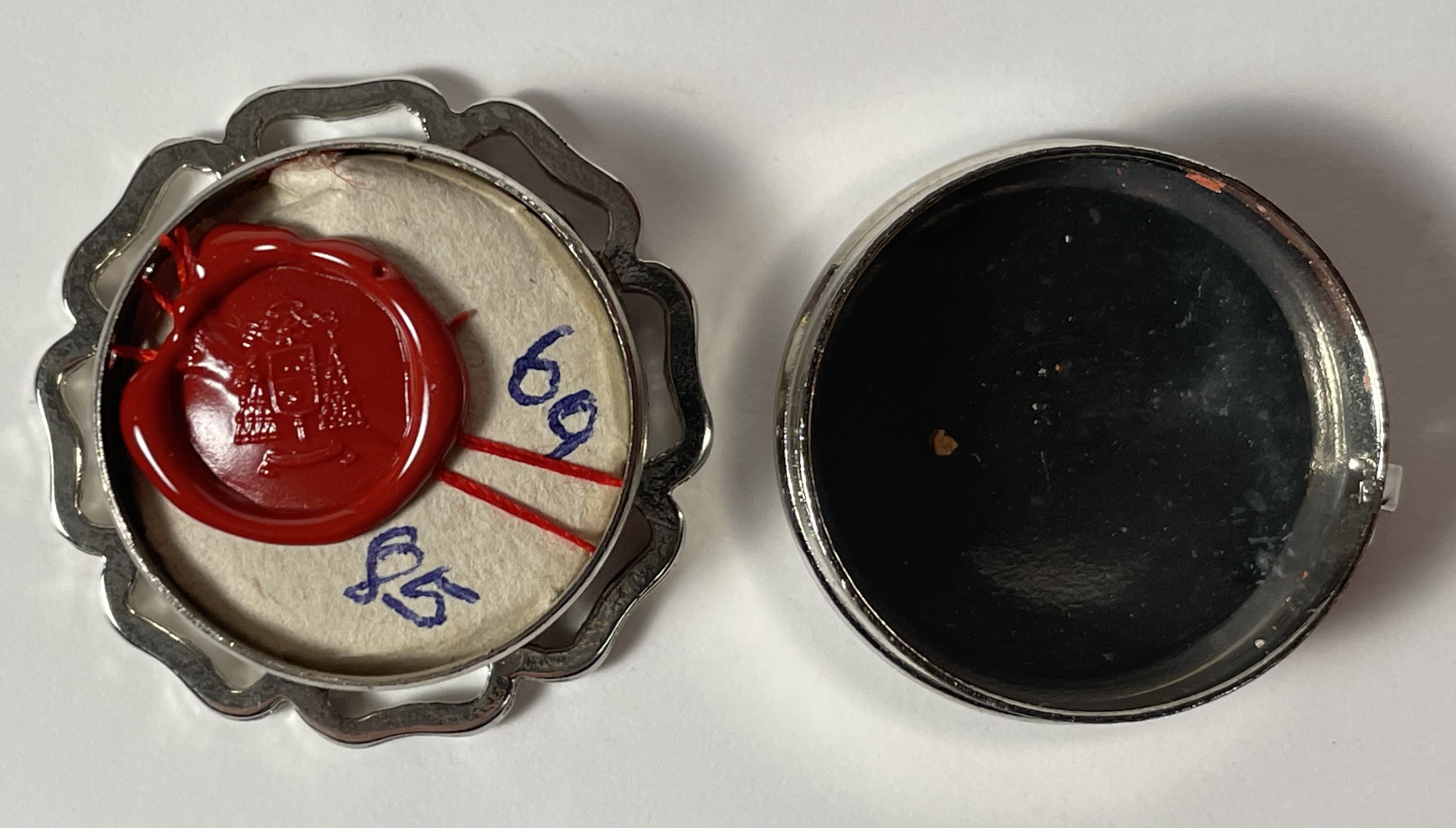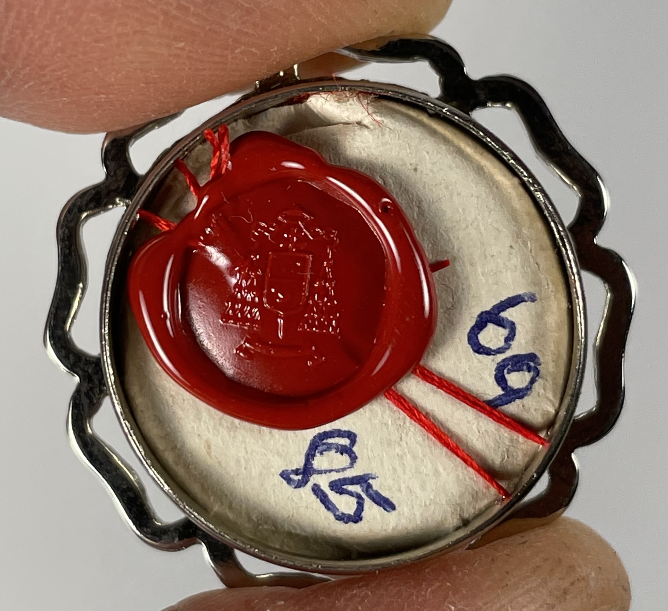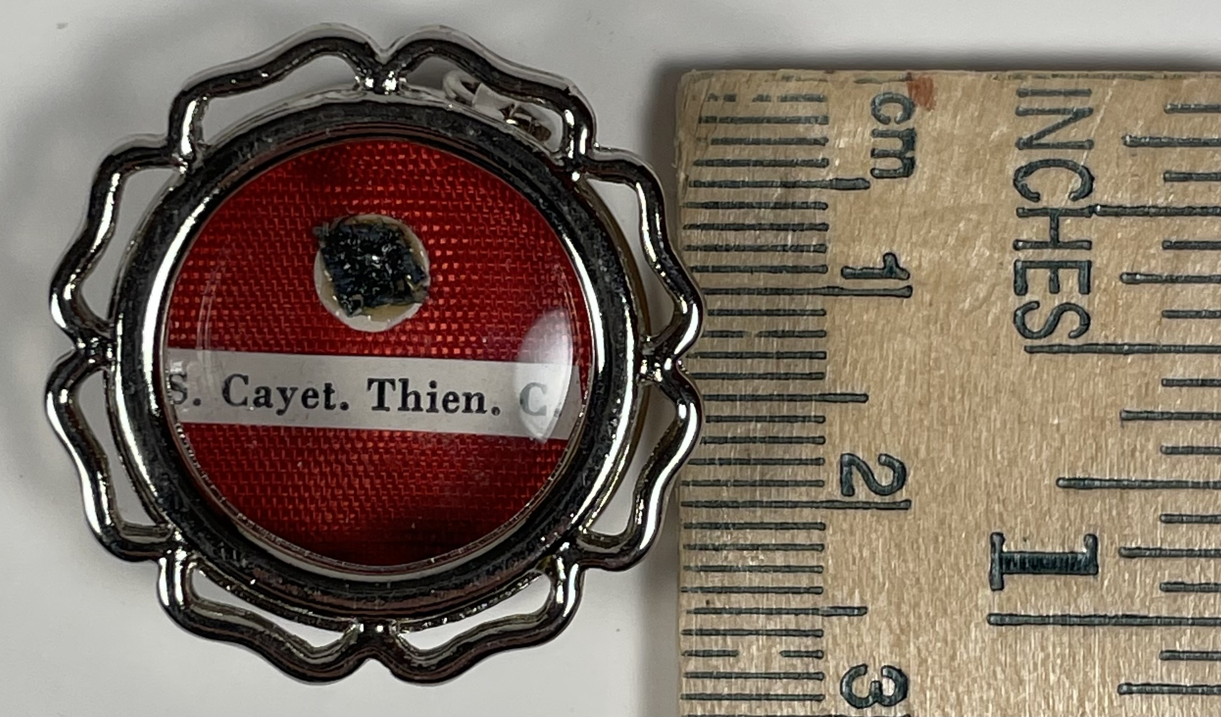 Round glass-fronted white-metal reliquary theca housing the second-class ex indumentis (of the clothes) relics of Saint Cajetan. The relics are affixed to a red silk ground and identified in Latin on typeset cedulae labels as S. Cayet. Thien. C. (Saint Cajetan dei Thiene, Confessor). On the back, under the protective cap, the theca is secured with a seal of red Spanish wax bearing an imprint of a coat of arms of Monsignor Ugo Poletti (†1997), an Italian Cardinal of the Roman Catholic Church who served as Vicar General of Rome (1973–1991). The relic is accompanied by the original matching authentics document issued in 1985 by Msgr. Poletti.