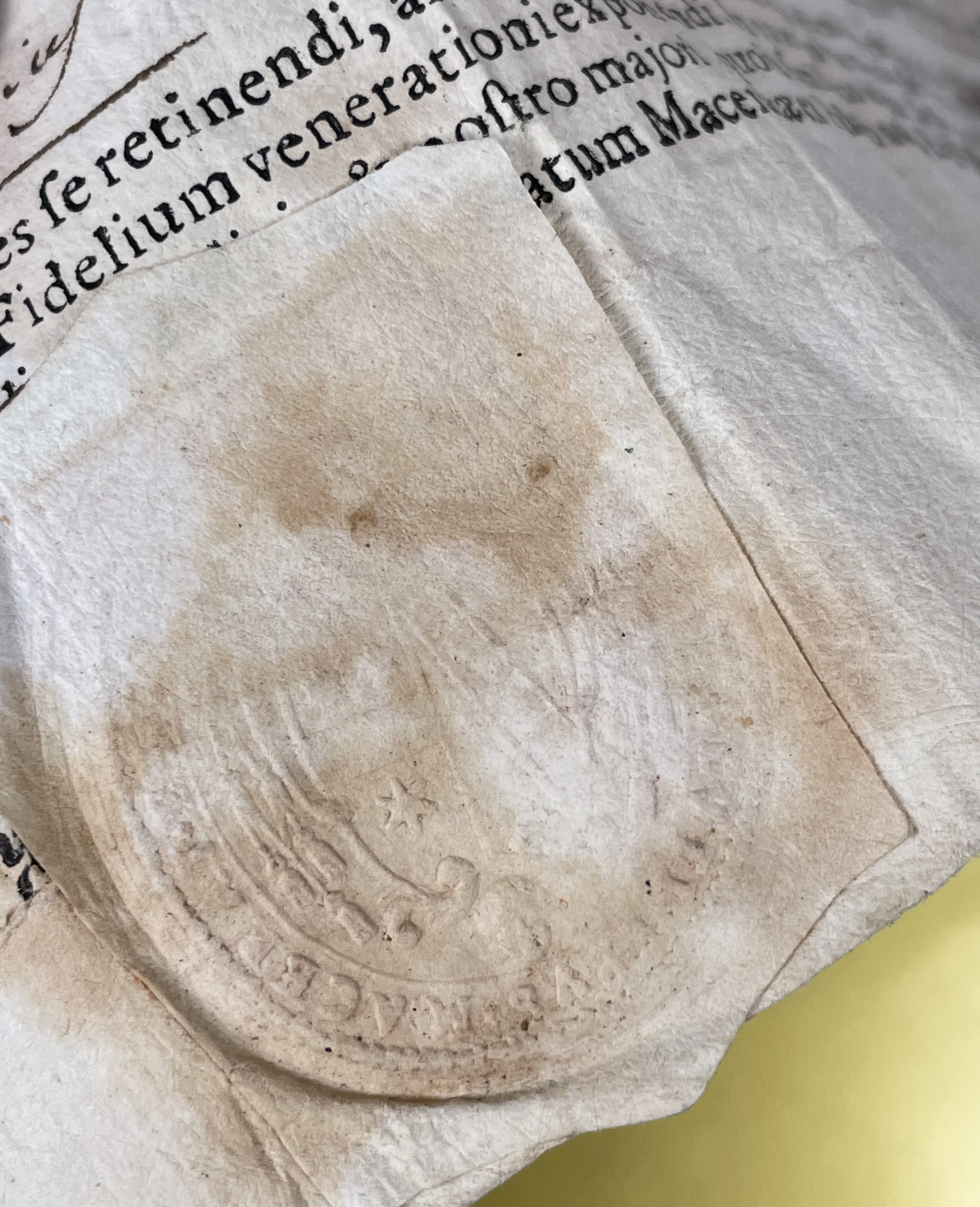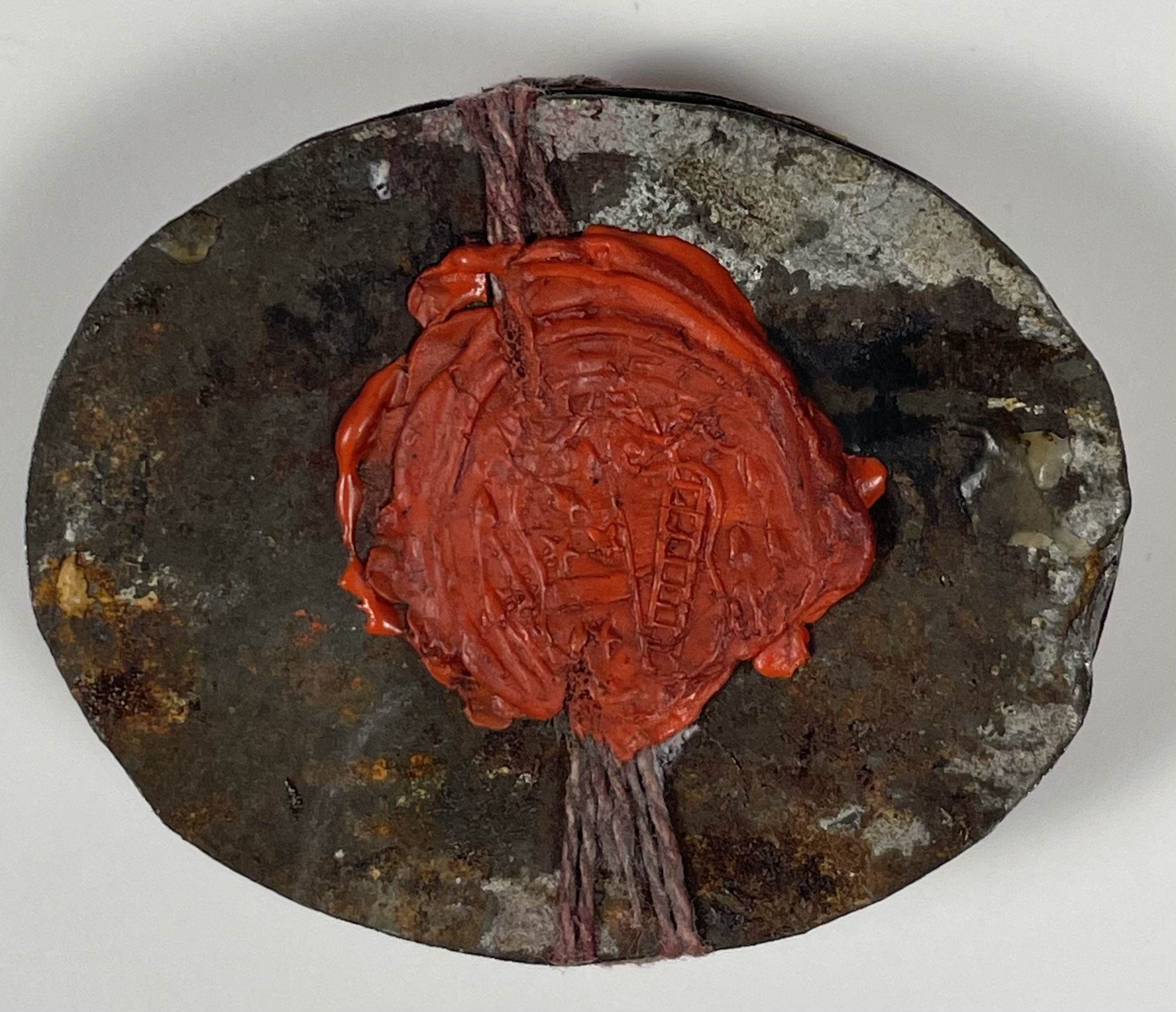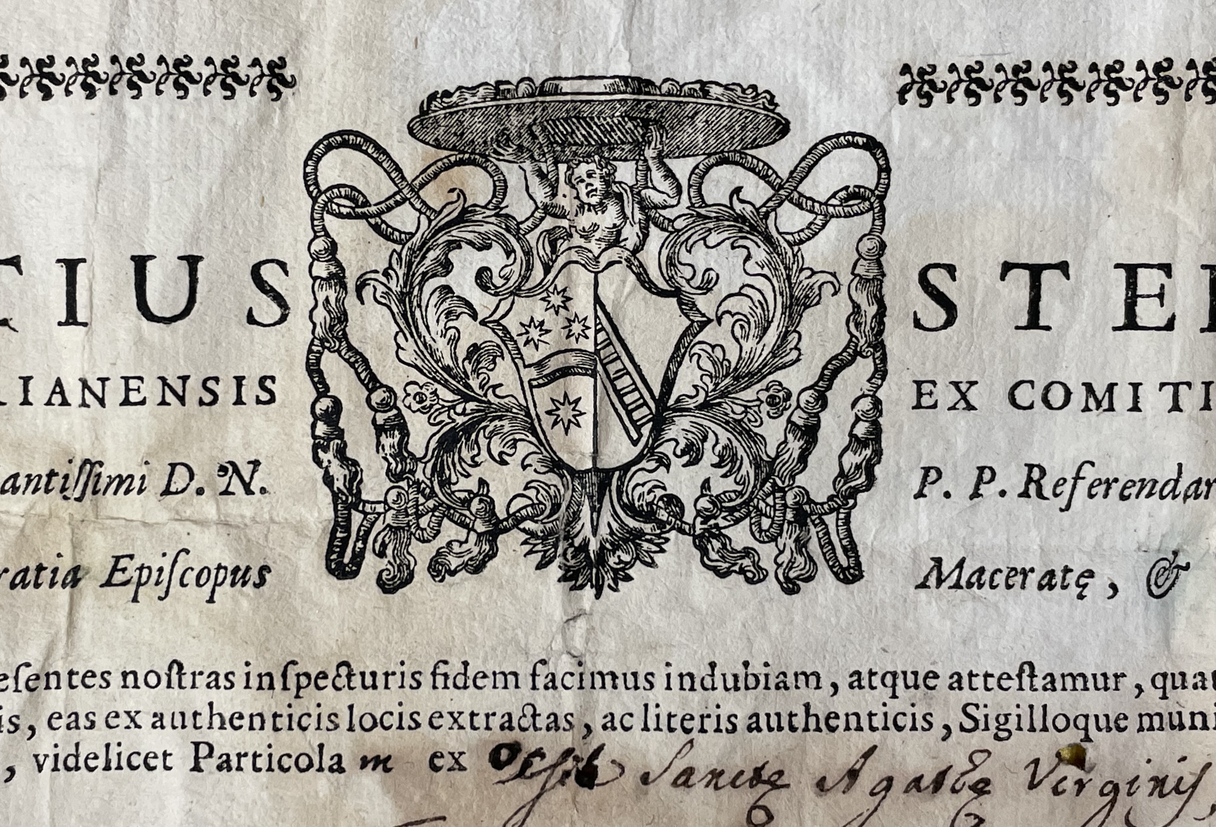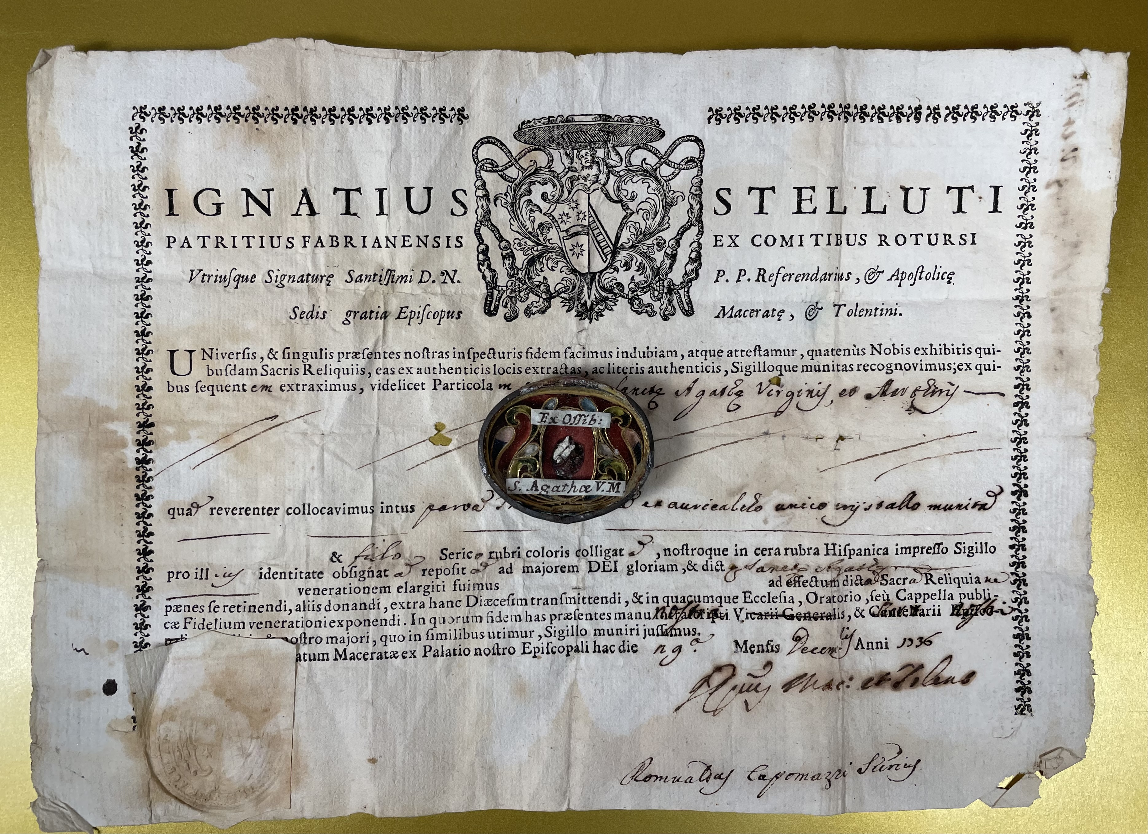 Oval glass-fronted silvered metal reliquary theca housing the first-class ex ossibus (of the bone) relic of Saint Agatha of Sicily. The relic is affixed to a silk ground surrounded by paperolle ornamentation and identified in Latin on a manuscript cedula label as Ex Ossib. // S. Agathae V.M. (Saint Agatha, Virgin and Martyr). On the back, the theca is secured with a perfectly preserved seal of red Spanish wax bearing an imprint of a coat of arms of Fr. Ignazio Stelluti (†1756), Bishop of Macerata e Tolentino (1735-1756). The theca is accompanied by the original matching authentics documents issued and signed by Fr. Stelluti in 1736.