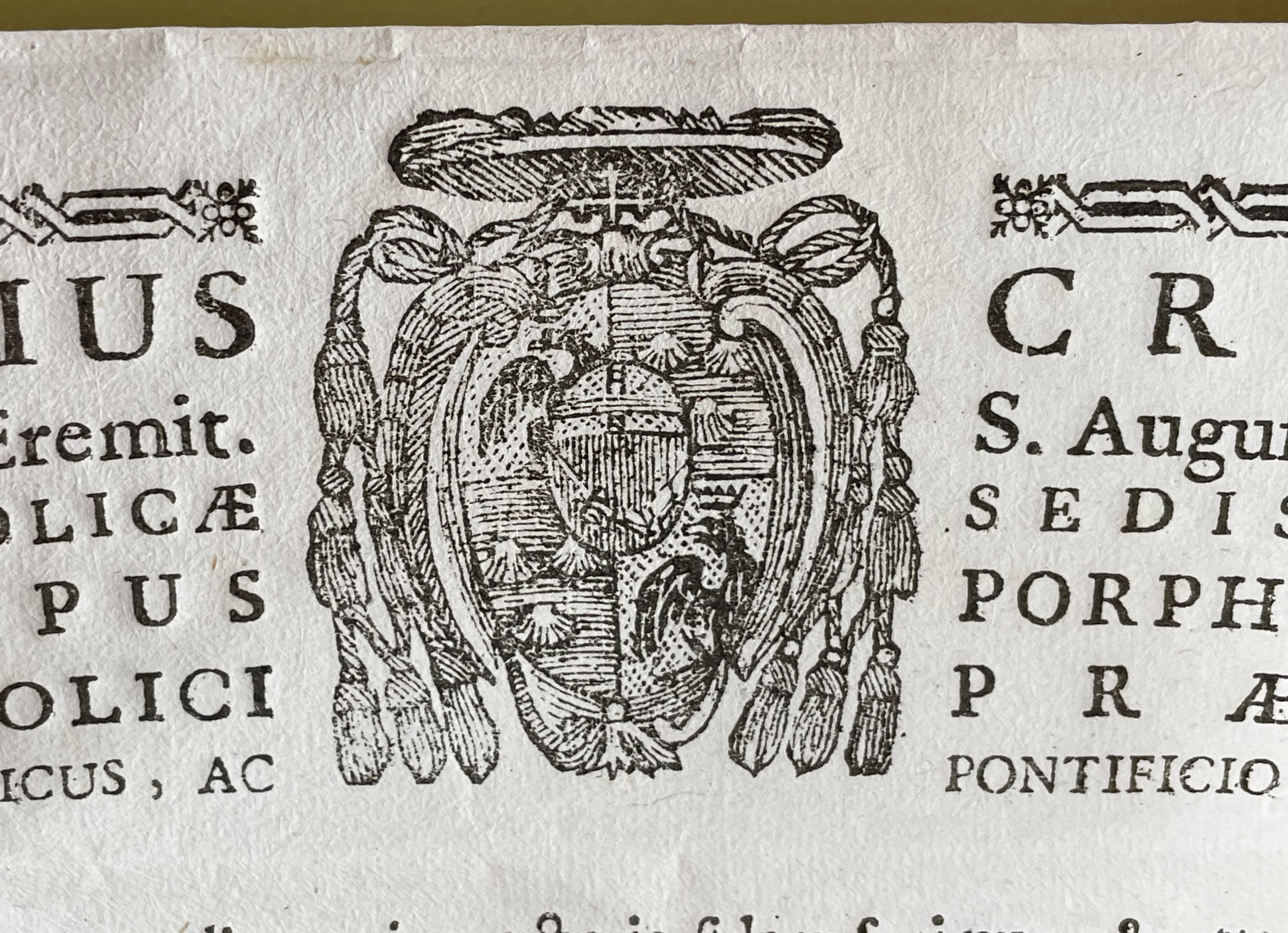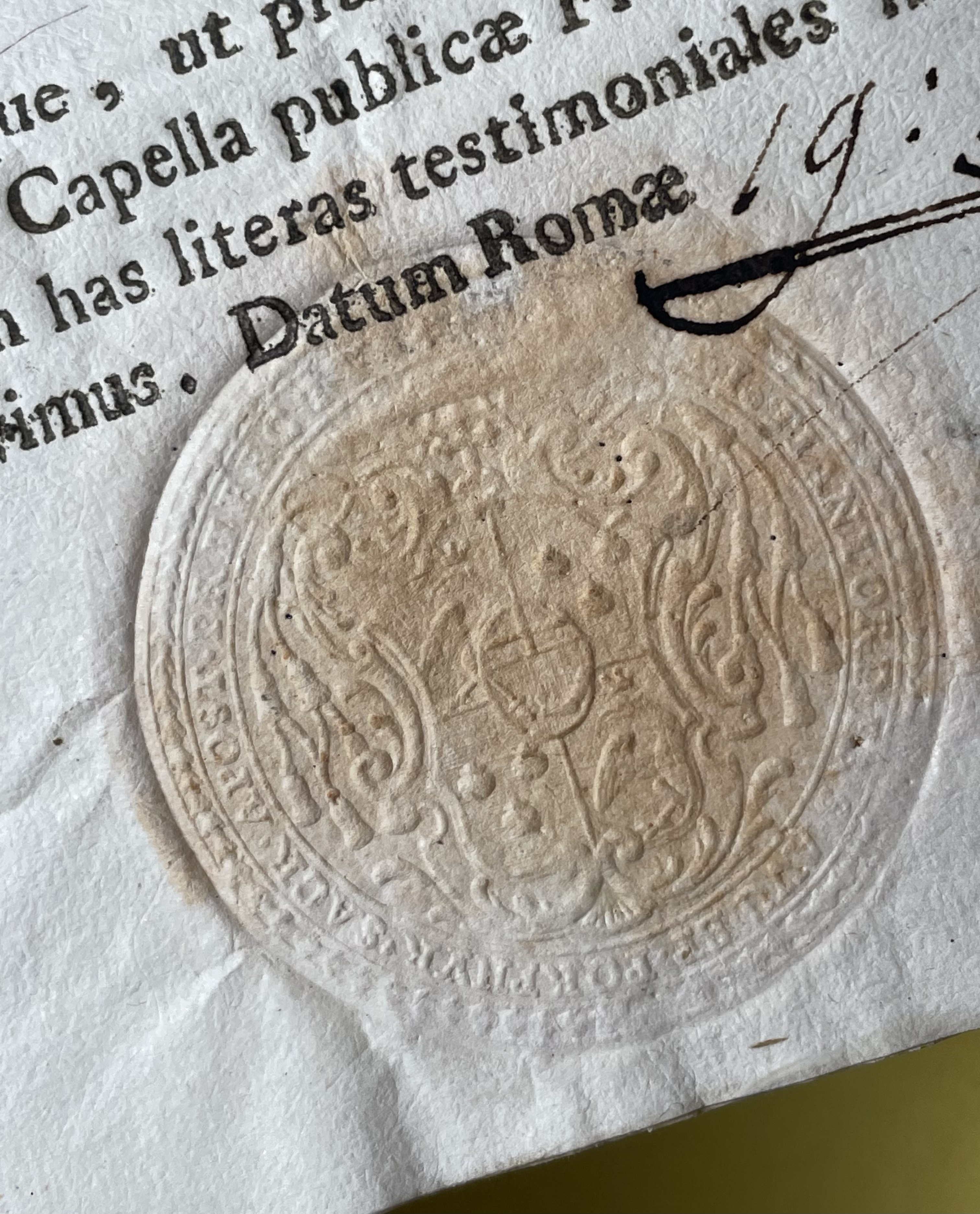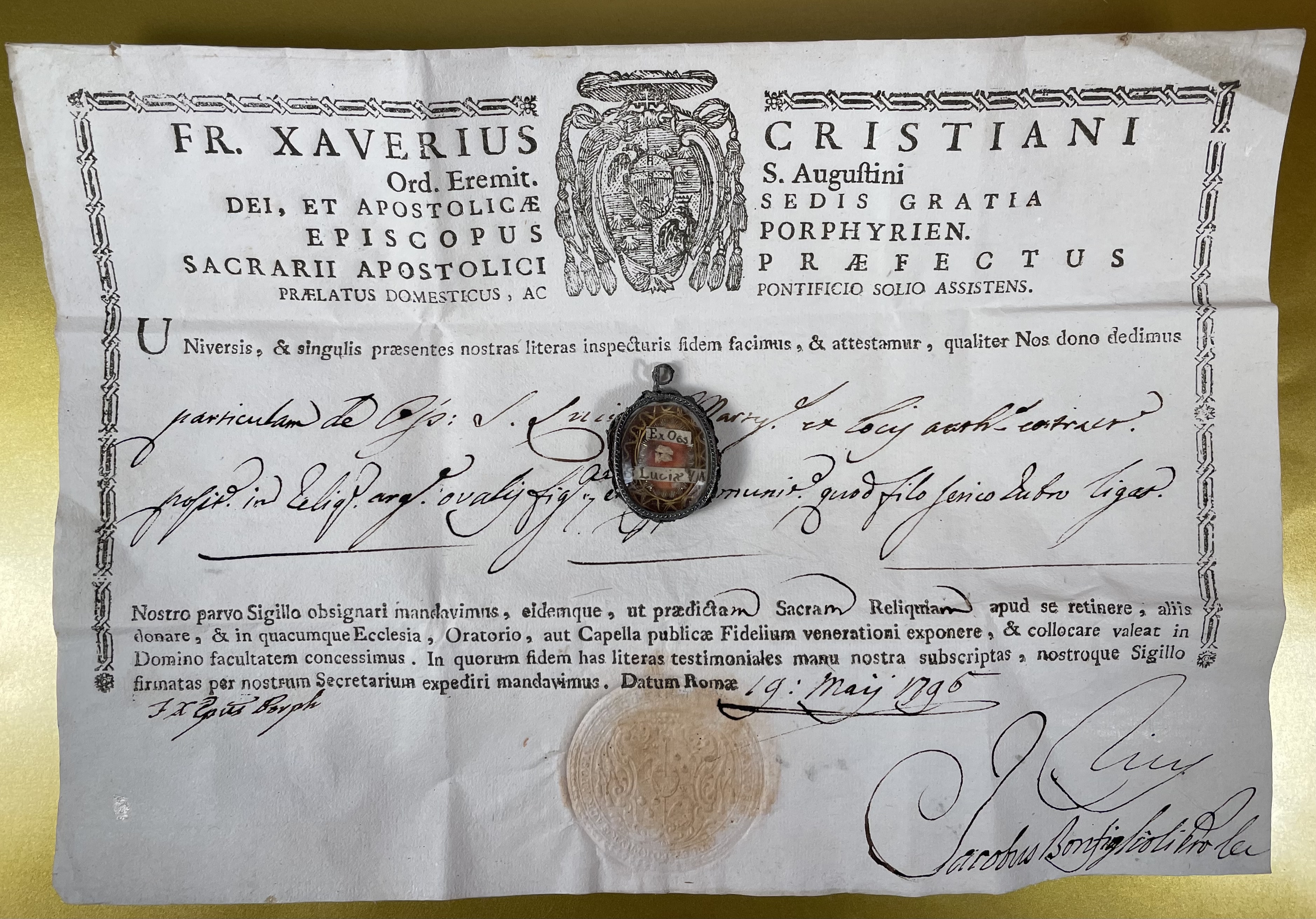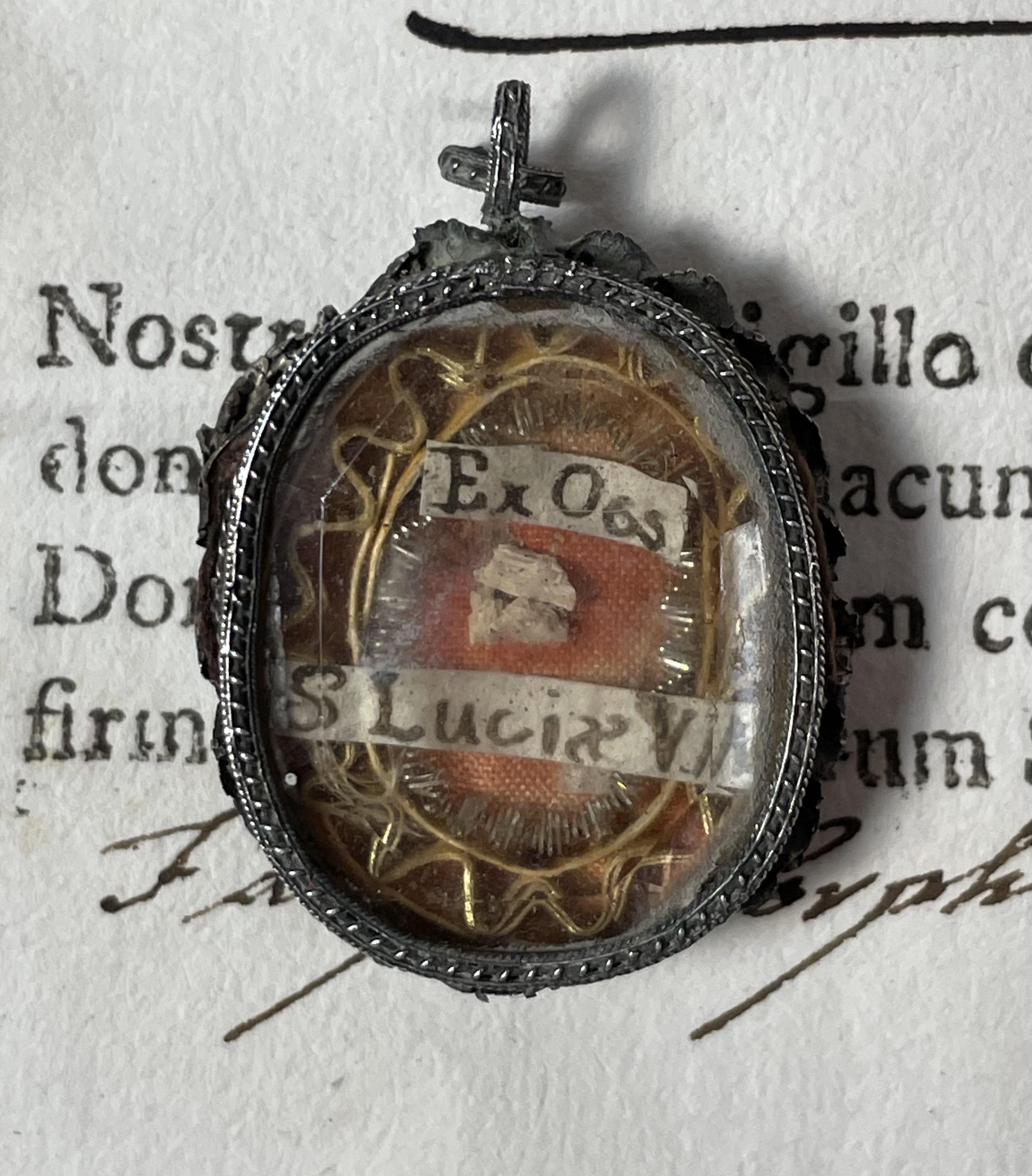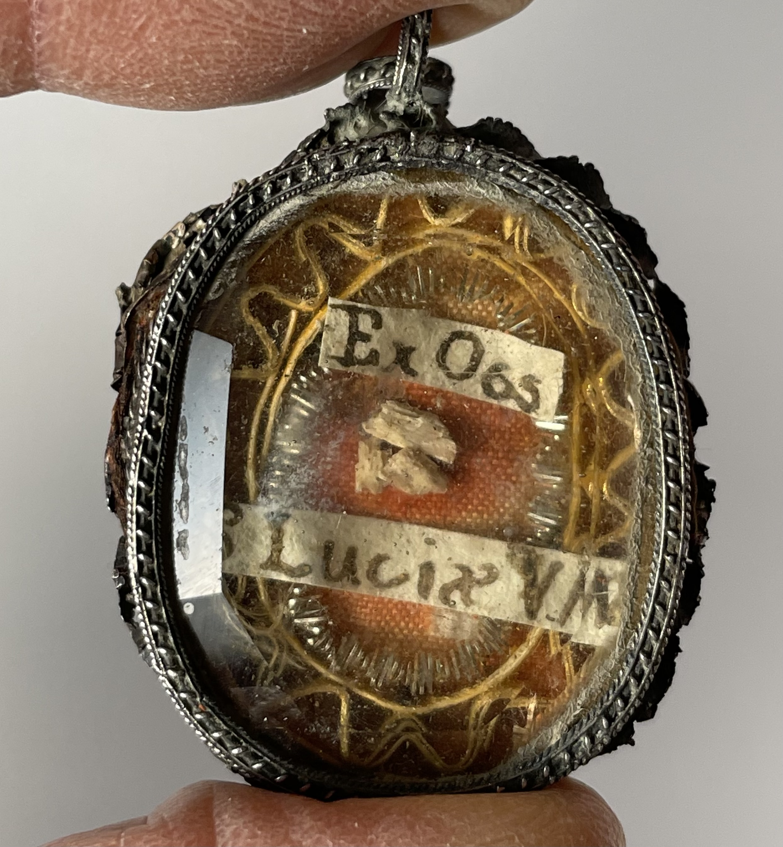 Oval glass-fronted silver pendant reliquary theca housing precious first-class ex ossibus (from the bone) relic of St. Lucia. The relic is affixed to a red silk background decorated with gilt paperolle and silver wire ornamentation and identified on a manuscript cedula label as Ex Oss. // S. Luciae V.M. (of the bone of Saint Lucia, Virgin & Martyr). On the back, the theca is secured with a perfectly-preserved seal of red Spanish wax bearing an imprint of a coat of arms of Fr. Francesco Saverio Cristiani O.E.S.A. († 1800), Titular Bishop of Porphyreon in a capacity of the Sacristan of the Apostolic Palace during the pontificate of Pope Pius VI (p. 1775-1799). The relic is accompanied by an original matching authentics document issued and signed by Fr. Cristiani in 1795.