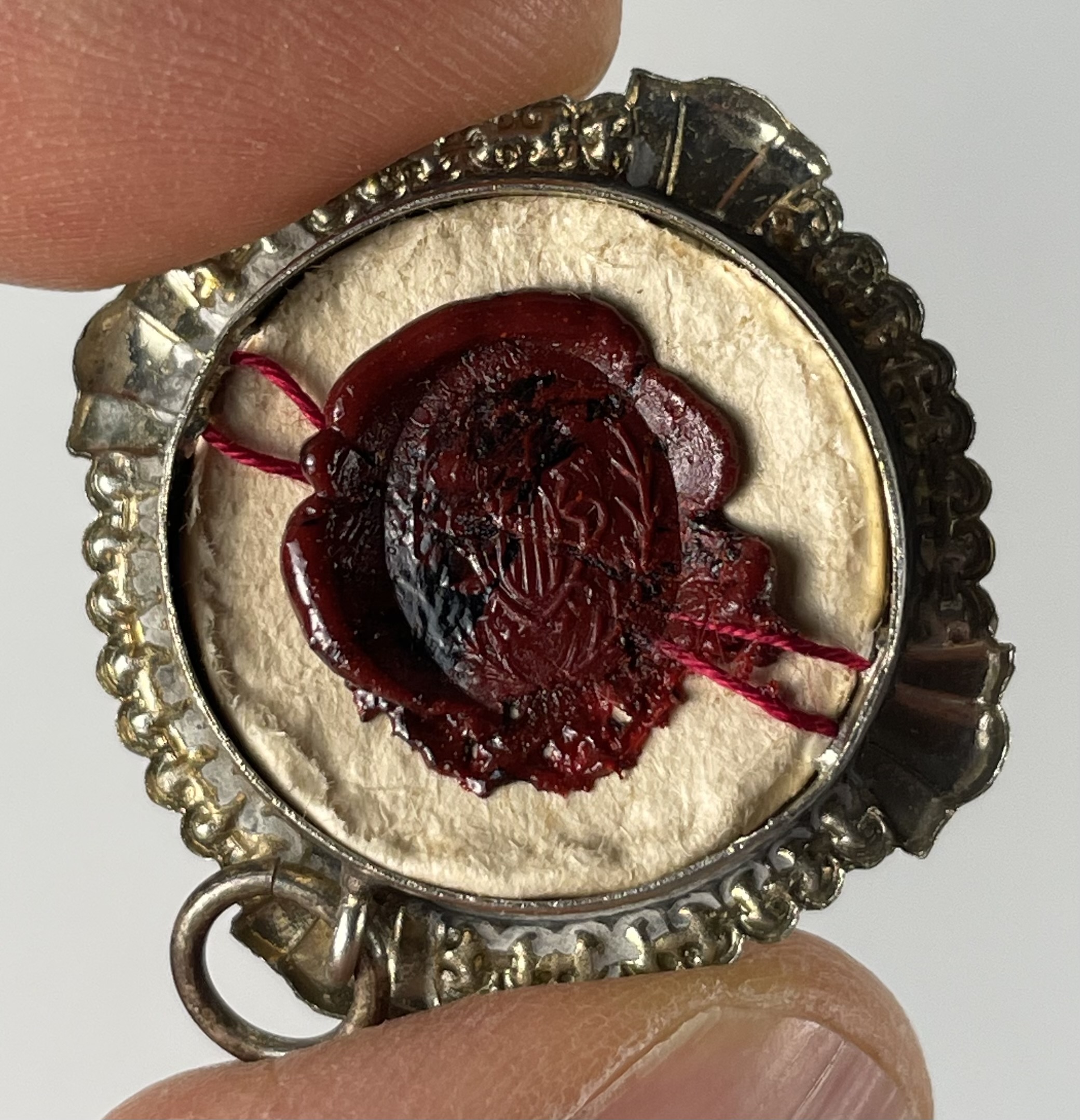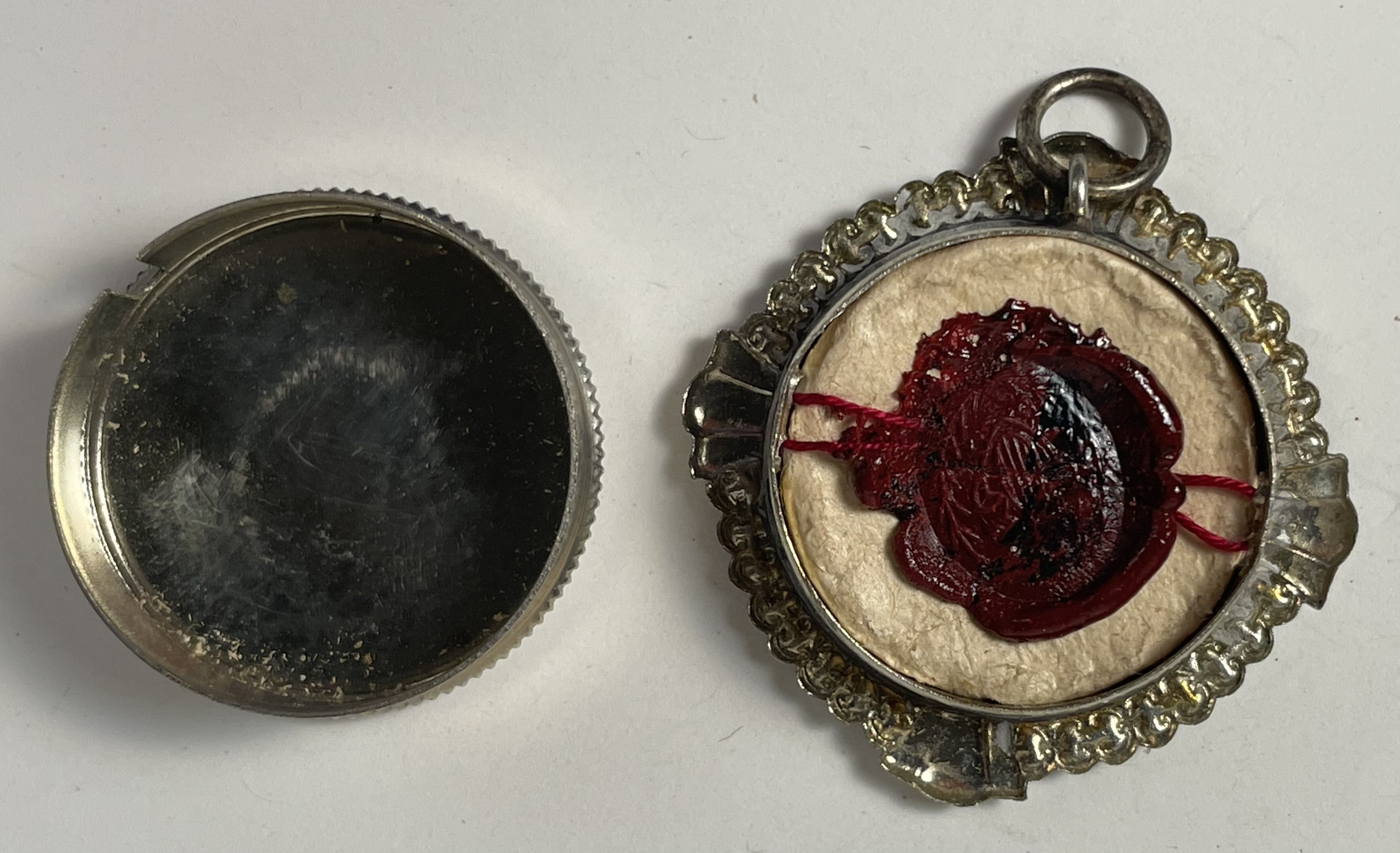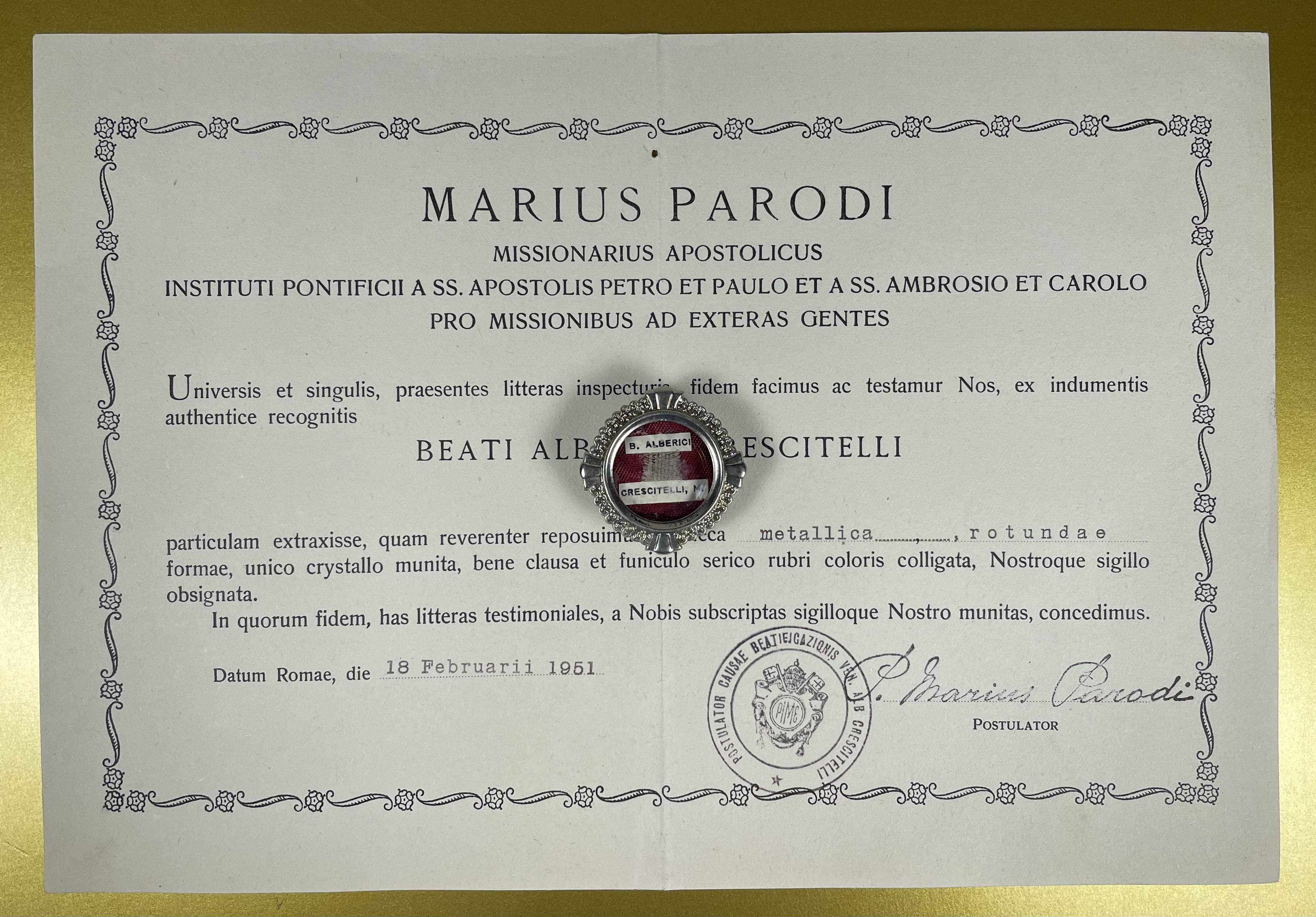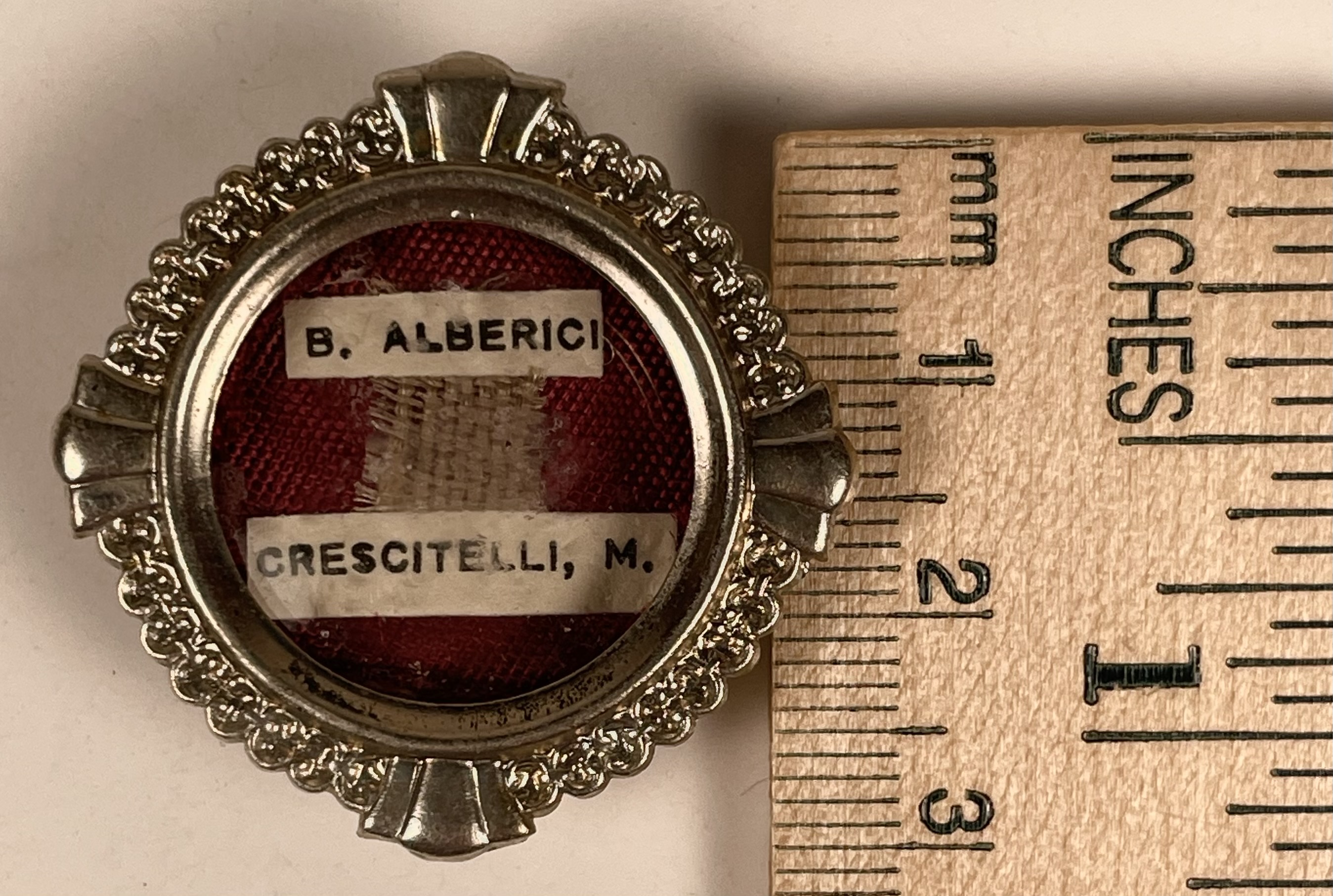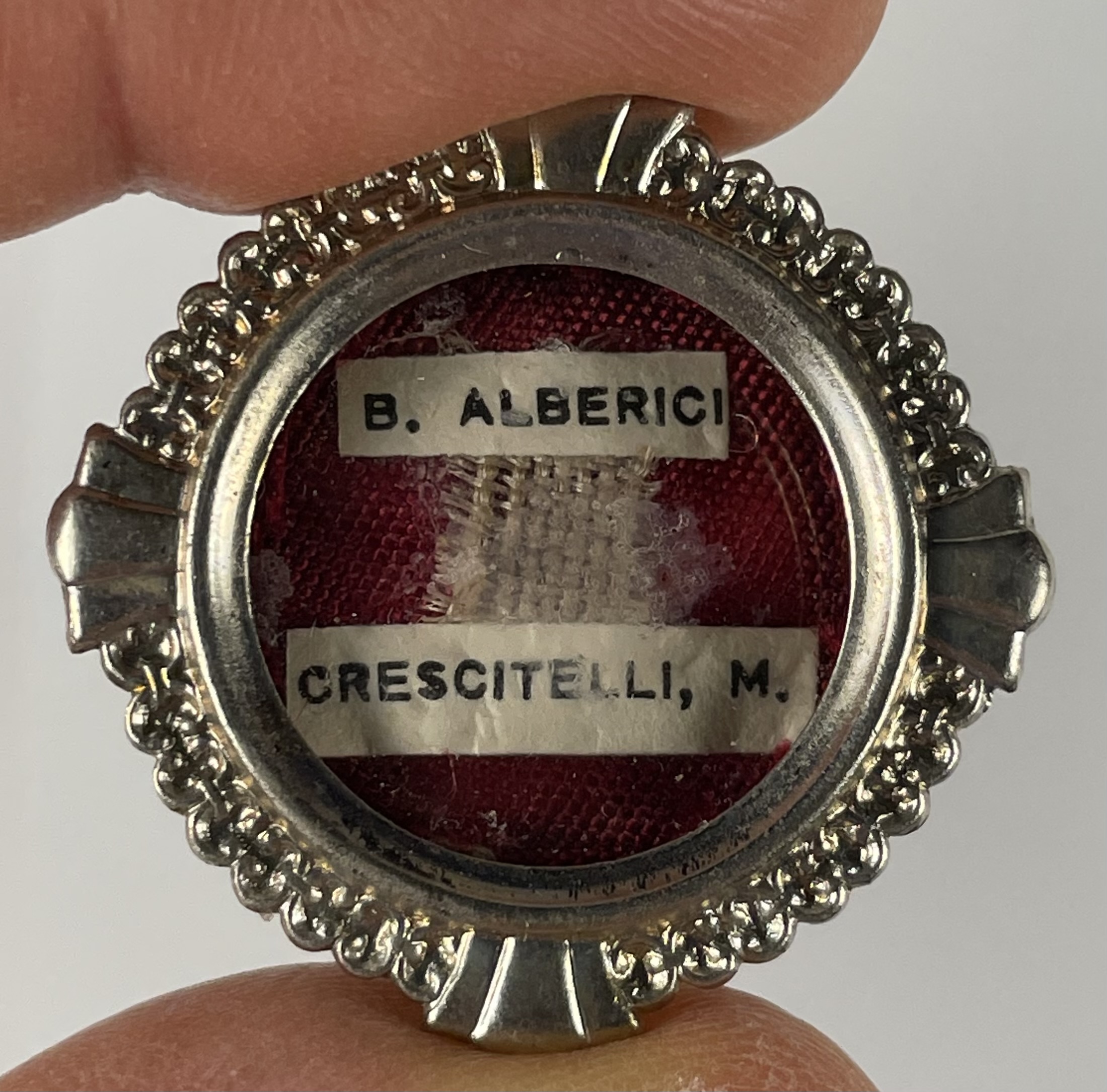Round glass-fronted white-metal reliquary theca housing the second-class ex indumentis  (of the clothes) pre-canonization relic of Saint Alberico CrescitelliA relic is affixed to a red silk ground and identified in Latin on a typeset cedula label as B. Alberici / Crescitelli, M. ( the Blessed Alberico Crescitelli).  On the back, under the protective cap, the theca is secured by a seal of red Spanish wax bearing an imprint of a coat of arms of the Apostolic Missionary of the Pontifical Institute for Foreign Missions. The relic is accompanied by the original matching authentics document issued by the Institute on 18 February 1951.